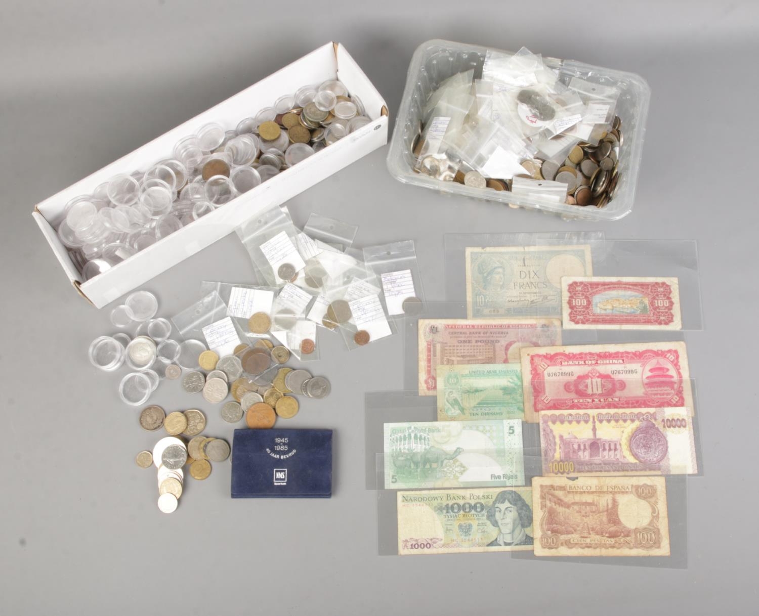 A good collection of international coins and banknotes to include French, Chinese, German and Nigerian examples.