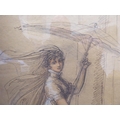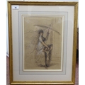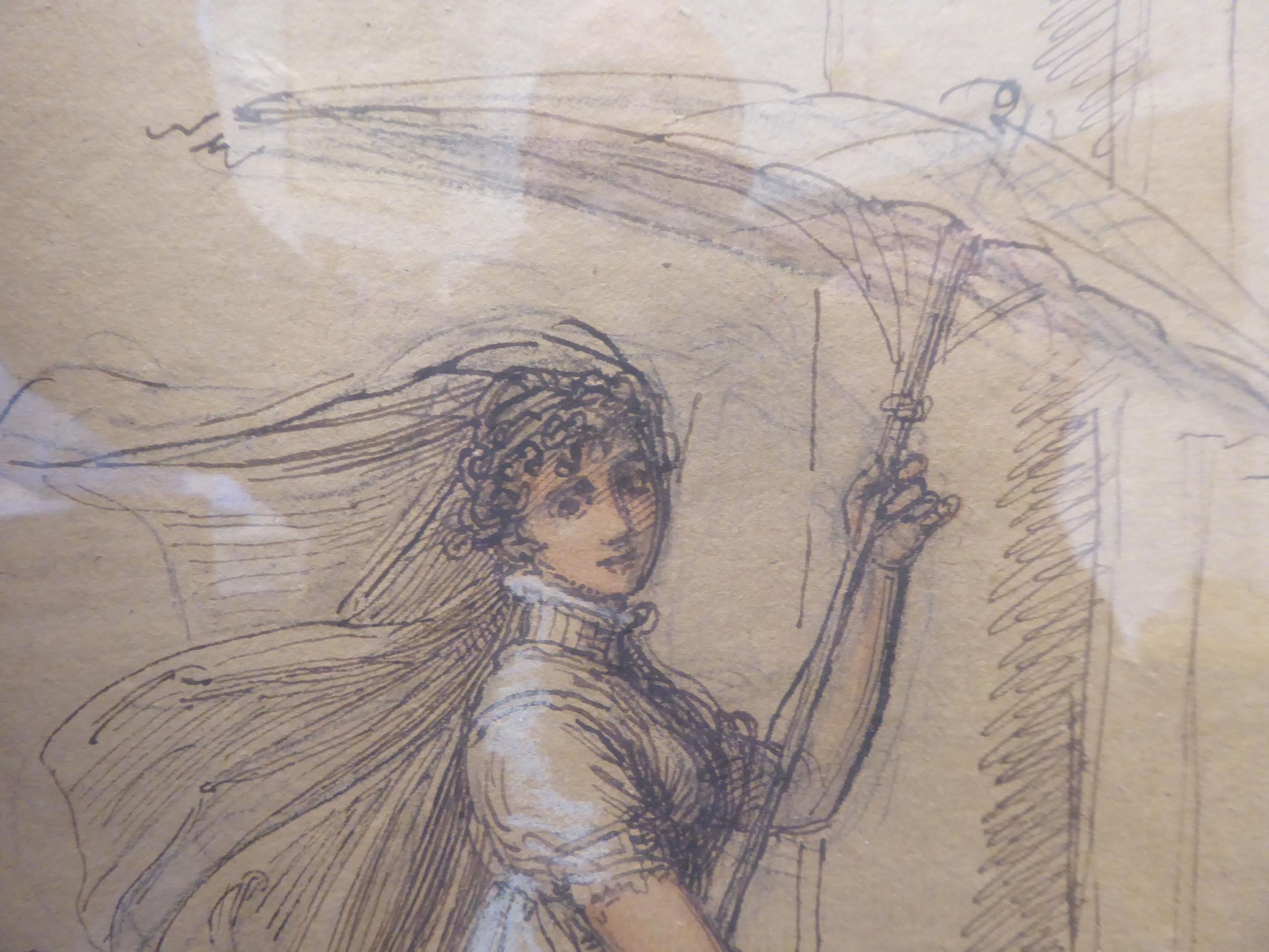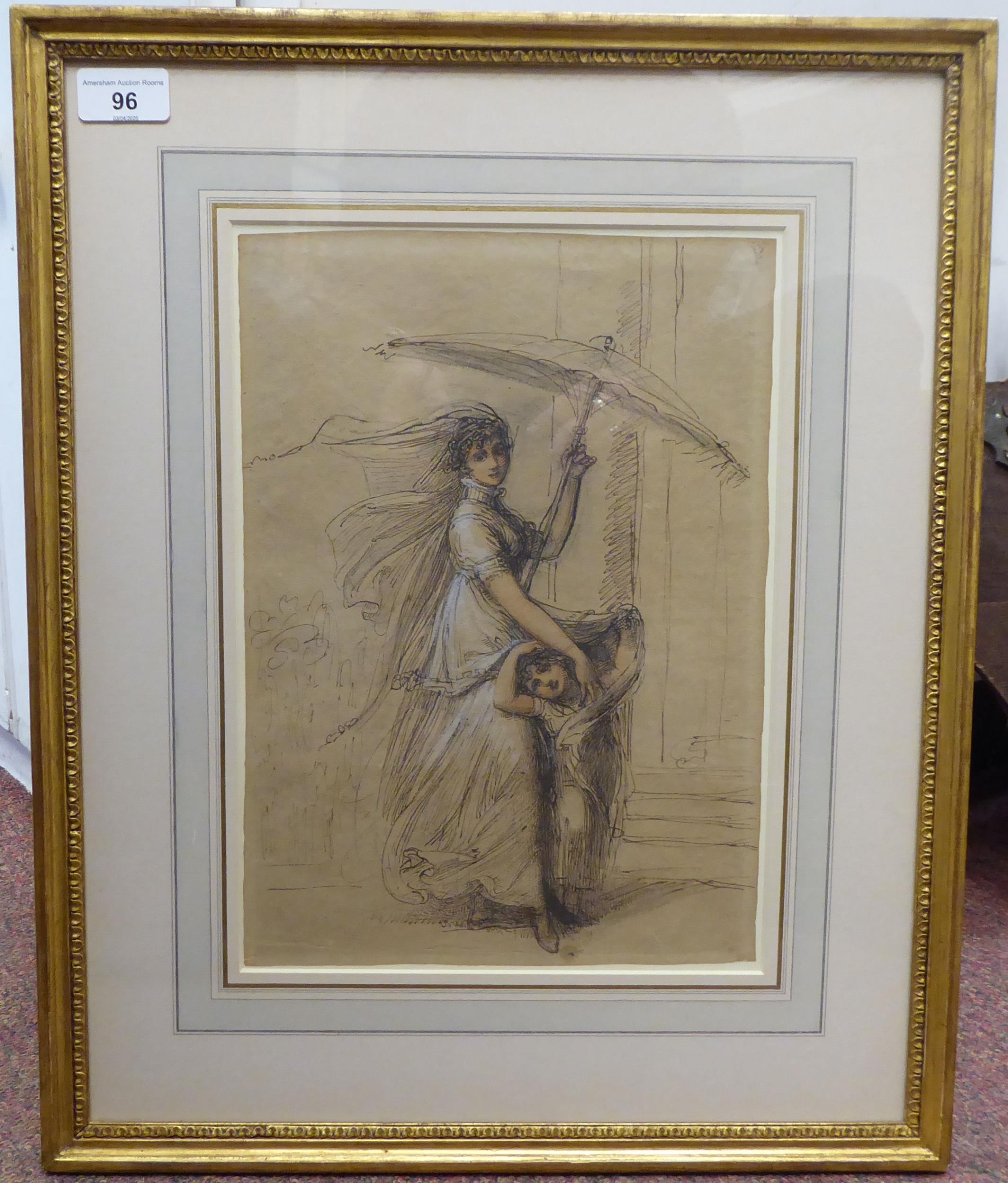 A girl with a parasol and a young child watercolour sketch 12" x 13" framed