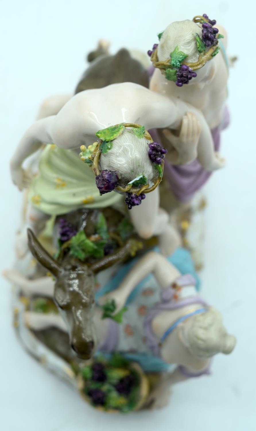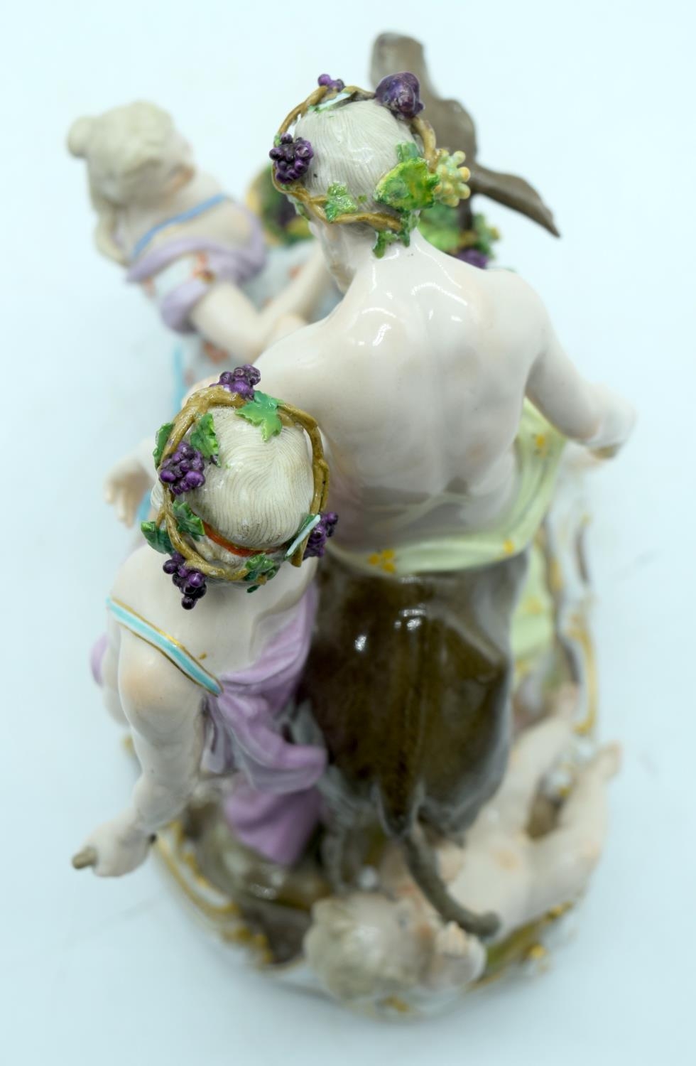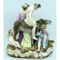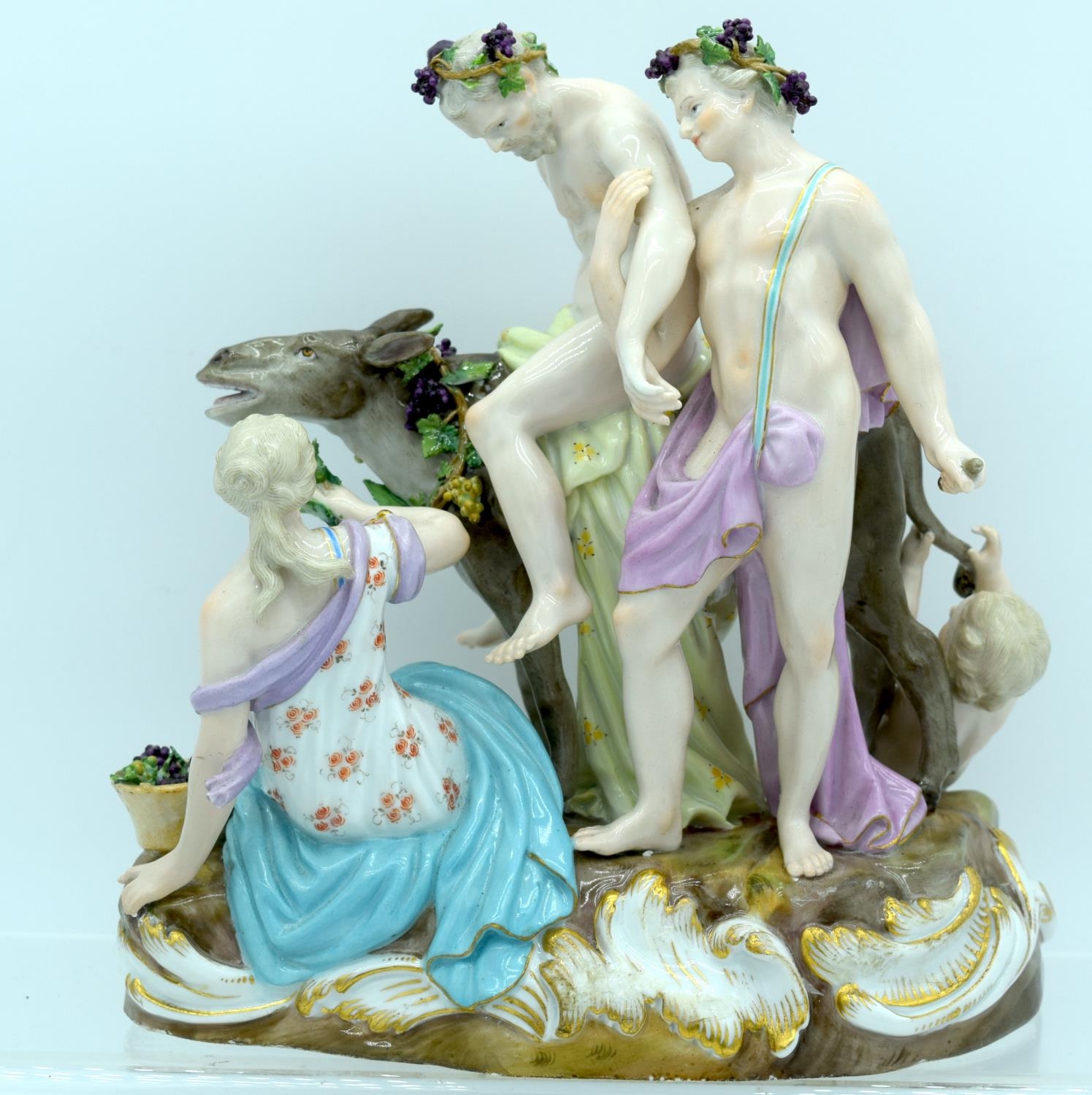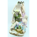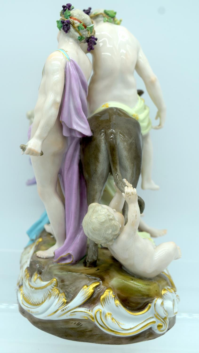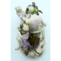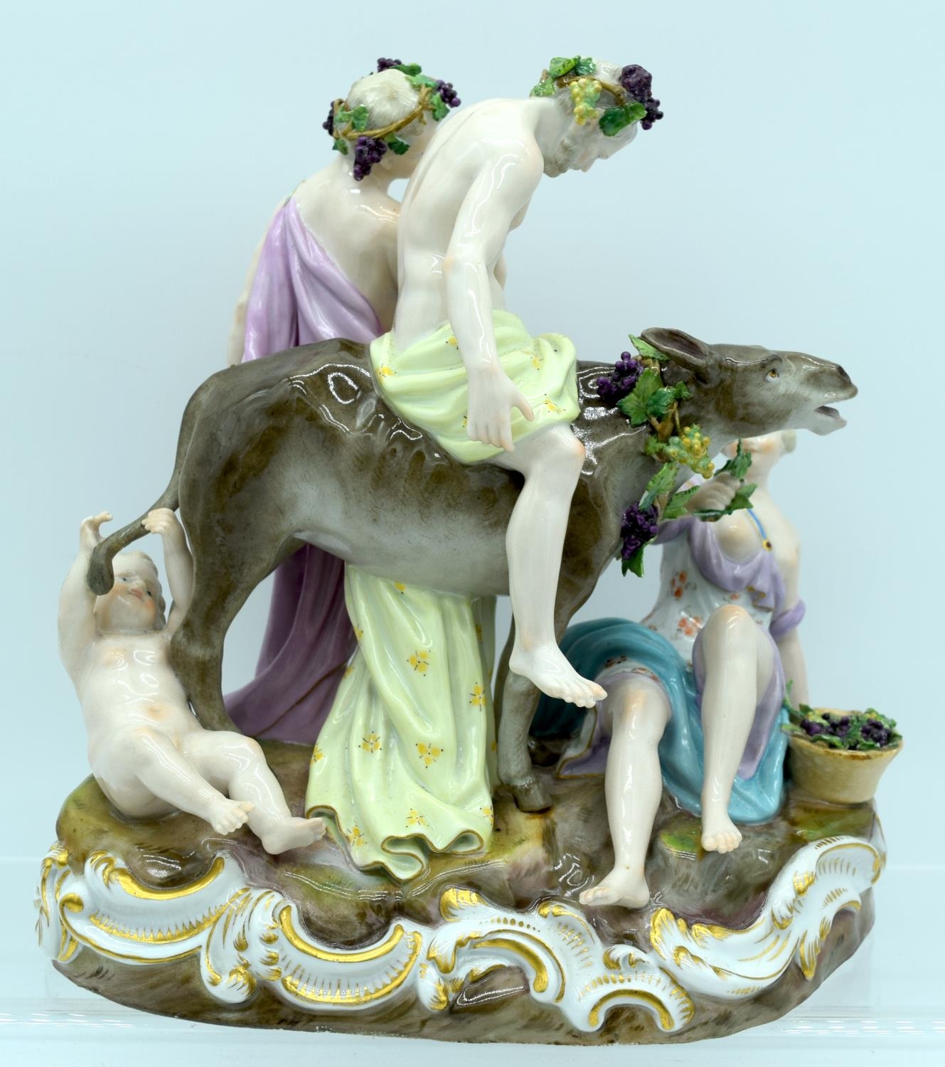 A 19TH CENTURY GERMAN MEISSEN ERNST TEICHERT PORCELAIN FIGURE OF A DRUNKEN SILENUS modelled riding upon a howling donkey. 18 cm x 23 cm.