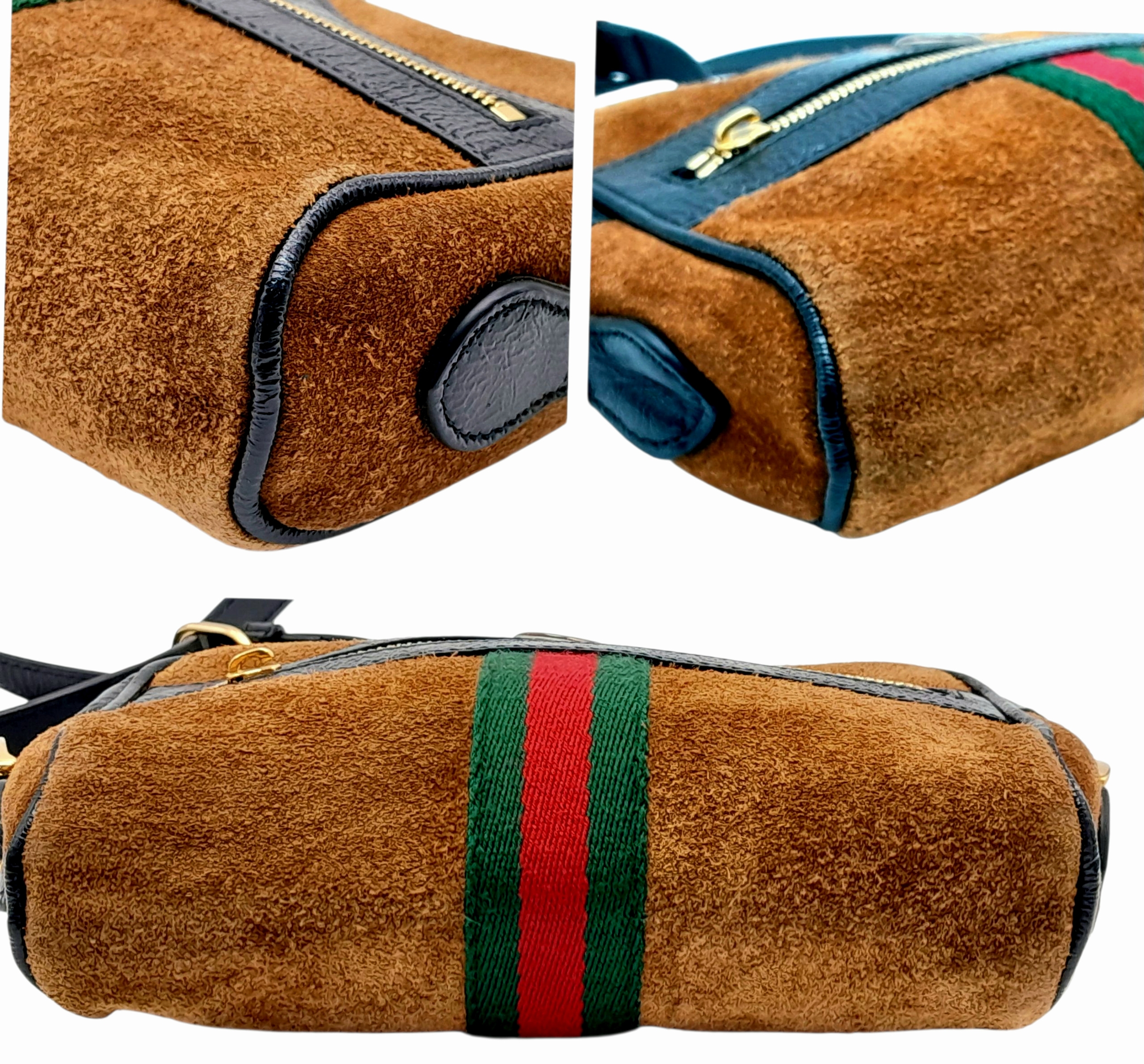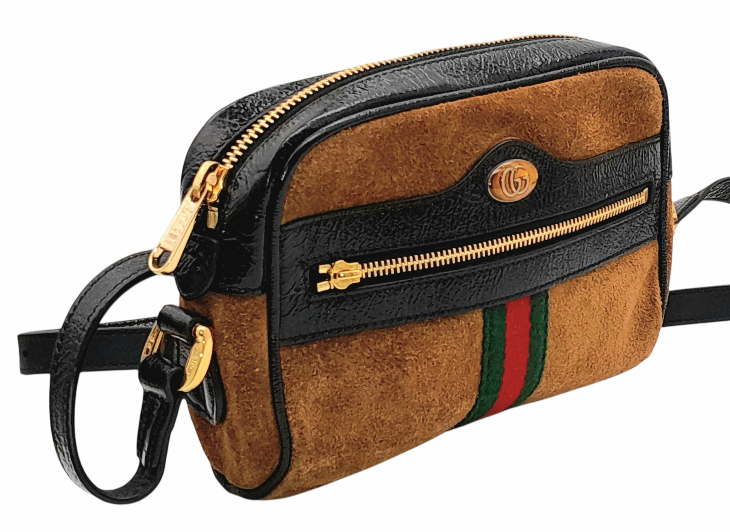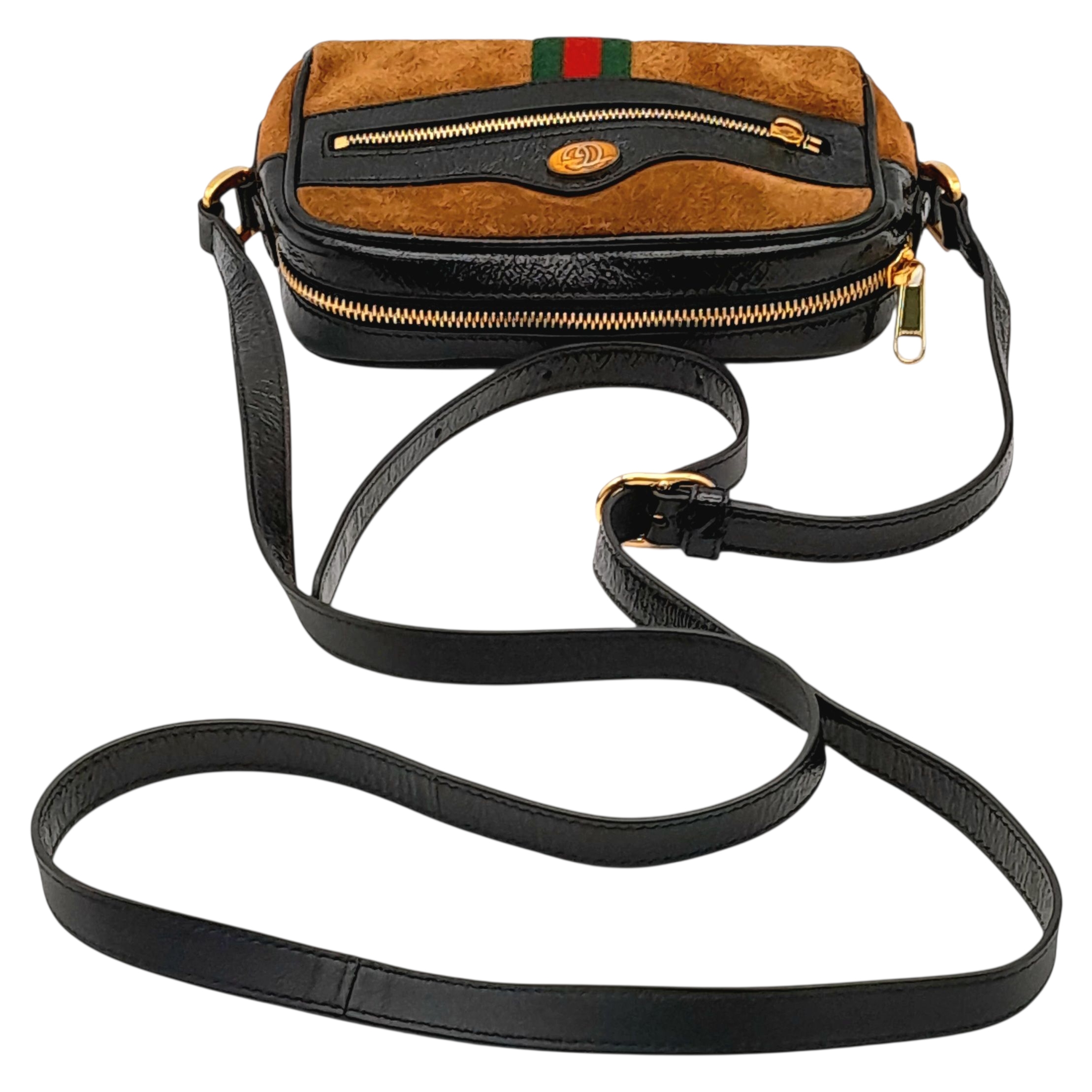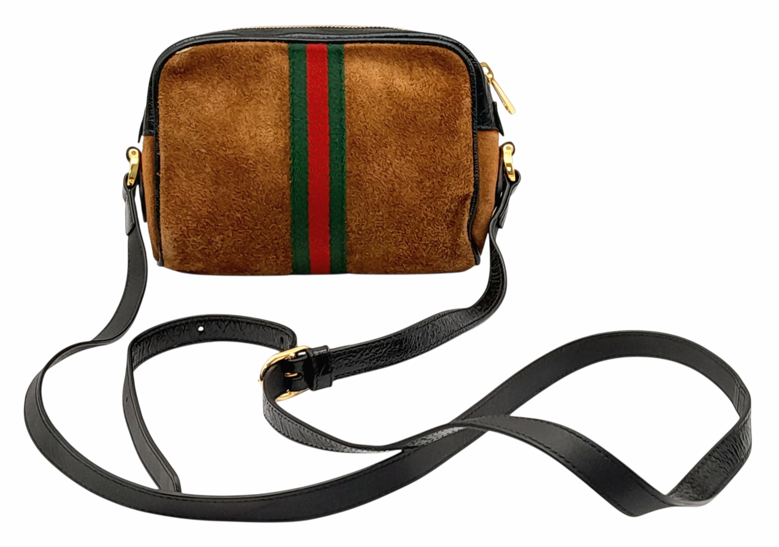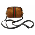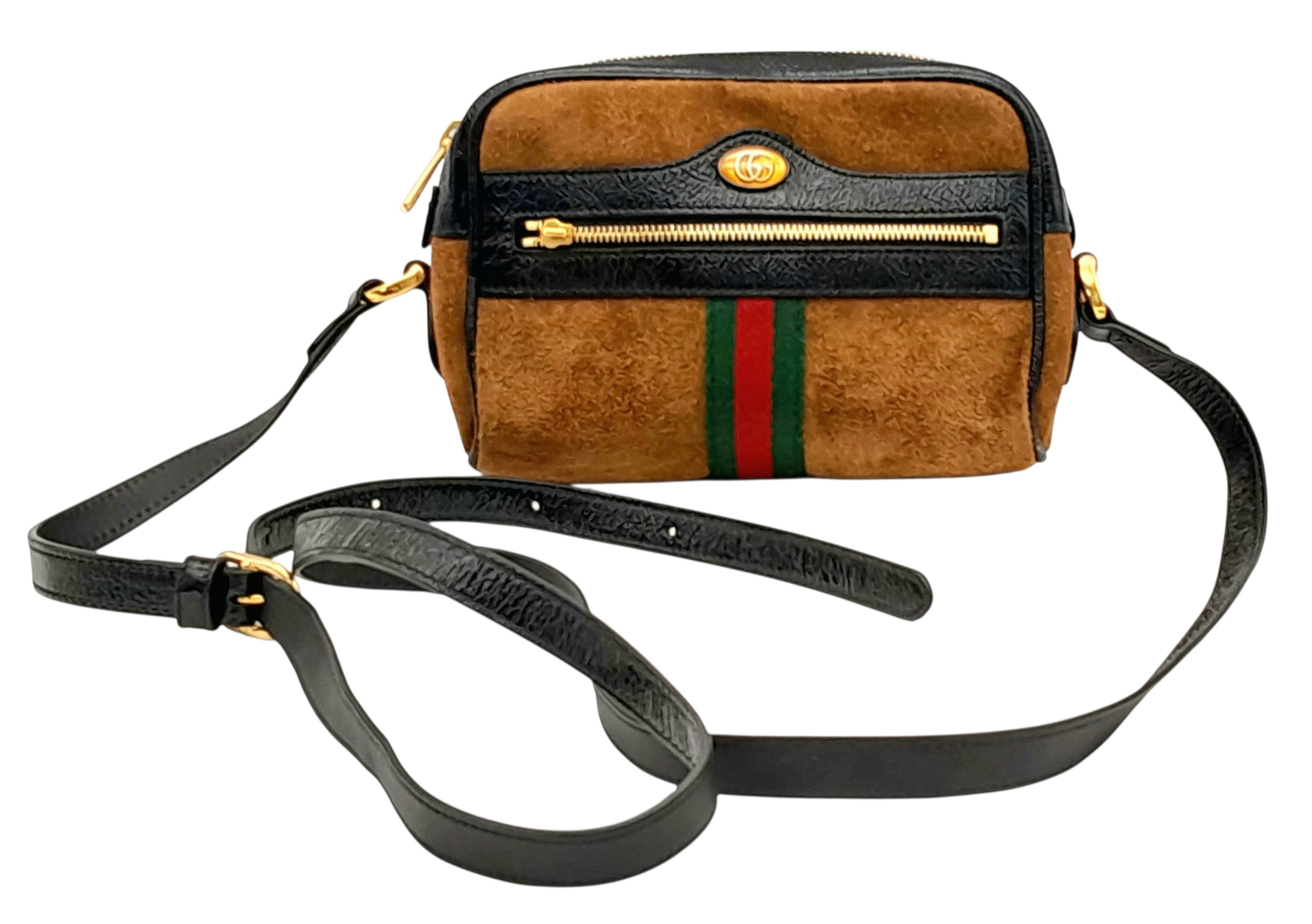 A Gucci Brown Ophidia Small Shoulder Bag. Brown suede with gold-tone hardware, a front zipped pocket, an zipped top closure and adjustable shoulder strap. Black textile interior with one main compartment. Approx. 18cm height x 14cm length x 4.5cm width. Please see photos or request a condition report. Ref: JJ561.