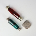 A 19th century style double ended glass scent bottle, the silver coloured terminals marked 'Thompson S Maw & Sons' to interior of cover, with faceted cranberry glass body, 15cm long, with a further green example and a white metal shaped box, stamped to interior, 50gms (3)