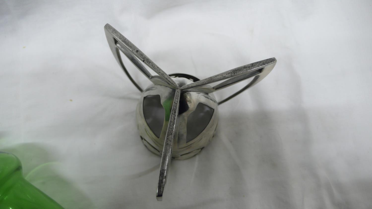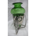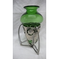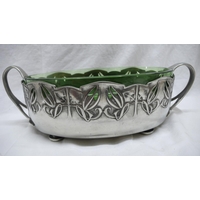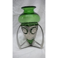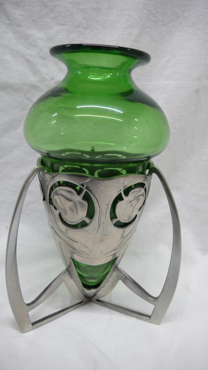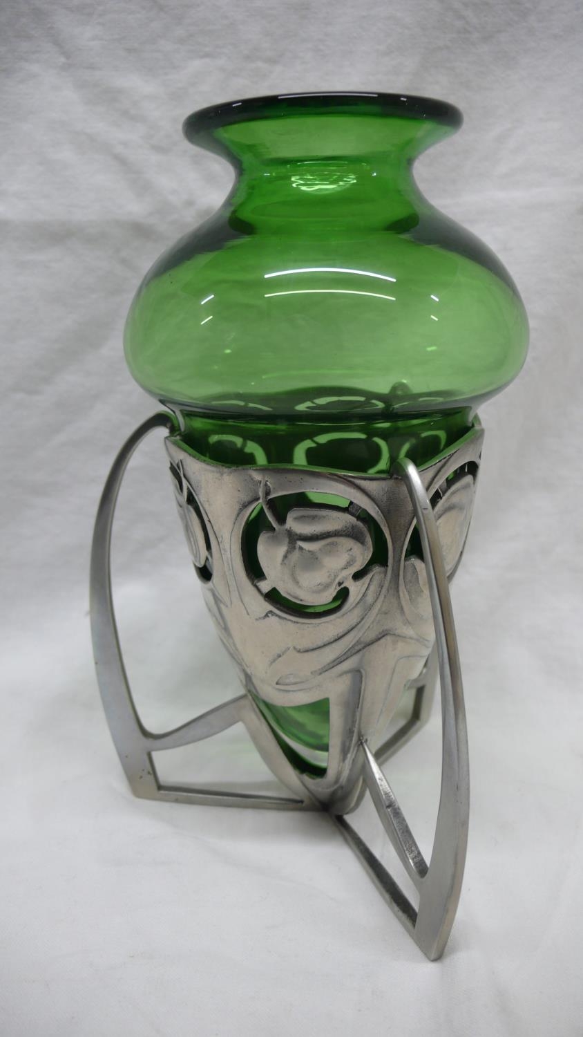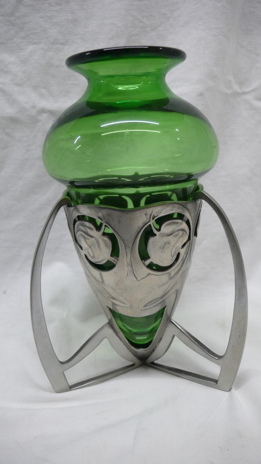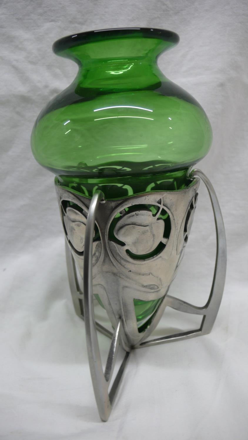 Archibald Knox for Liberty & Co Pewter vase with open bomb shaped fin feet, foliate decoration, green glass insert by James Powell and Sons, Whitefriars, circa. 1902-1905, Ht. 19 cms (unmarked) (featured page 103 Archibald Knox by Stephen A Martin)