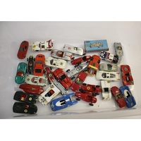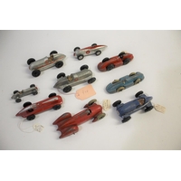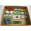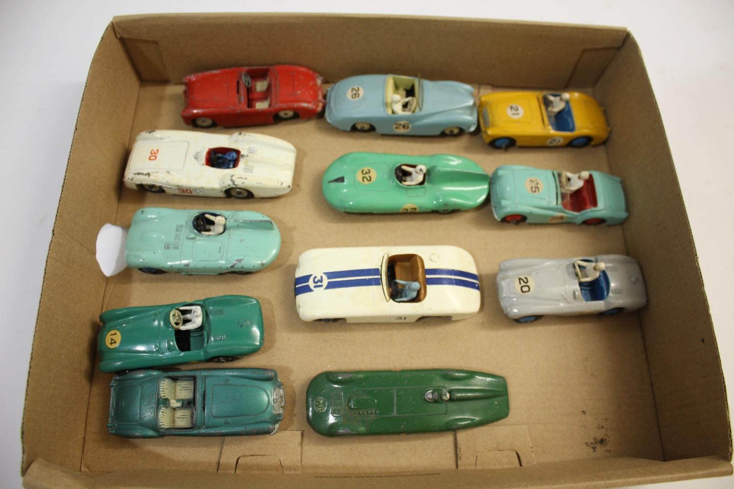 DINKY & CORGI TOYS 12 racing and sports car models, including Dinky 109 Austin Healey in yellow with blue hubs and interior, 111 Triumph TR2 in turquoise with red interior and hubs, 107 Sunbeam Alpine in pale blue with cream interior and beige hubs, and French Dinky 506 Ferrari 275 GTB in red. (12)