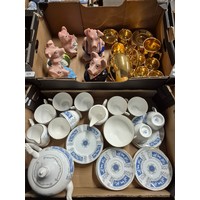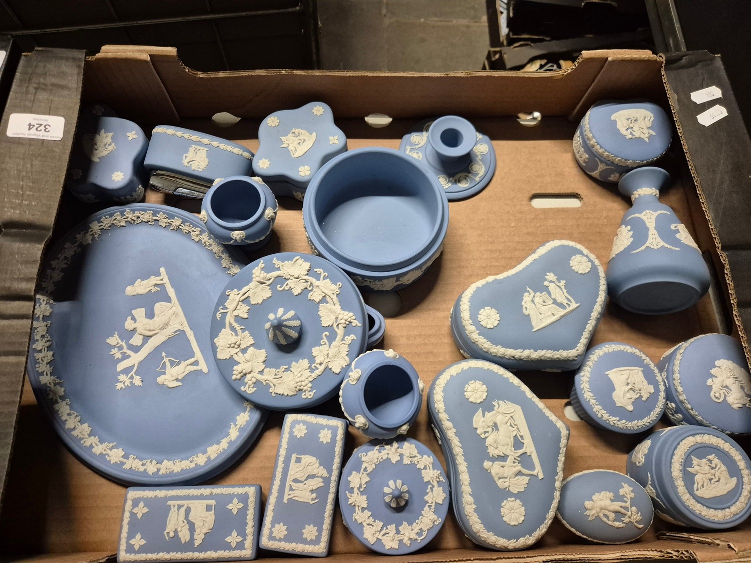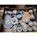 A box of assorted blue Wedgwood Jasperware.