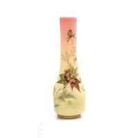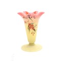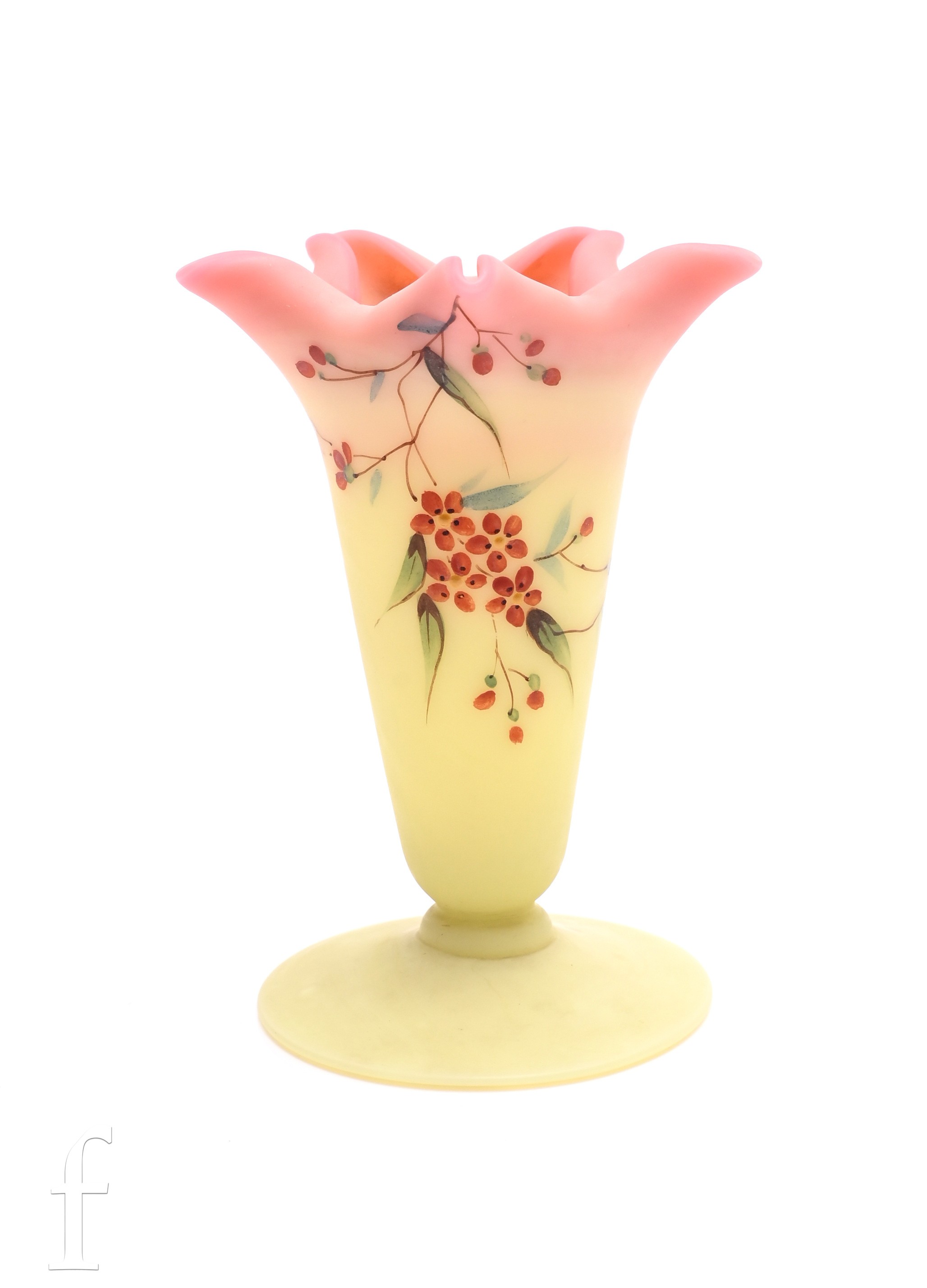 A late 19th Century Thomas Webb & Sons Queen's Burmese ware glass vase of flared form with folded and pulled rim on round foot, decorated with enamelled floral design, acid mark to base, height 10cm.