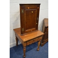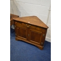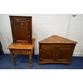 A REPRODUCTION OAK TWO DOOR CORNER CUPBOARD, width 95cm x depth 47cm x height 76cm and a matching smaller hanging corner cupboard, together with a hardwood lamp table with a single drawer, 60cm x depth 58cm x height 64cm (key) (3)