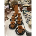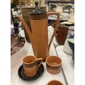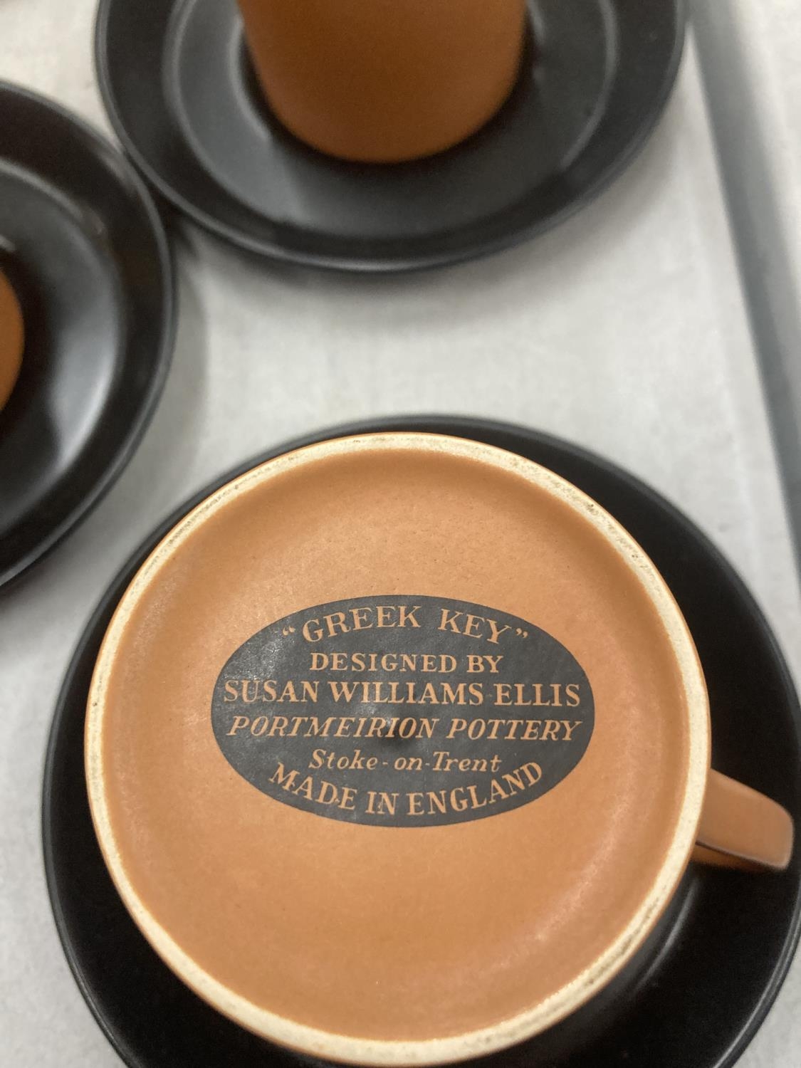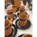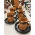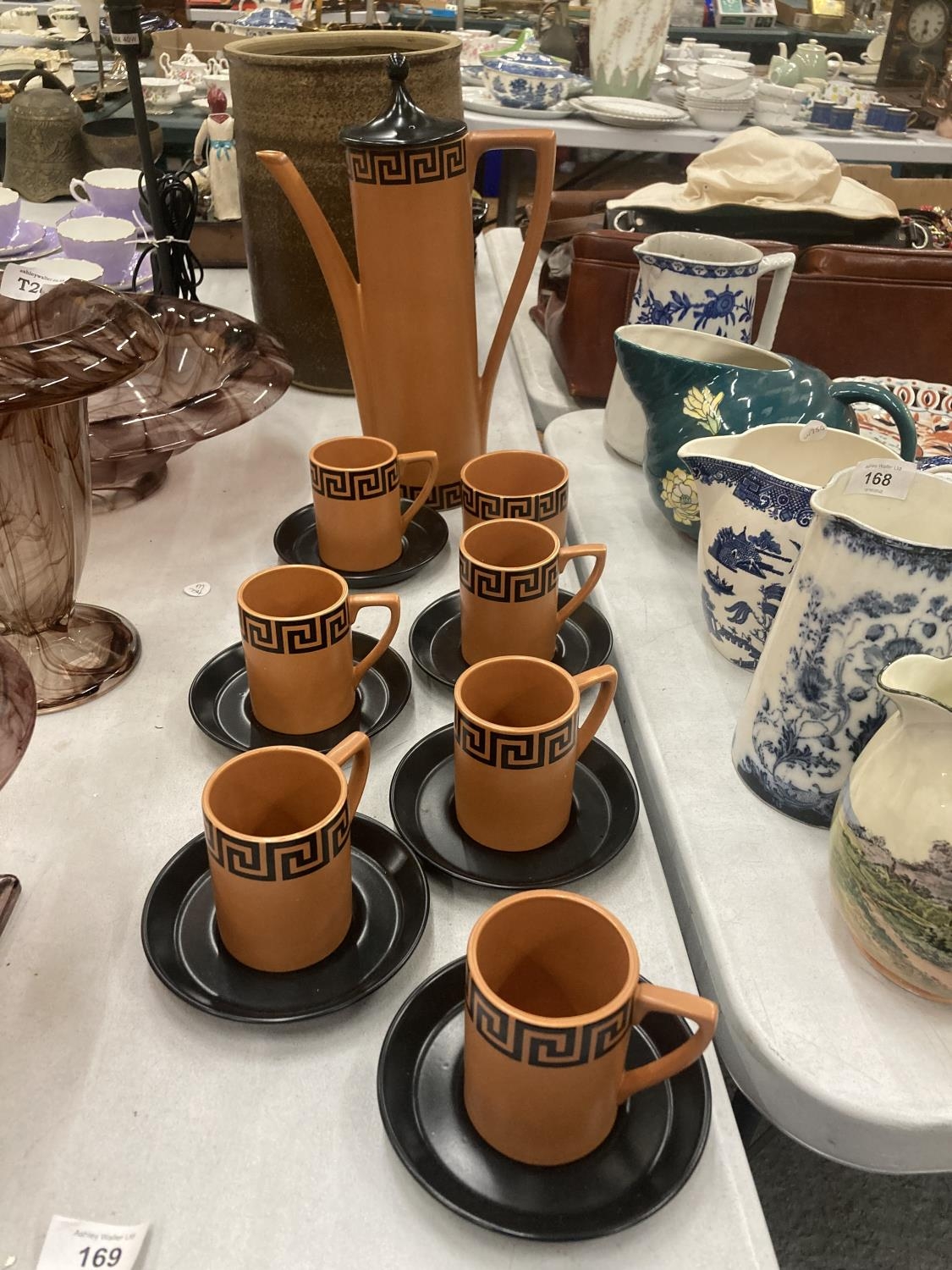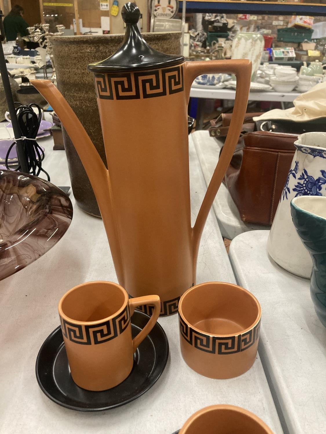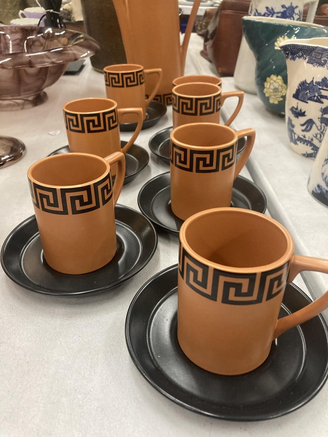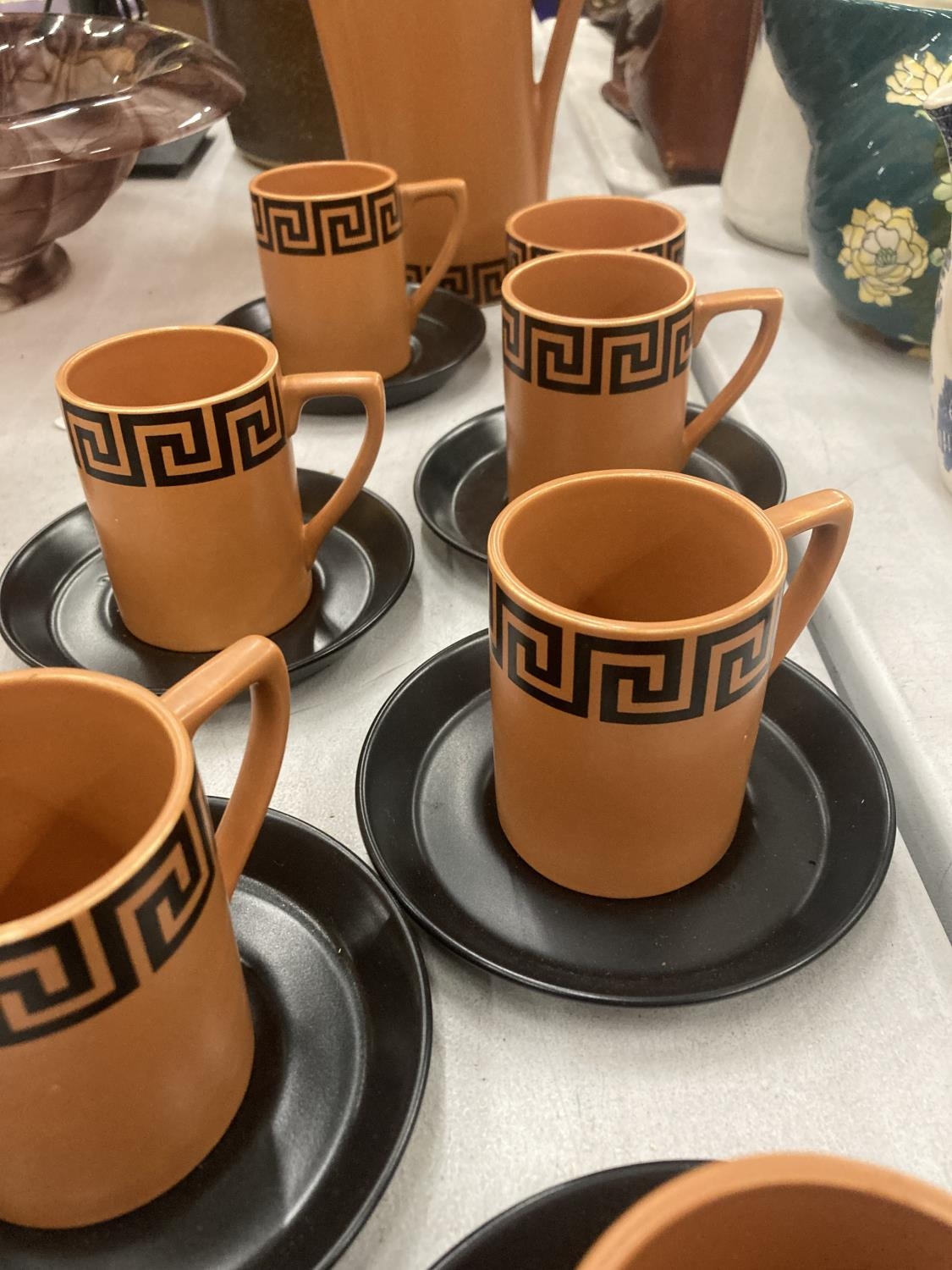 A PORTMEIRION CARAMEL COLOURED GREEK KEY DESIGN COFFEE SET TO INCLUDE A COFFEE POT, SUGAR BOWL AND SIX CUPS AND SAUCERS