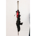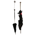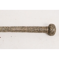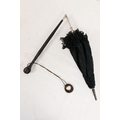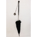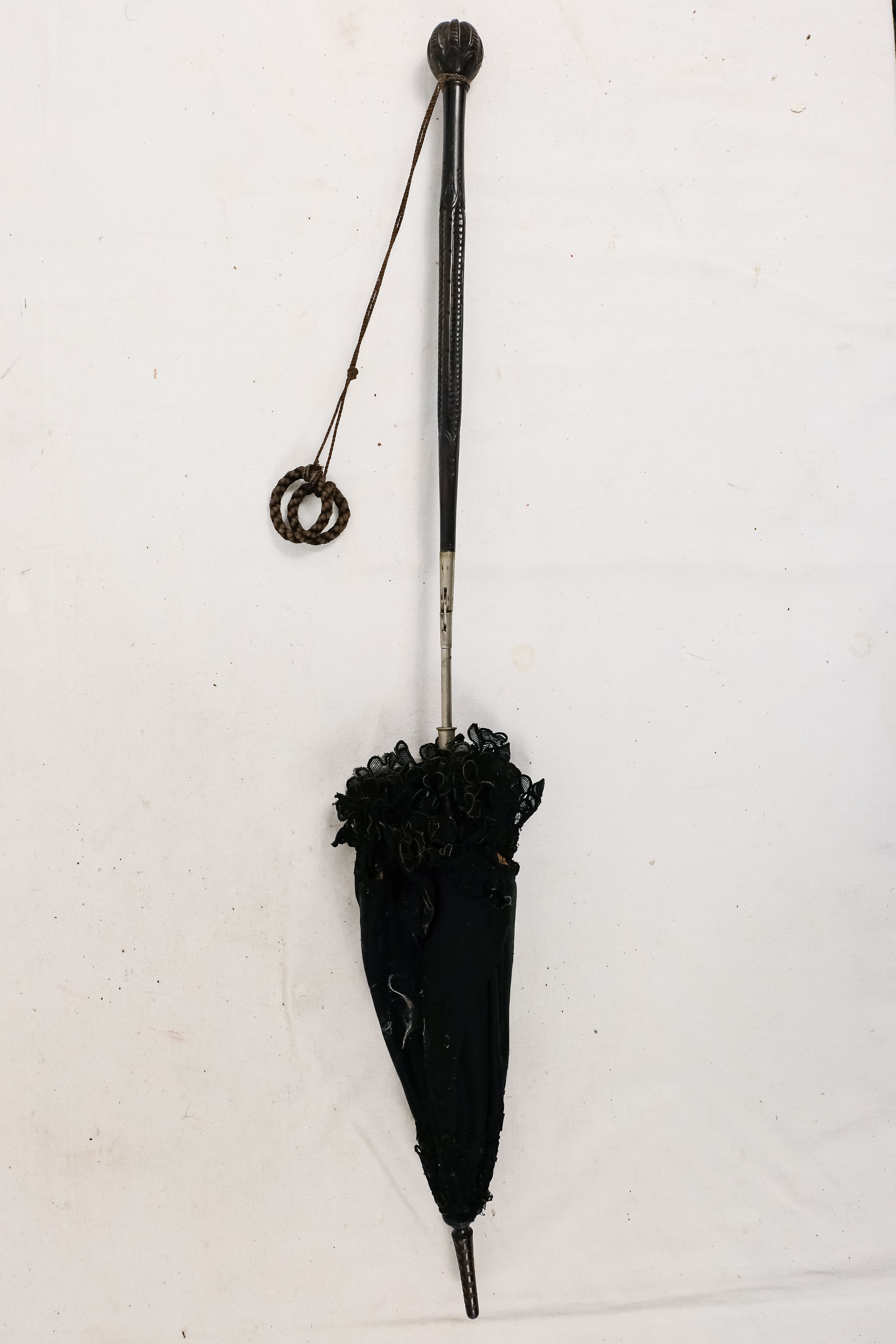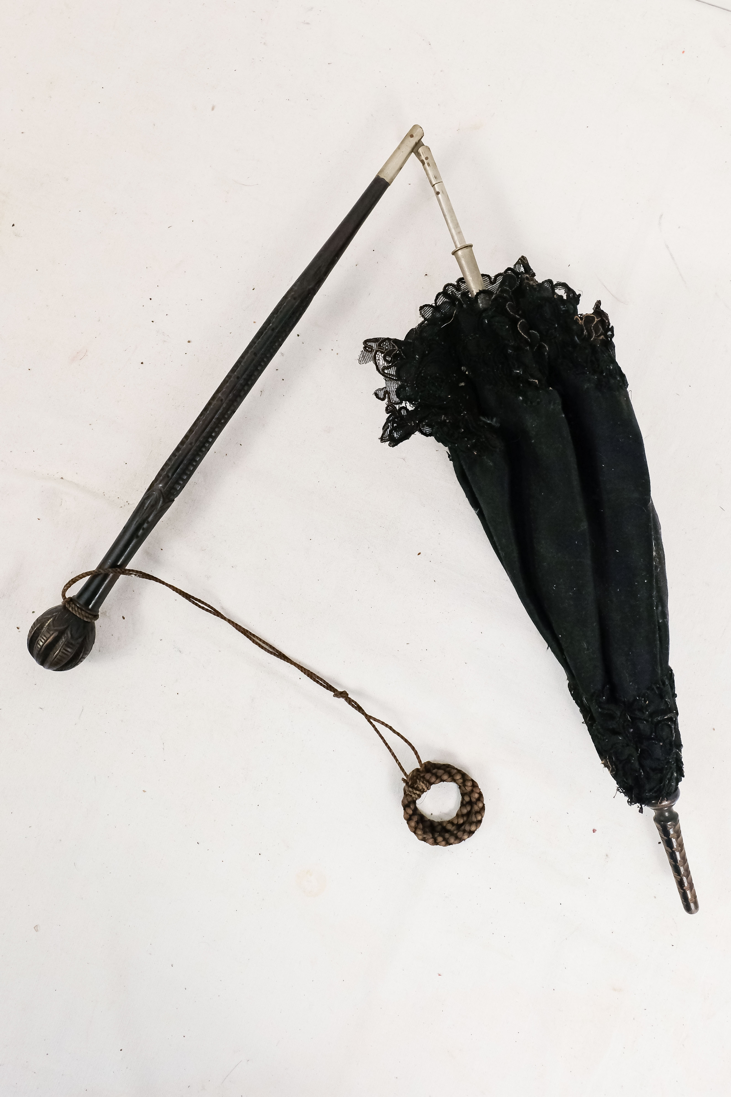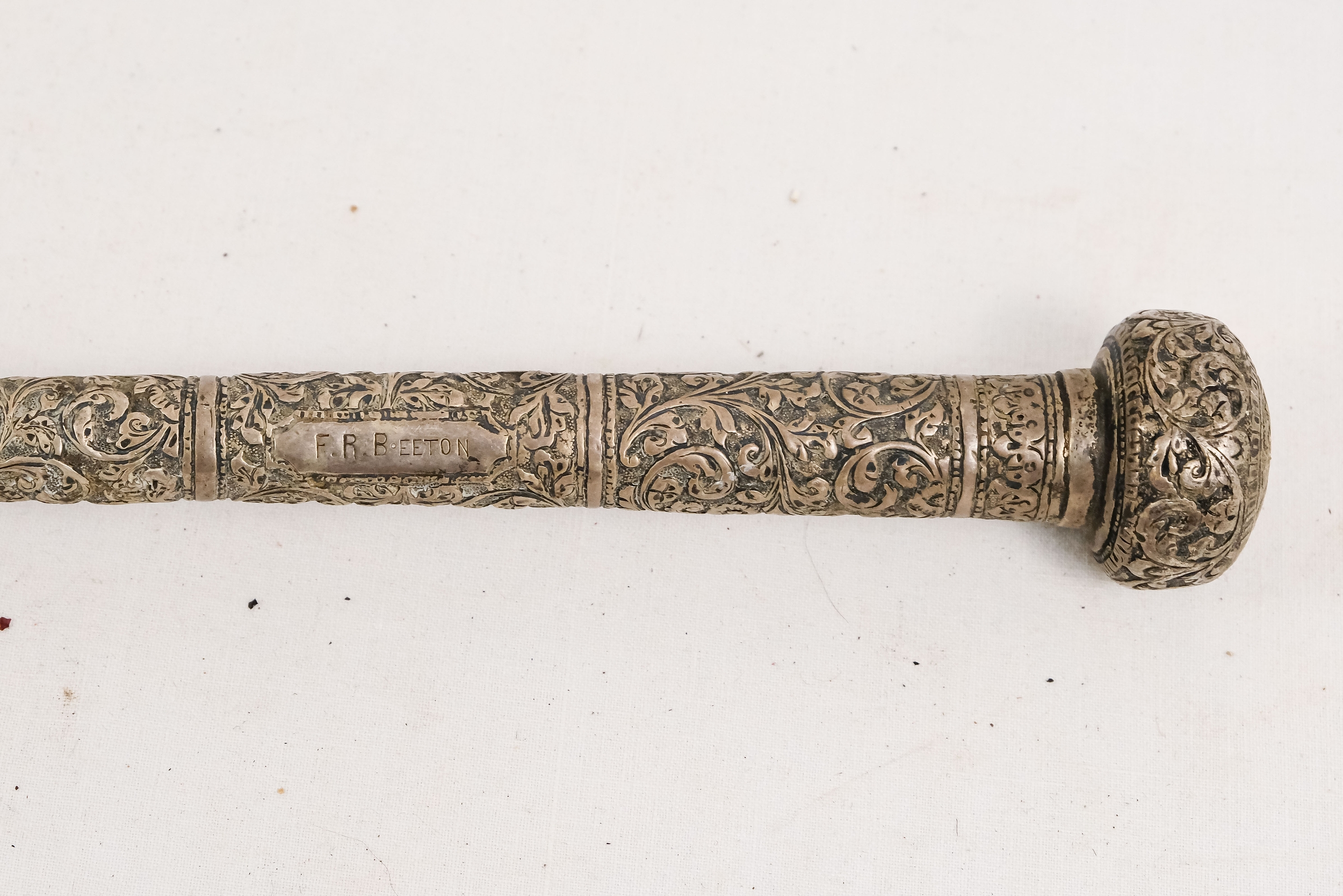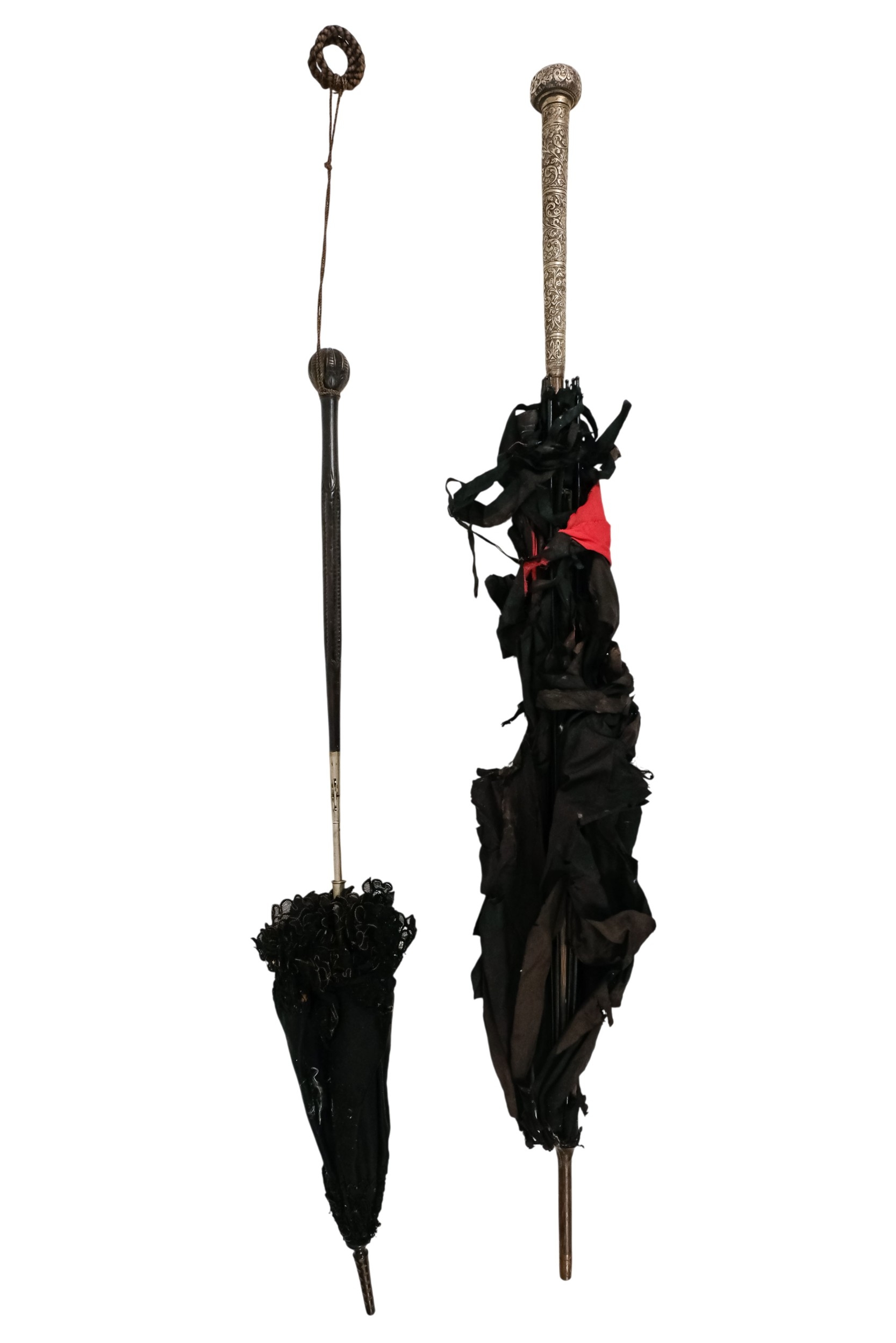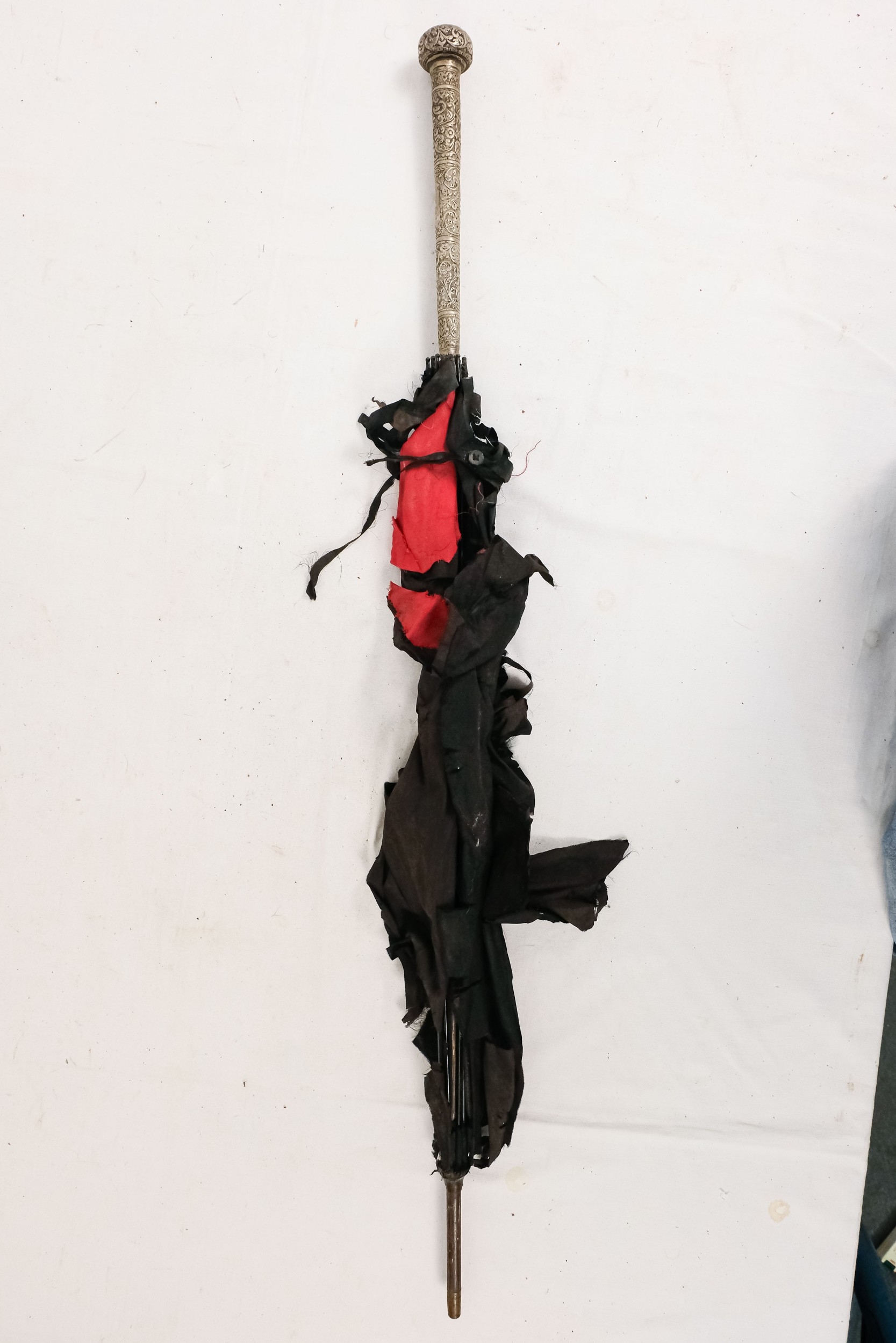 An early 20th century parasol - with an oriental white metal handle profusely decorated with foliage and ownership plaque of F R Beeton, 92cm long, together with another small folding parasol. (2)