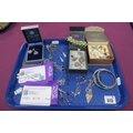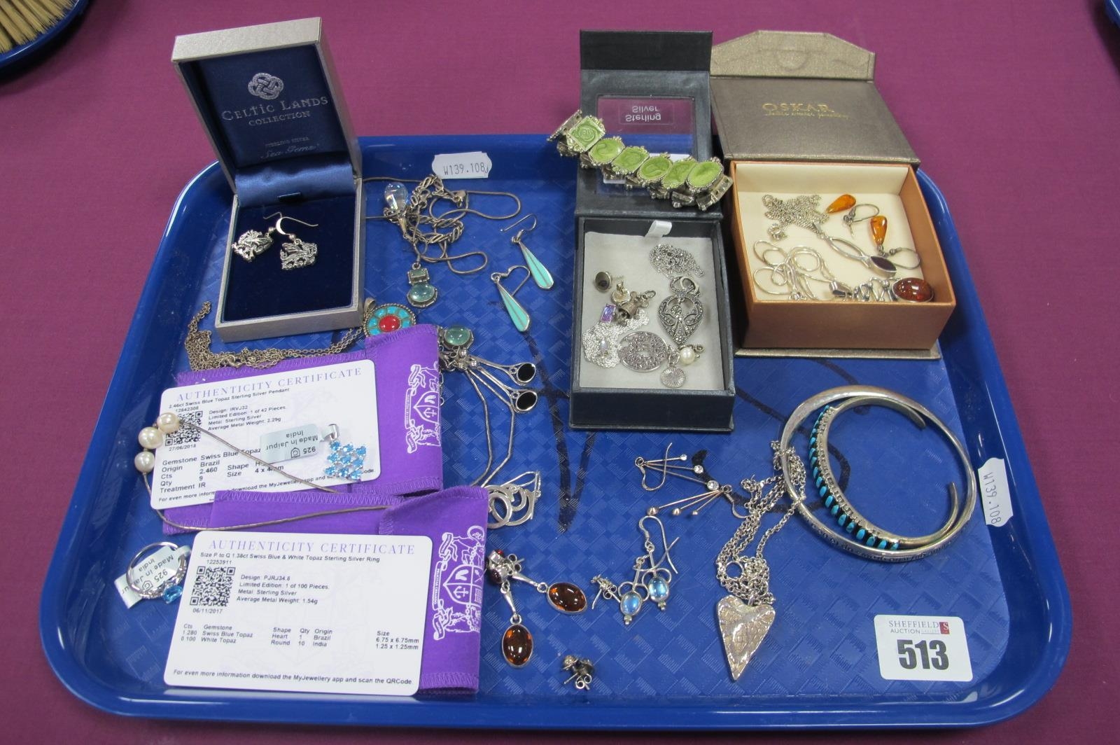 925 and Other Pendants, chains, bangles, modern Gemporia pendant and dress ring (with certificates), assorted earrings, novelty mouse charm pendant, etc :- One Tray