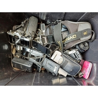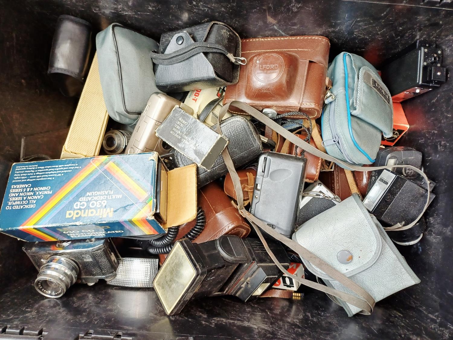 A box containing a large quantity of cameras and accessories
