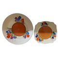 A Clarice Cliff Bizarre Crocus pattern shaped square side plate, brightly decorated with orange, blue and purple flowers, 17cm wide, printed mark; a similar bowl, 22.5cm diam, printed marks (2)