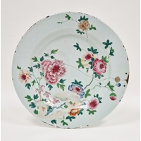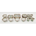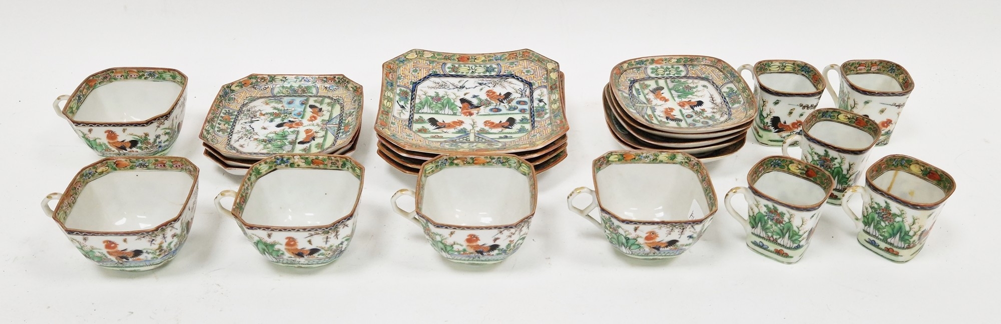 Early 20th century Chinese famille verte part tea and coffee-service, printed red CHINA marks, painted with cockerels before terracing and prunus, comprising: five teacups and three saucers, five coffee cups and five saucers and four side-plates, all of square shaped form (some cracking and minor damages)