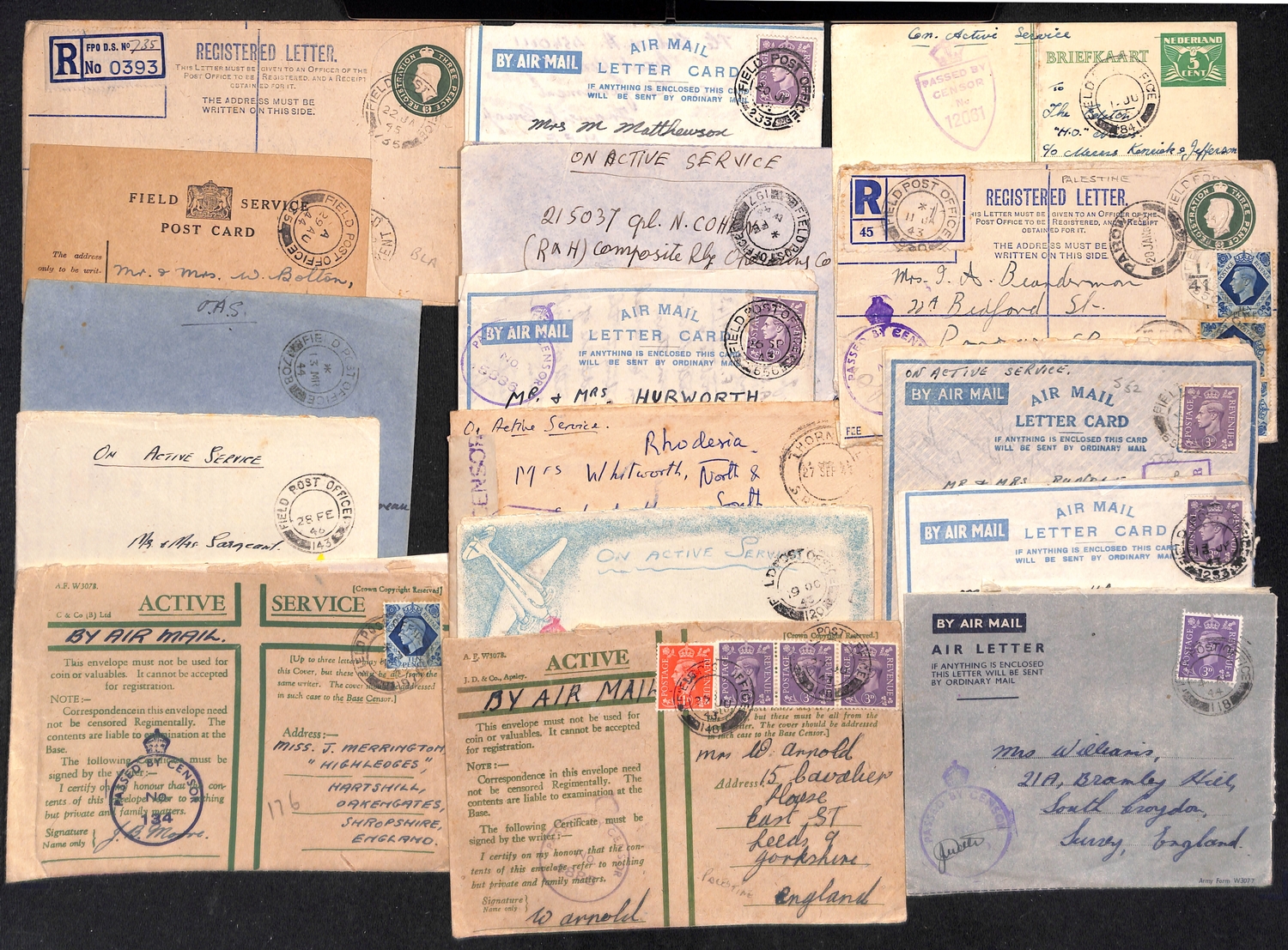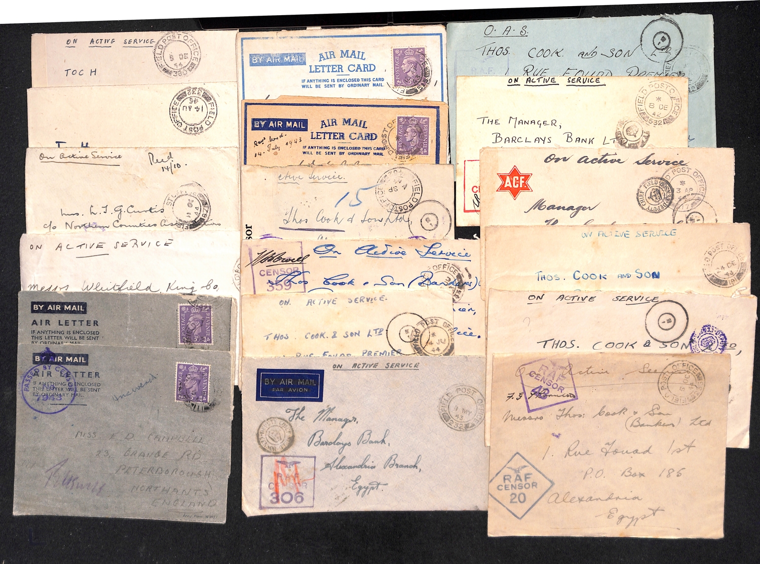 1939-46 Forces covers, from Aden, Middle East, Iceland (8), north Africa, Azores, G.B, Europe, U.S.A, India, Malta, etc., a few covers to forces overseas returned with cachets, 1940 cover from France with cachet of "Reinforcement Unit, Animal Transport Contingent, Force K", etc. (c.270).
