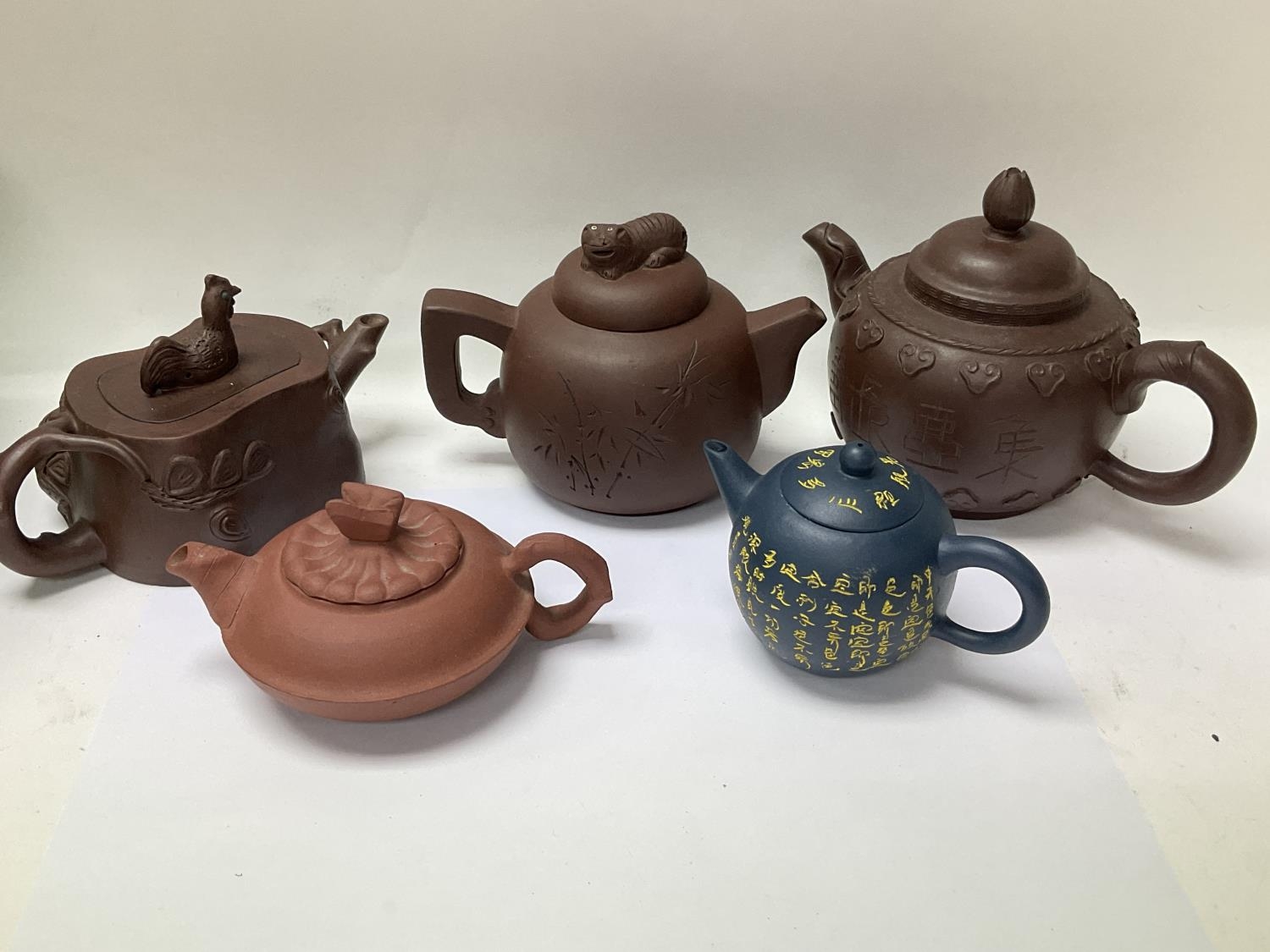 Five Chinese yixing teapots.