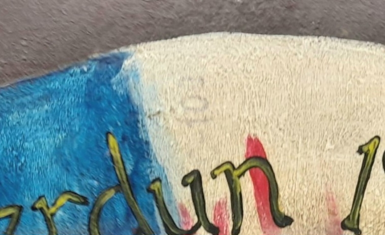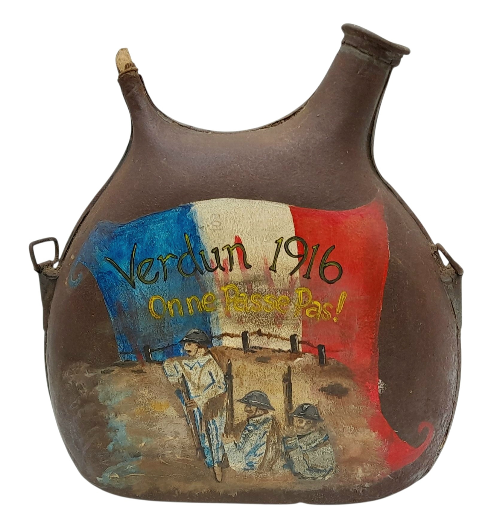 WW1 French Water Bottle with a Post War Memorial Painting.