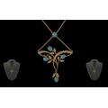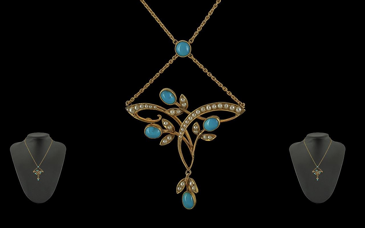 Art Nouveau Ladies 15ct Gold Turquoise and Seed Pearl Set Pendant / Necklace. Marked 15ct Gold. Excellent Quality / Design. The Turquoise Stones of Top Colour. Length 19 Inches - 47 cms, Weight 5.9 grams.