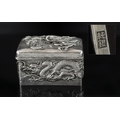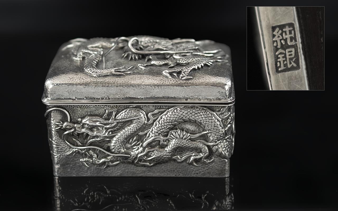 Chinese Export Silver Wonderful Quality Hinged Lidded Box, of rectangular form. Character marks to underside for Wang Hing, circa 1890. Silver purity 900-1000. The cover and all sides of box decorated with images of dragons floating in the sky. High relief. Measurement of box: 3'' - 7.5 cm wide, 2'' - 5 cm high, and 2'' - 5 cm depth.