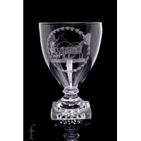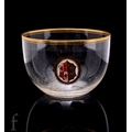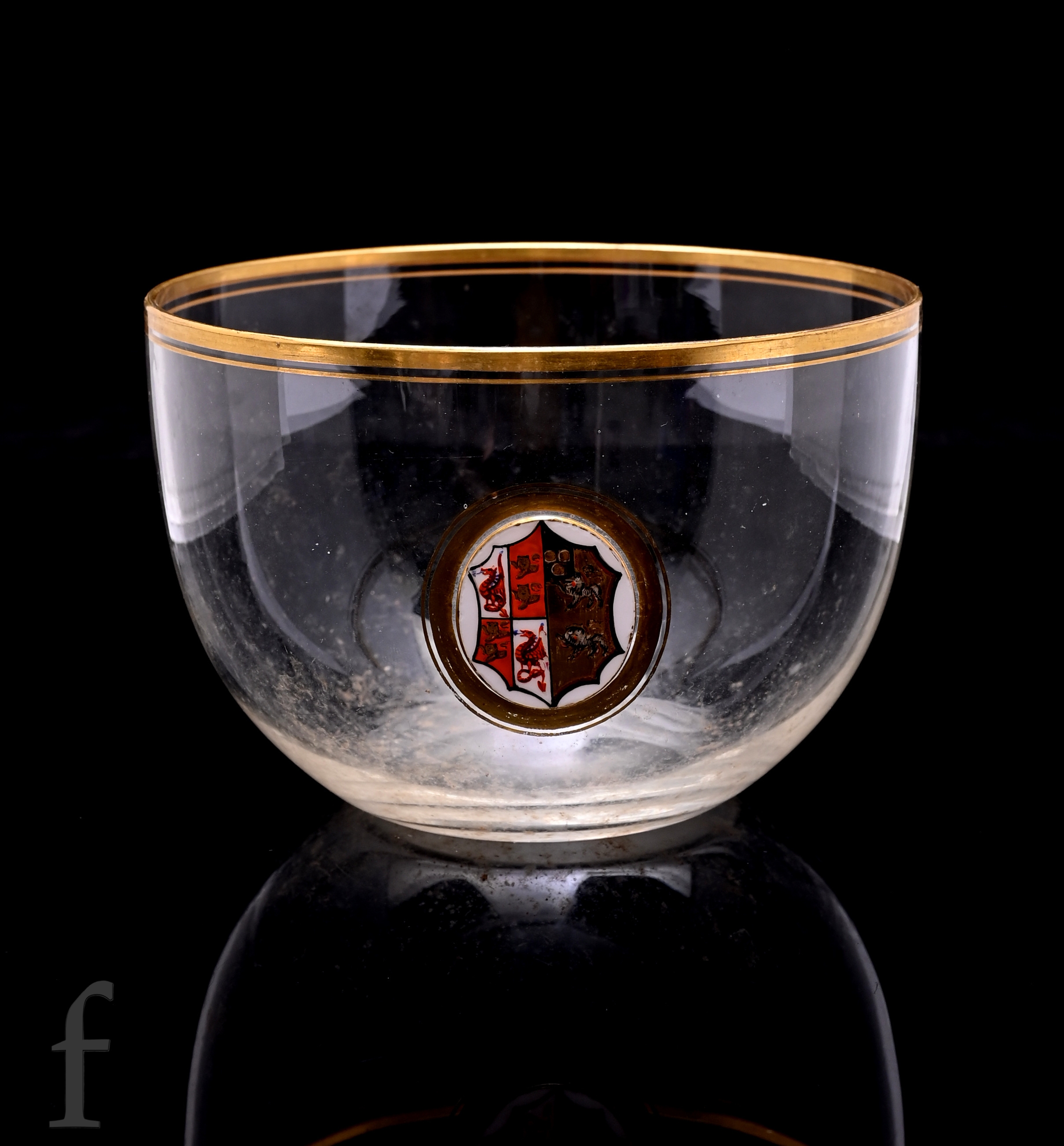 A 19th Century clear crystal glass finger bowl circa 1850, the plain body decorated with an applied oval glass cartouche panel enamelled and gilded with an armorial shield with gilded borders, width 11.5cm.