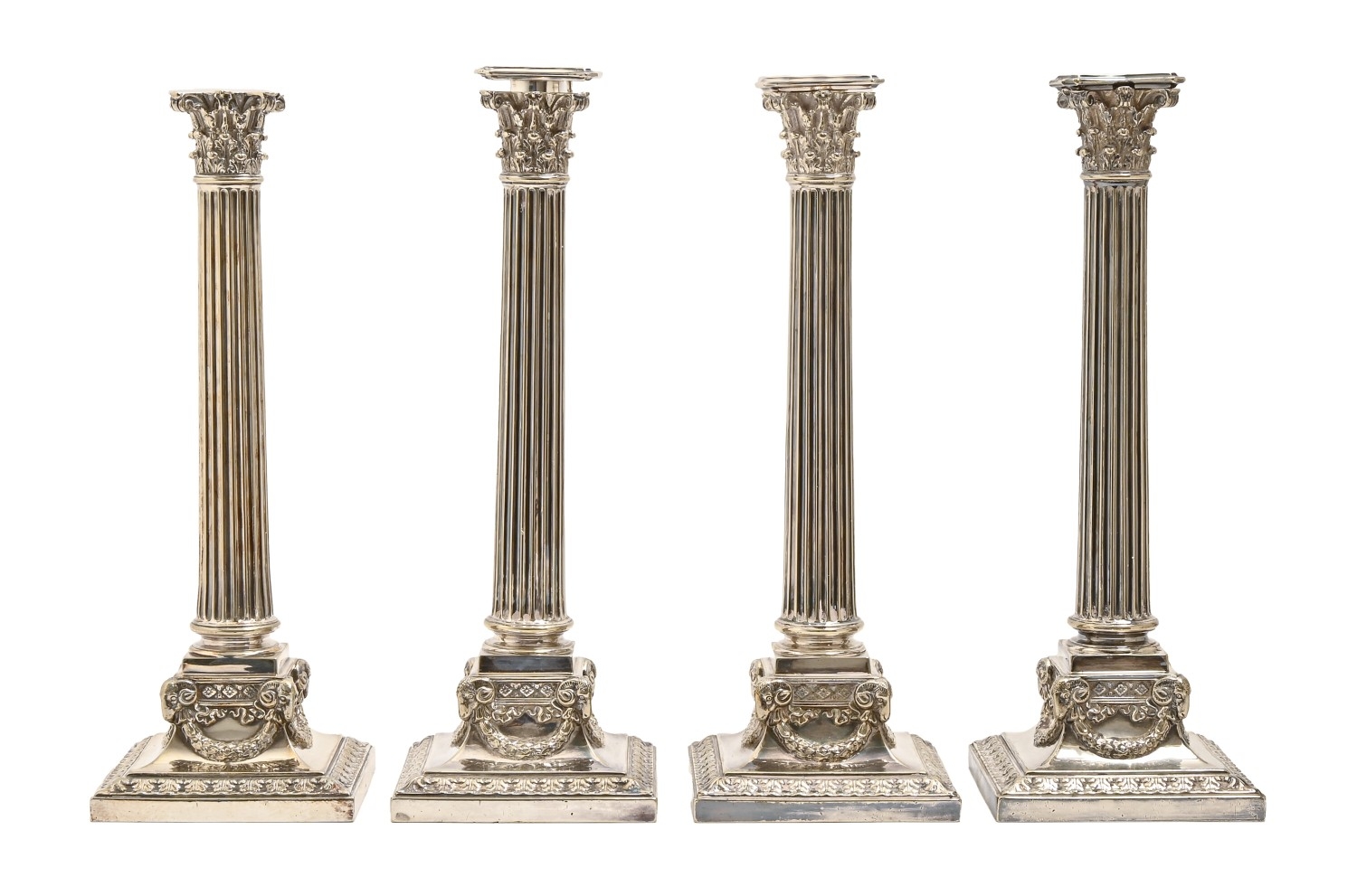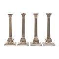 A set of four Edwardian EPNS column candlesticks, 1901, three with nozzle, 31.5cm h, by Elkington & Co Ltd, maker's mark and ELKINGTON & CO, P and 2 7 9 0