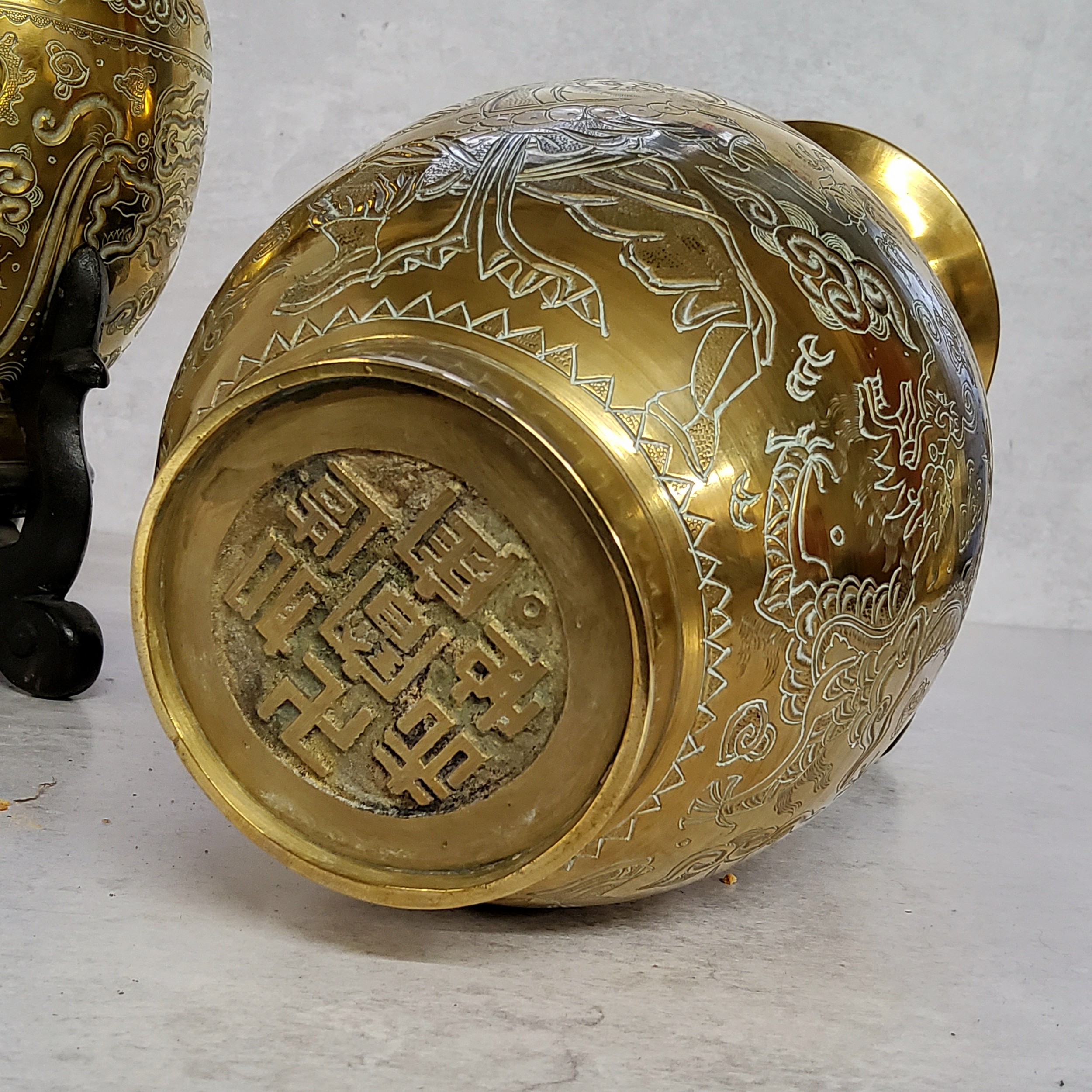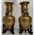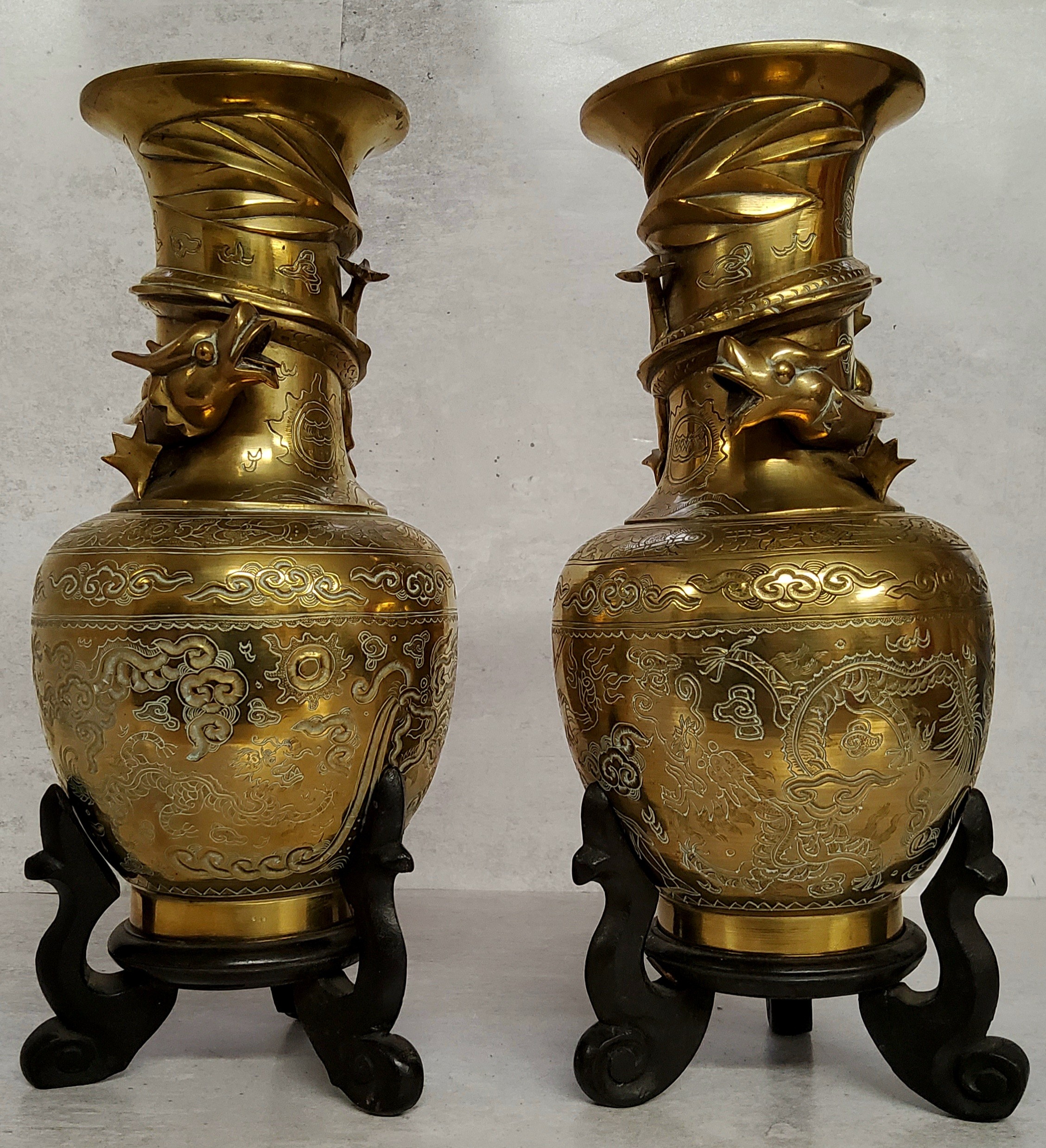 A pair of Chinese bronze slender necked temple vases, cast in relief with a dragon, chased stylised clouds, six character marks seal stamped base, 25.5cms tall, hardwood stands