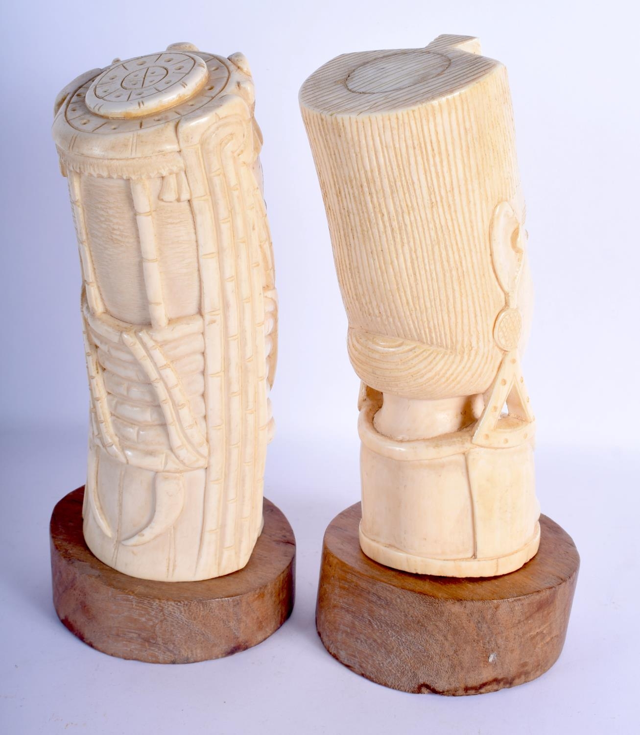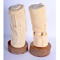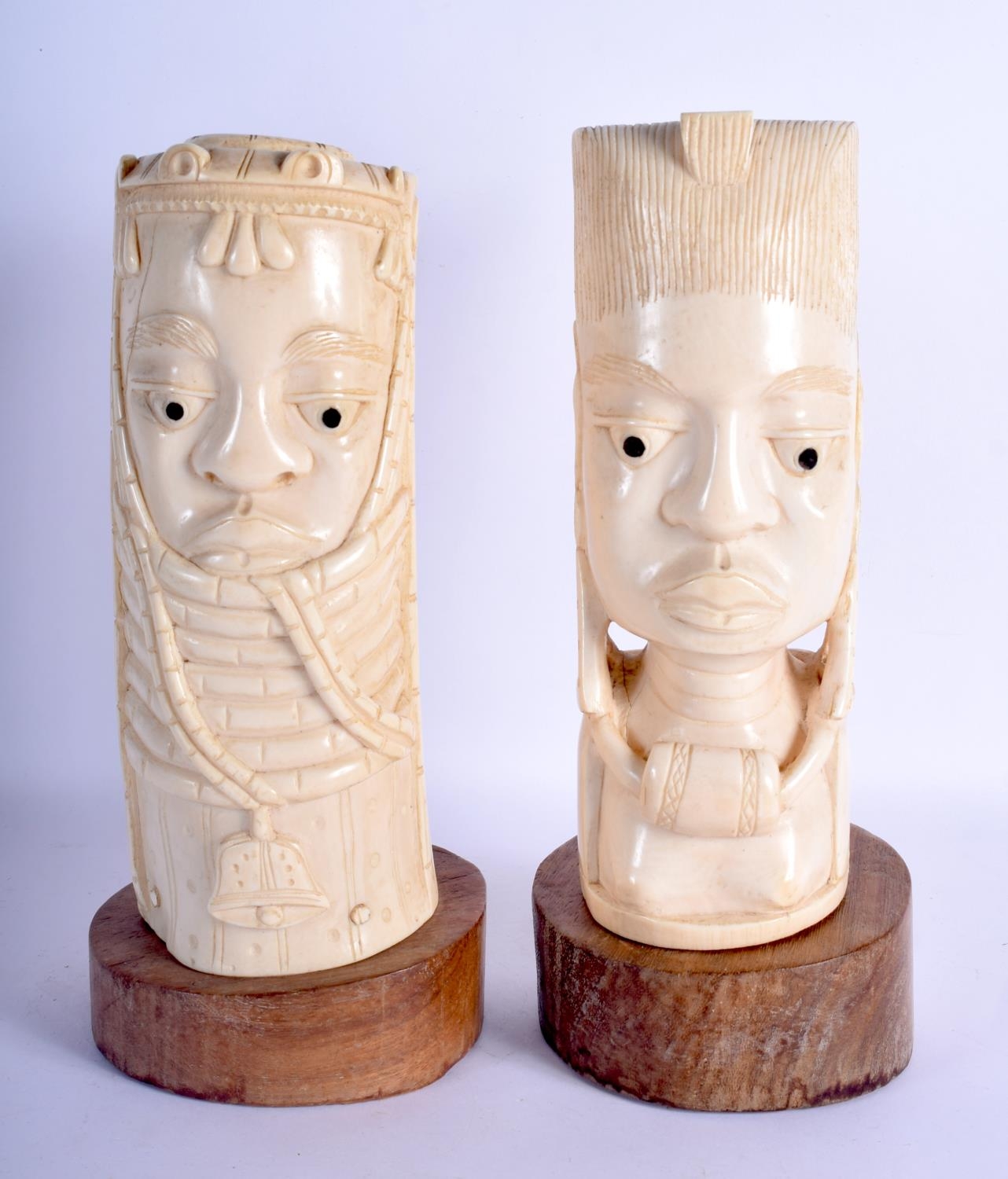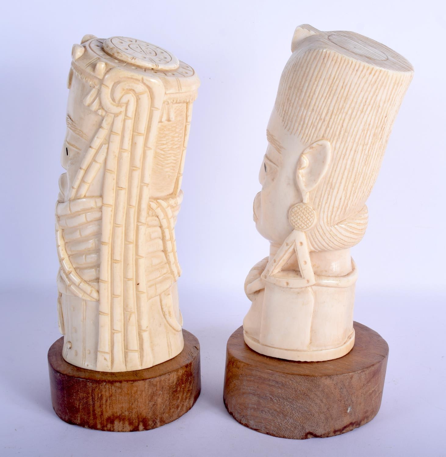 A RARE PAIR OF EARLY 20TH CENTURY AFRICAN TRIBAL CARVED IVORY BUSTS C1910 modelled as a King and Queen upon wooden bases. 32 cm high.