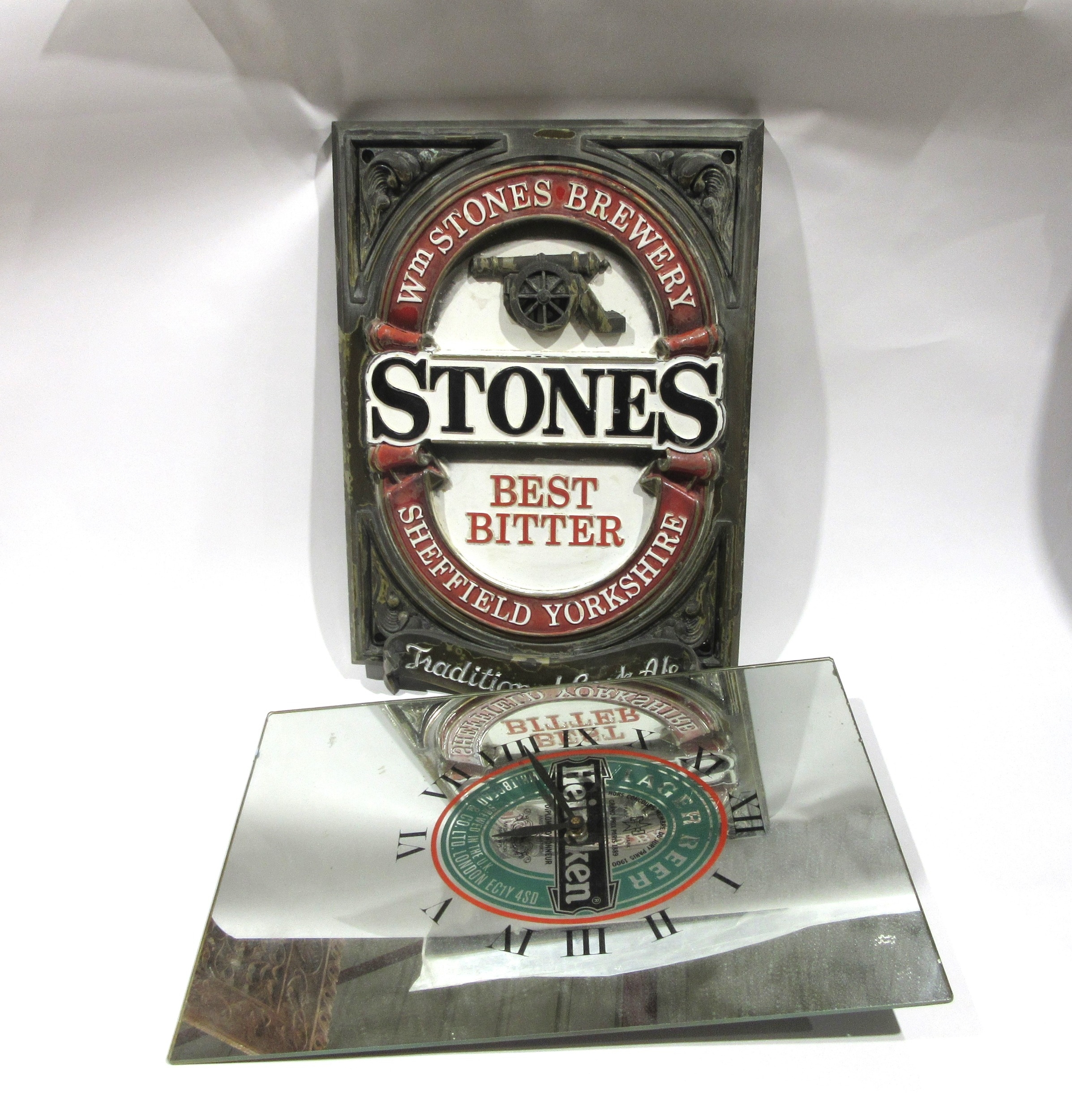 A Stones Bitter wall plaque, 44cm height x 30.5cm width, together with a Heineken mirror wall clock (2)