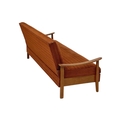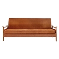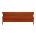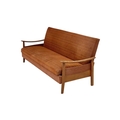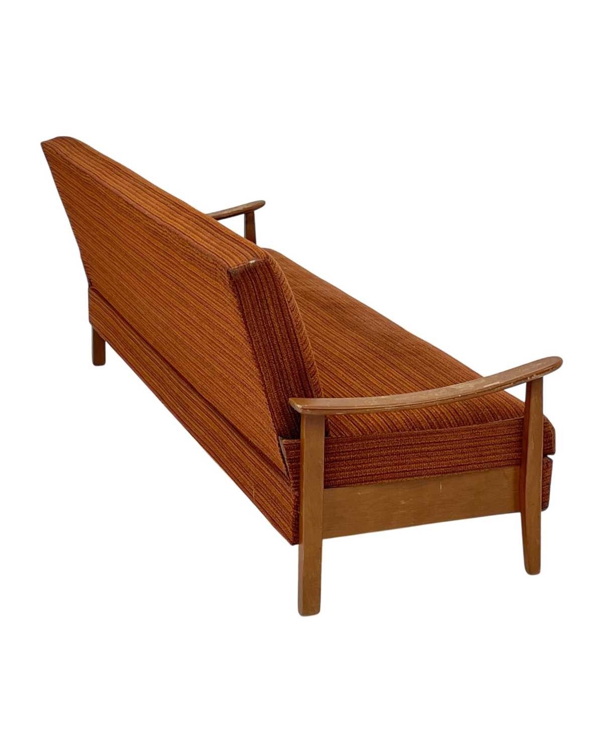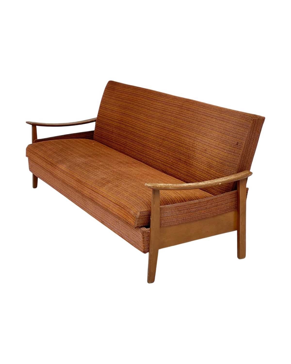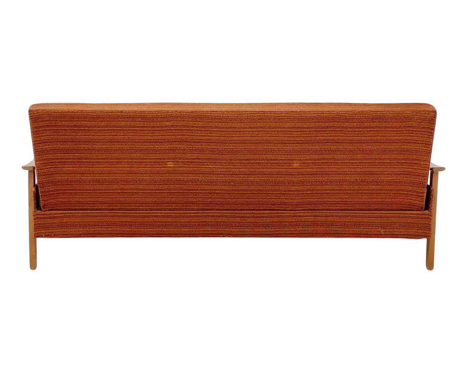 A mid-century sofa bed. With stained beech framed arms and feet, height 79cm, width 193cm, depth 74cm.