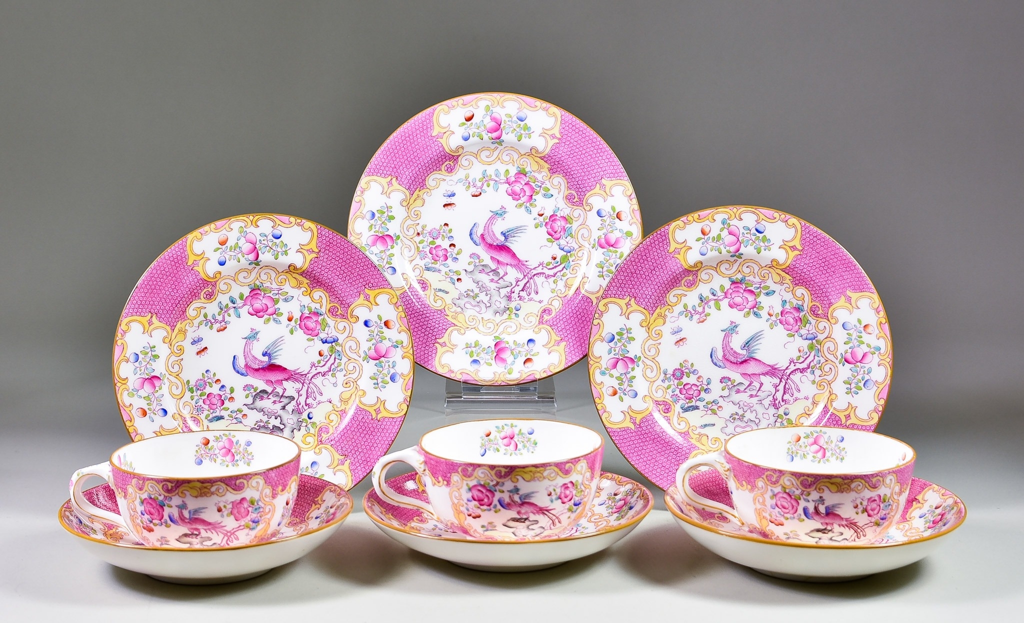 A Minton Pink Scale Porcelain Eleven Place Setting, comprising - twelve teacups, eleven saucers, and eleven tea plates, made for Webb's Salon, The Myer Emporium, Melbourne, each with painted marks to base