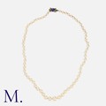 A Pearl Necklace in yellow gold and silver, comprising a single strand of drilled pearls measuring approximately 3.9 - 7.2mm, terminating in a sapphire and rose cut diamond set clasp. Unmarked, tests indicate 9 carat gold and silver.