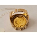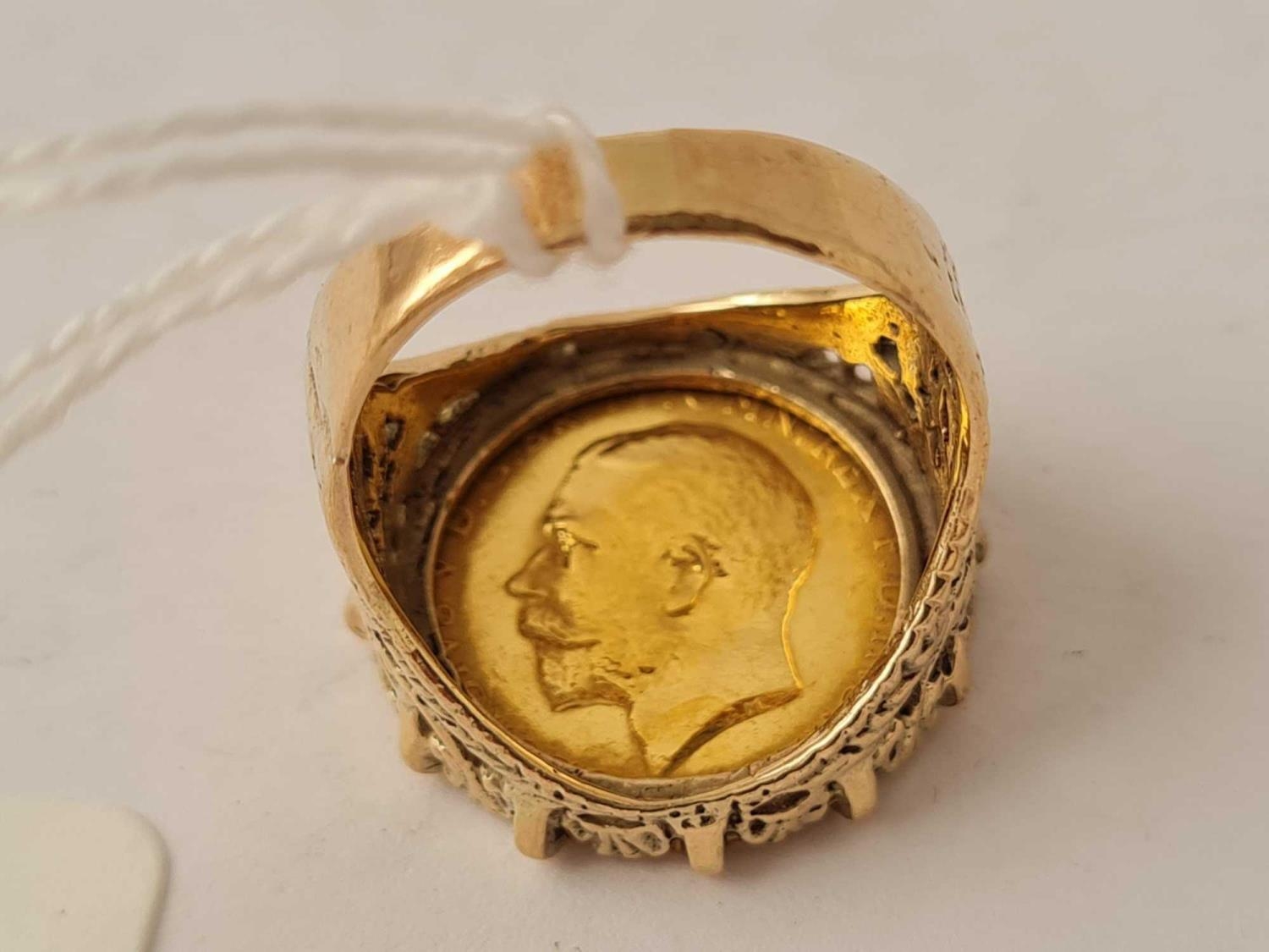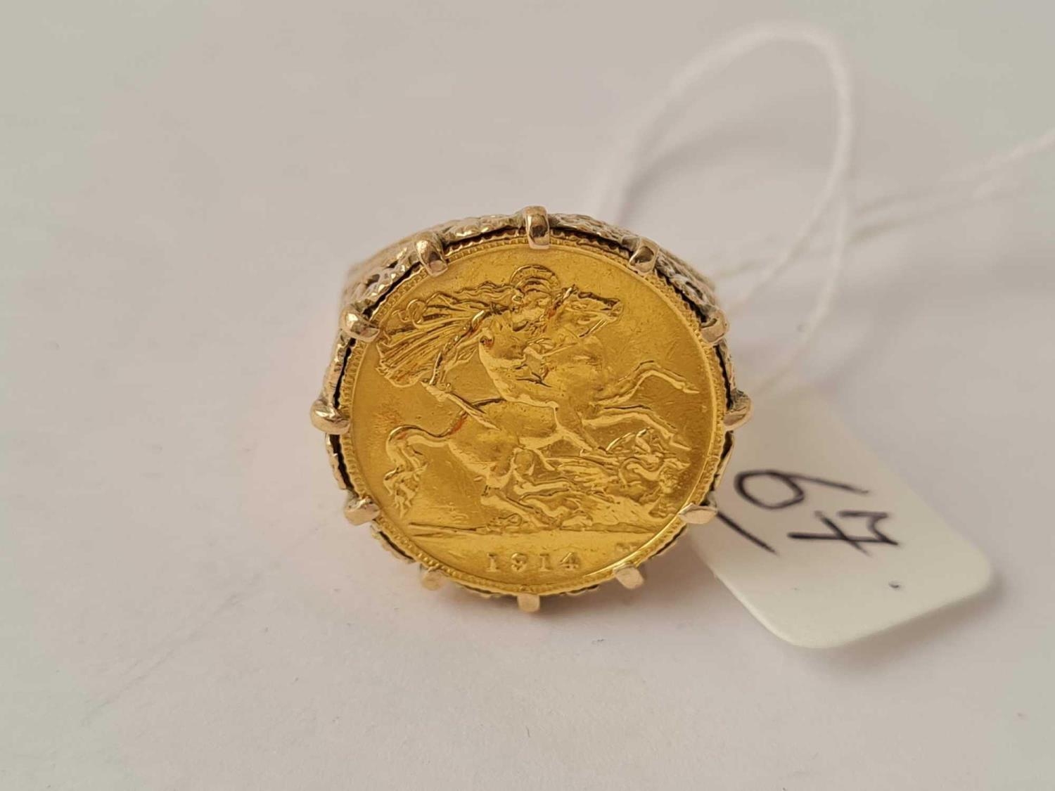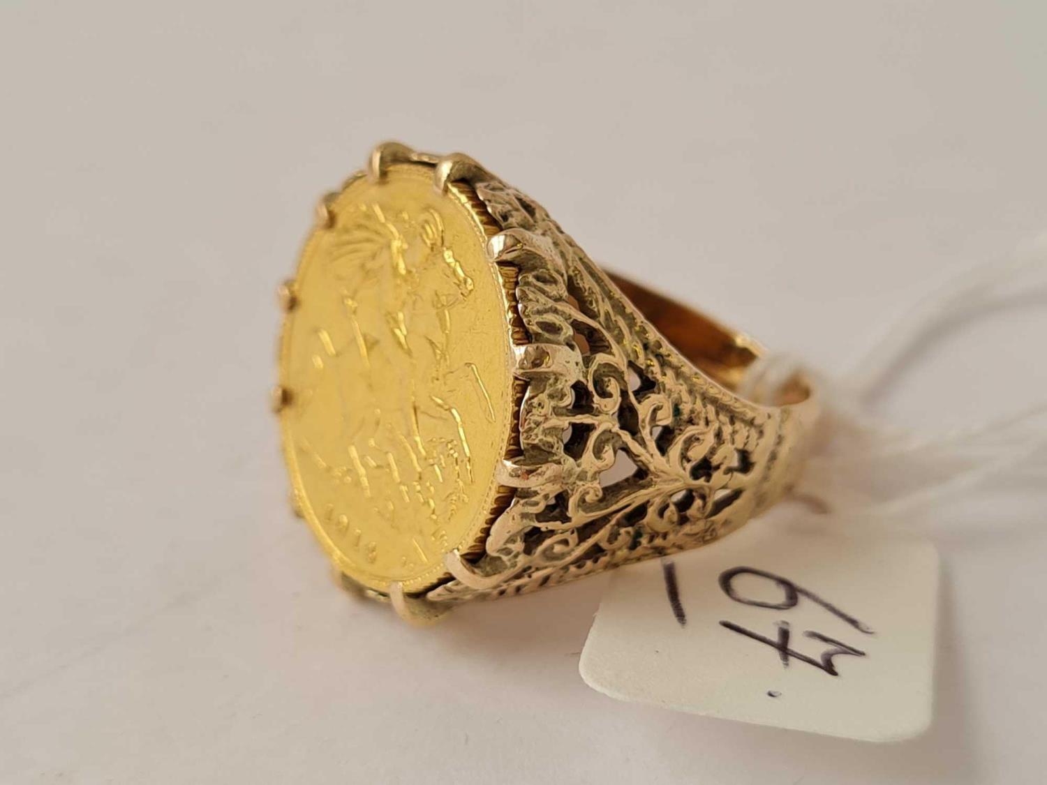 A HALF SOVEREIGN RING IN 9CT MOUNT 1914 SIZE P 9.8g