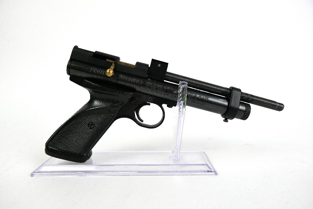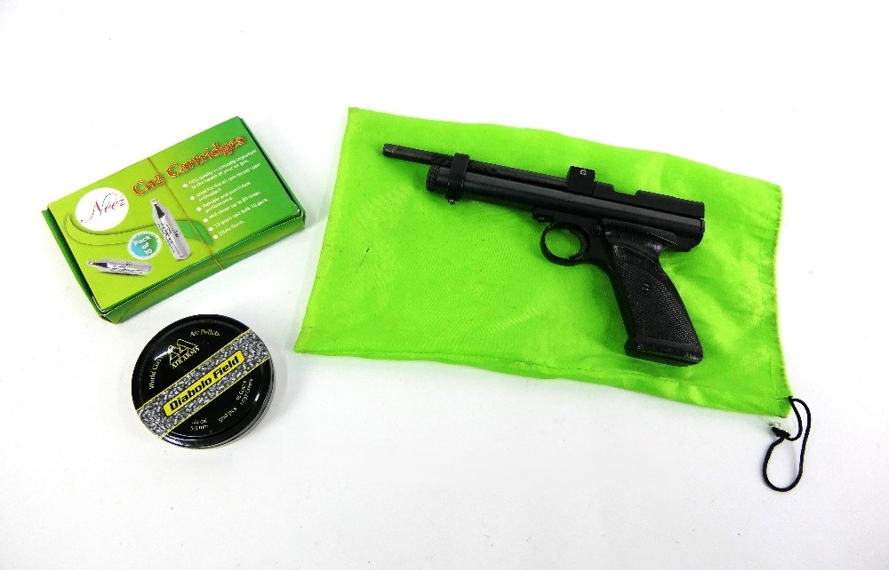 Crossman 2240 cal 22 CO2 powered air pistol, with cartridges and small amount of pellets. Serial No. 117B04941. WE CANNOT POST AIR GUNS TO PRIVATE ADDRESSES. POSTAGE TO REGISTERD FIREARMS DEALERS ONLY.
