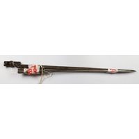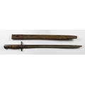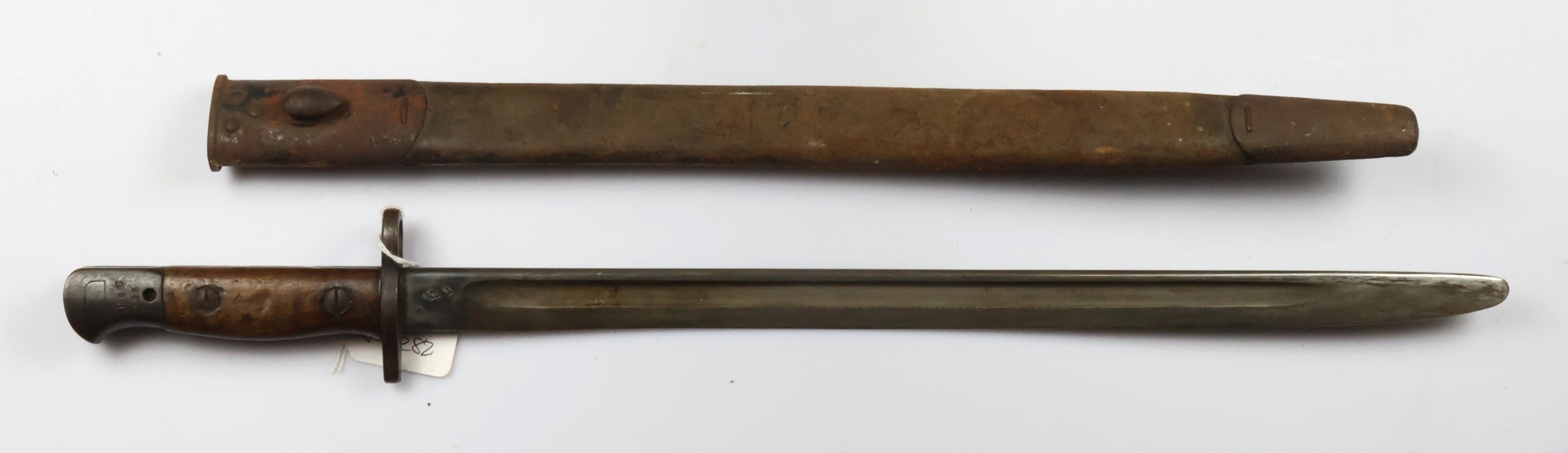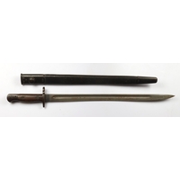 Bayonet: A P'07 bayonet by Enfield, dated December 1914. Pommel stamped to an OTC unit. Blade rounded at top for bayonet training. In decent condition overall. In its steel-mounted leather scabbard (stitching good). Needs cleaning.