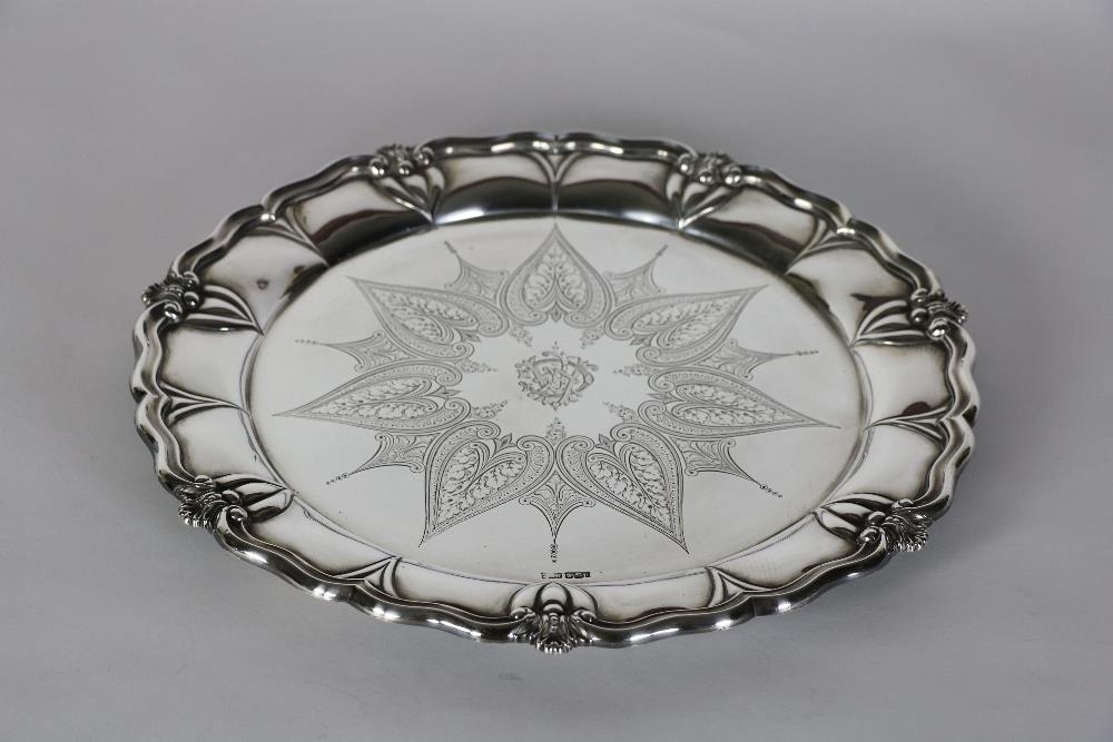 An attractive large heavy English circular silver Salver, with shaped rim and decorated border, the engraved body with central monogram, c. 41cms (16") diameter, Sheffield 1926, approx. 60 ozs. (1)