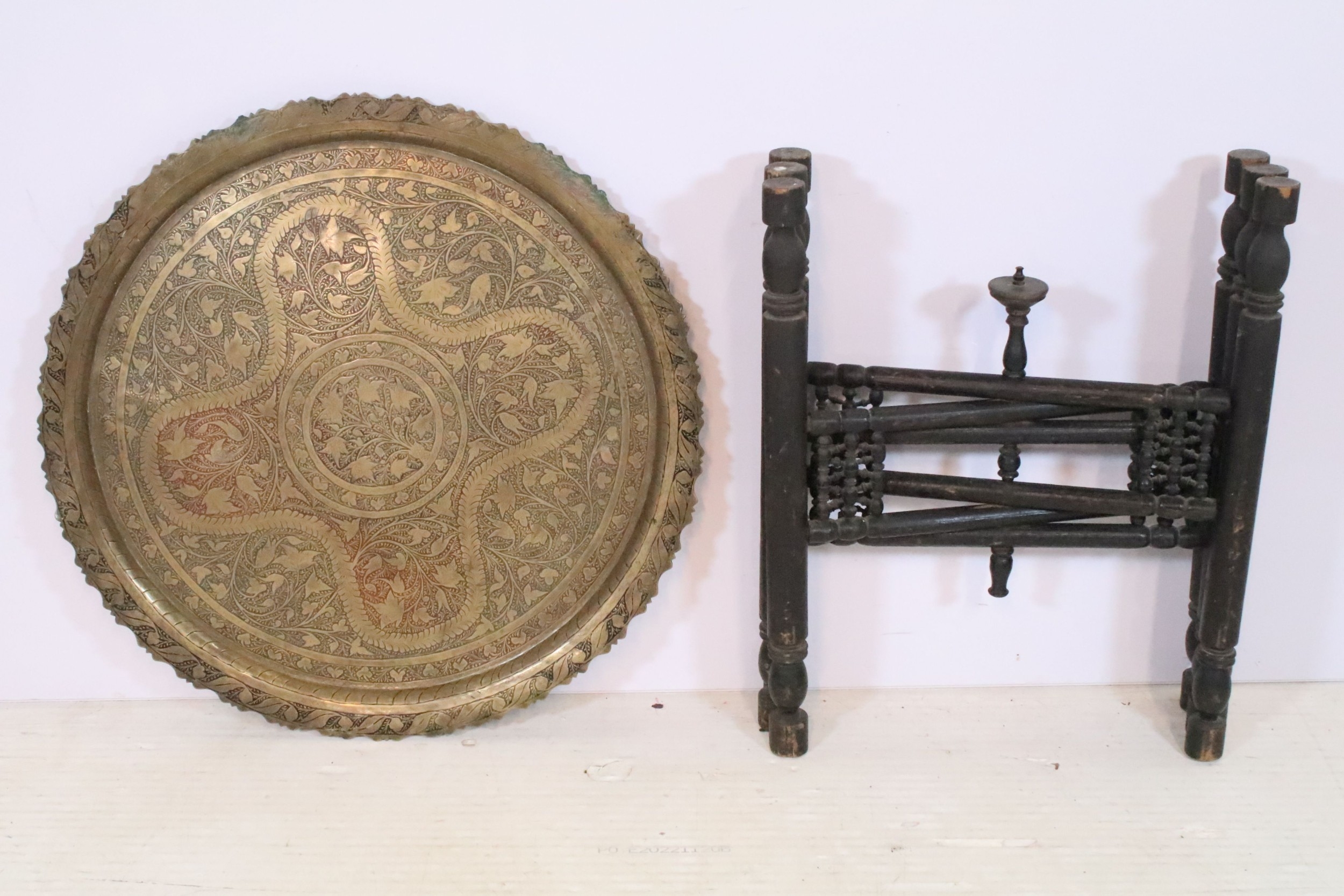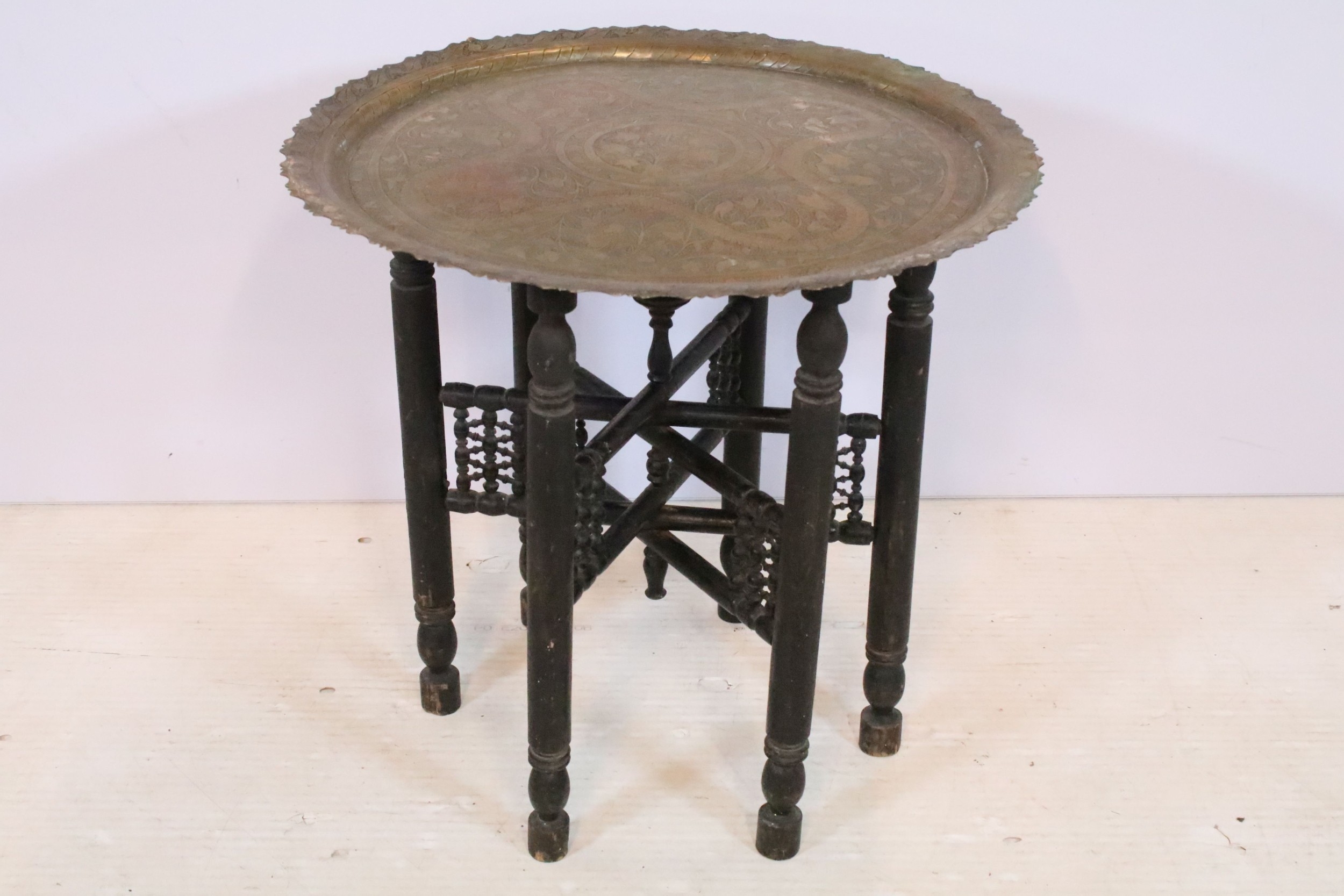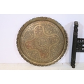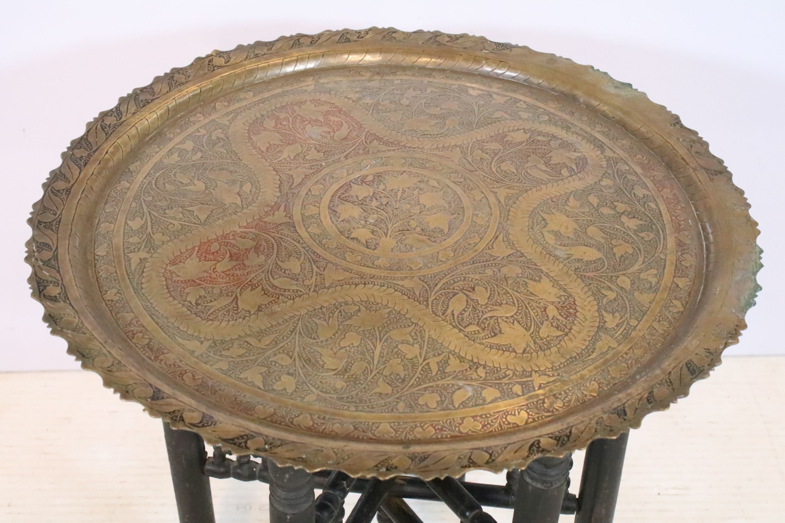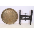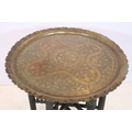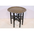 Early 20th century brass topped Benares table, having tray top with incised and colour filled decoration, raised on folding base, D 59cm x H 56cm