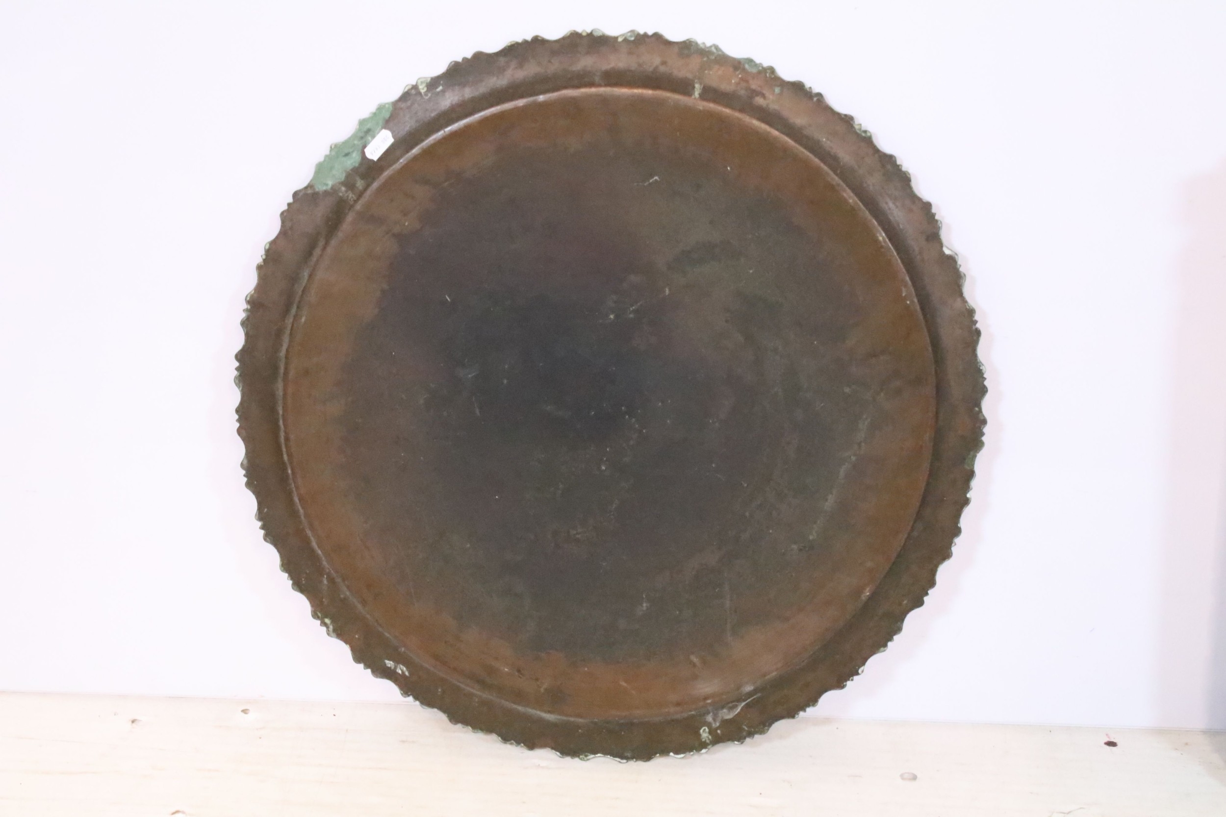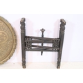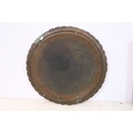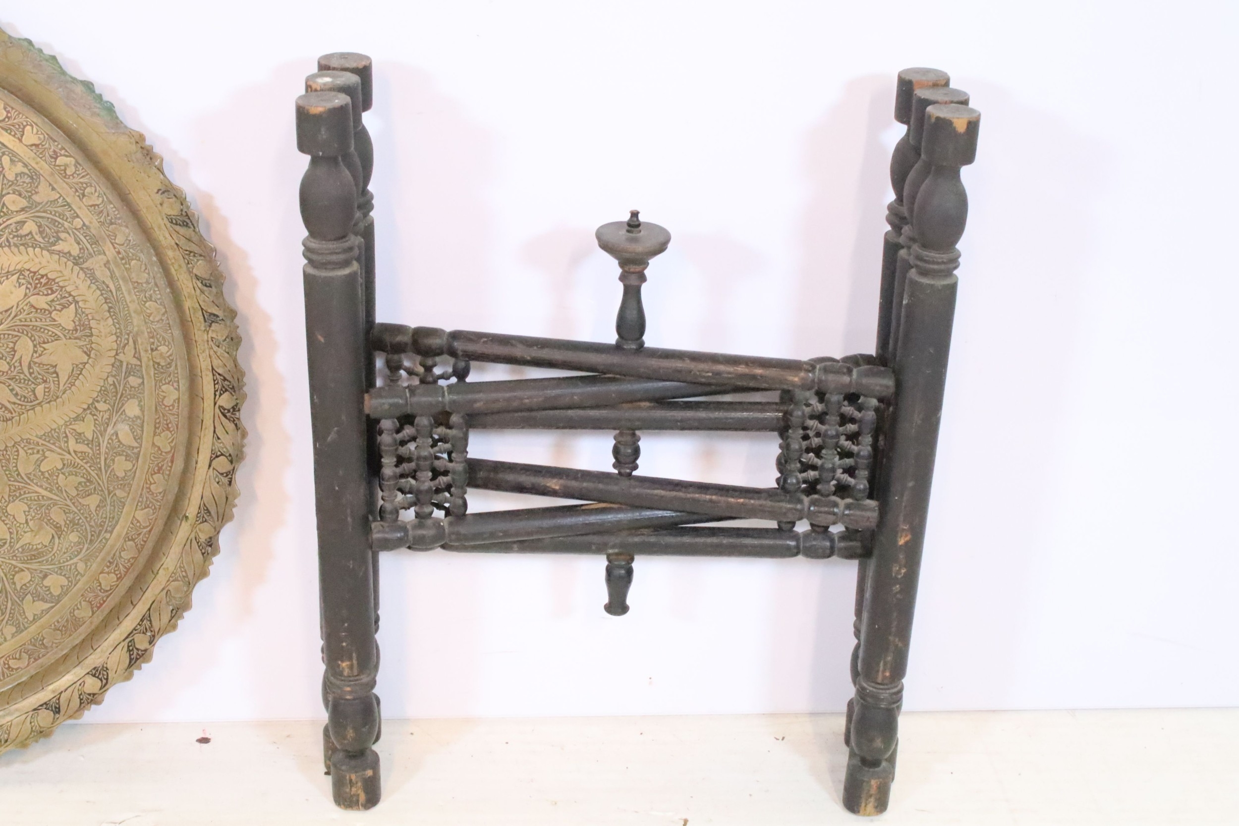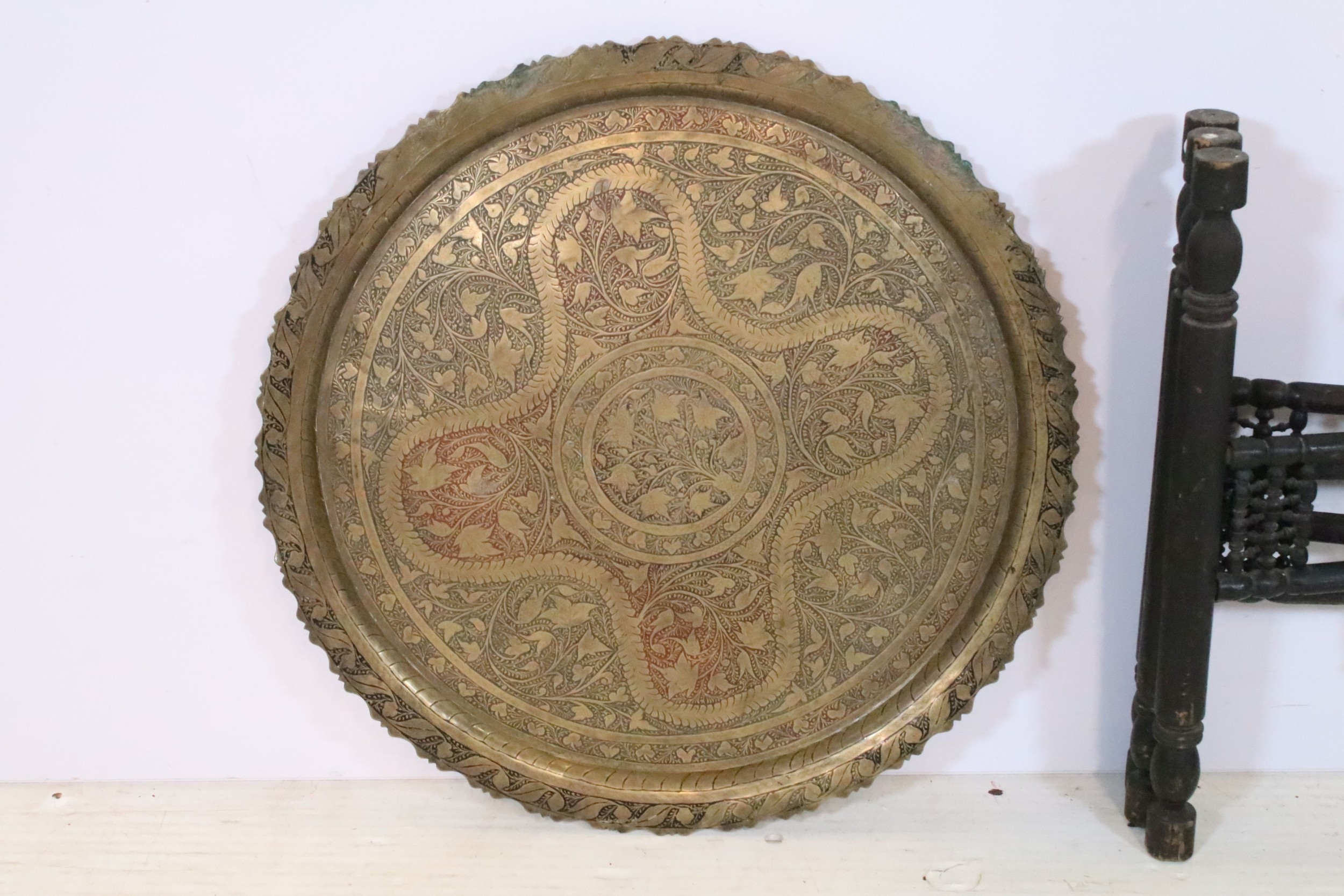 Early 20th century brass topped Benares table, having tray top with incised and colour filled decoration, raised on folding base, D 59cm x H 56cm