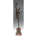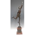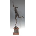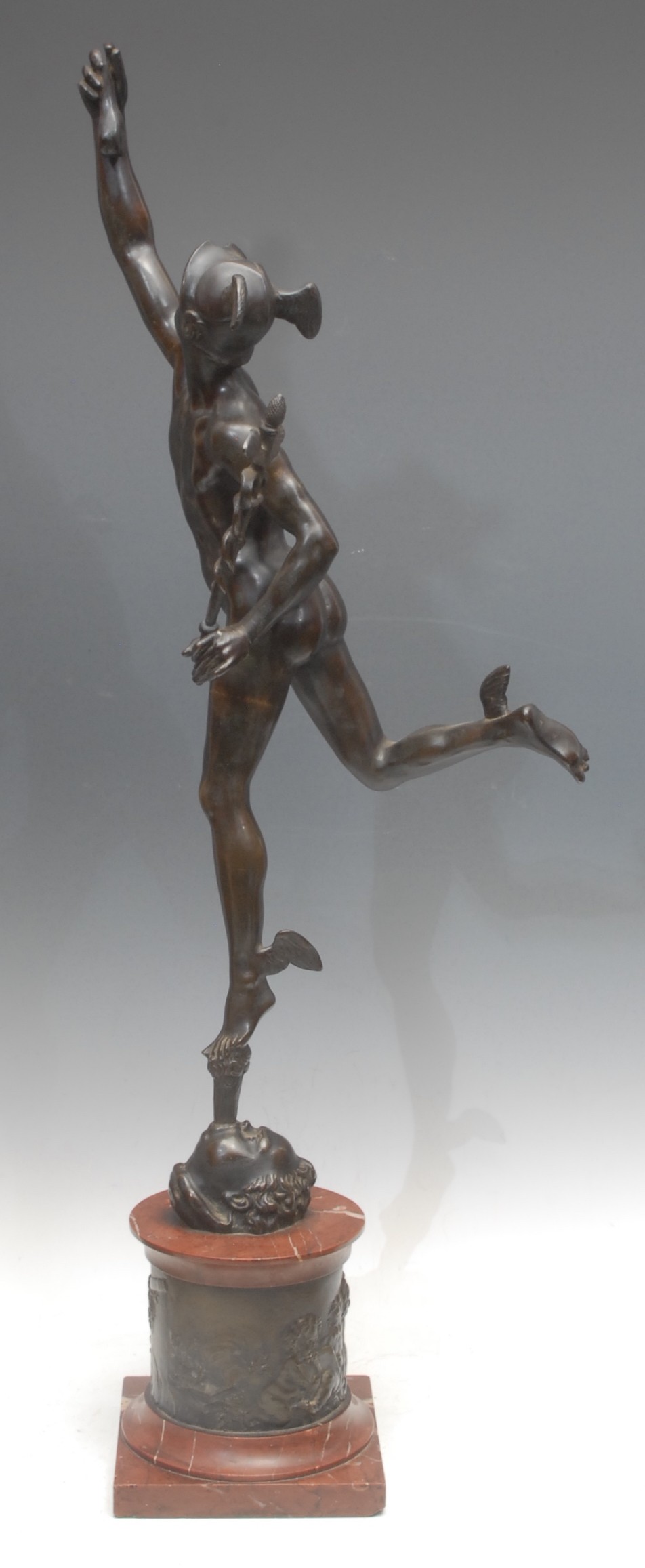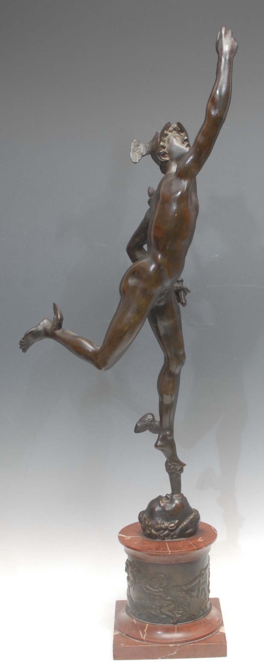 Giambologna (1529-1608) after, a figural bronze, of Mercury, veined red marble and bronze mounted pedestal base cast in bas-relief with putti at play, 82cm high overall