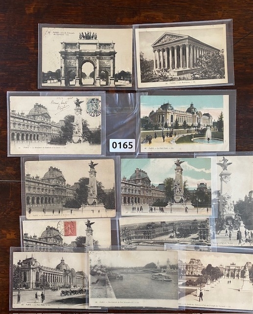 PARIS France 12 Edwardian and early 20th century postcards including 2 coloured of many famous places including le Monument de Gambetta et le Louvre, Le Petit Palais, Arc de Triomphe etc.