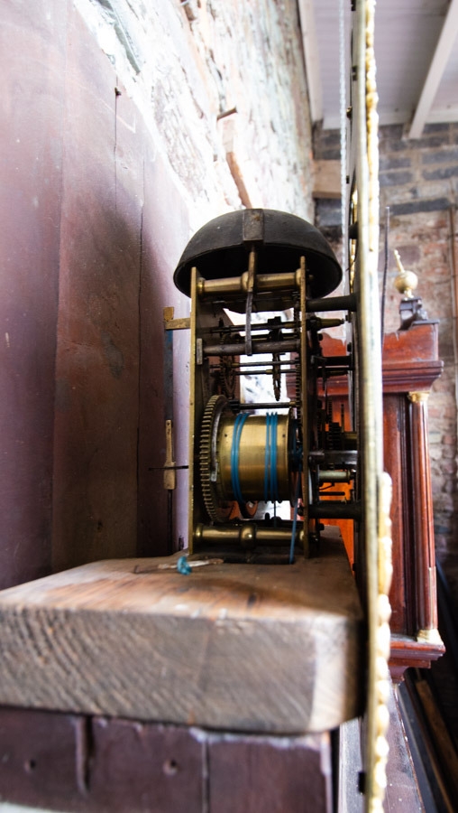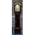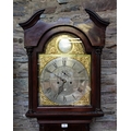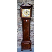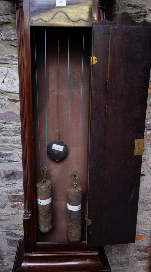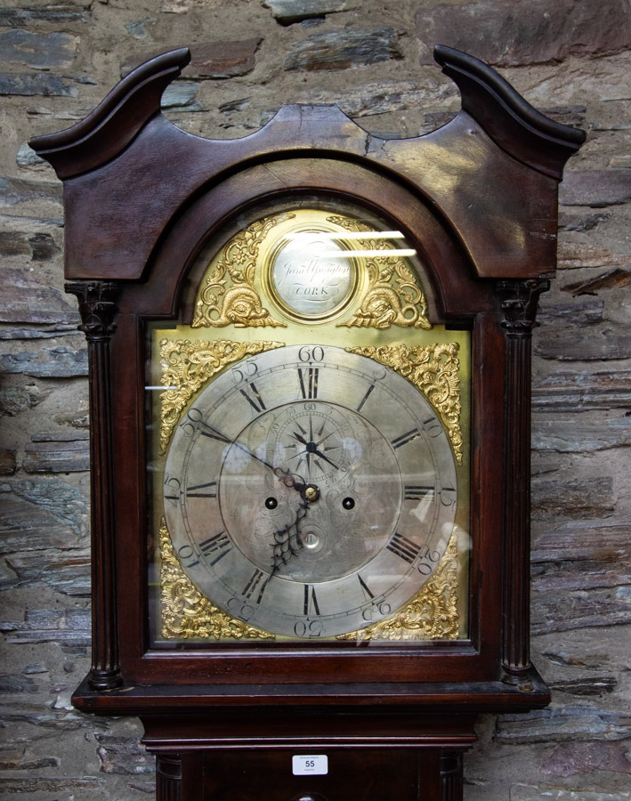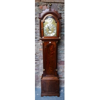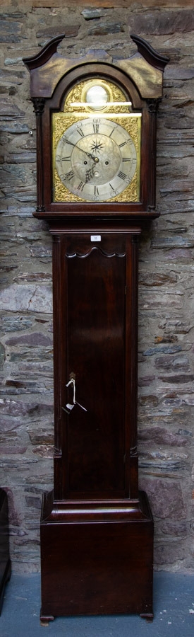 CORK BRASS ARCH DIAL LONGCASE CLOCK BY JAMES UPPINGTON OF CORK, WORKING AT PAUL STREET IN CORK, 1776-1813. IN AN IRISH GEORGIAN CUBAN MAHOGANY CASE, MEASURING 234H X 50W X 26D CM. WITH WEIGHTS AND PENDULUM AND KEY