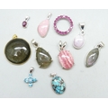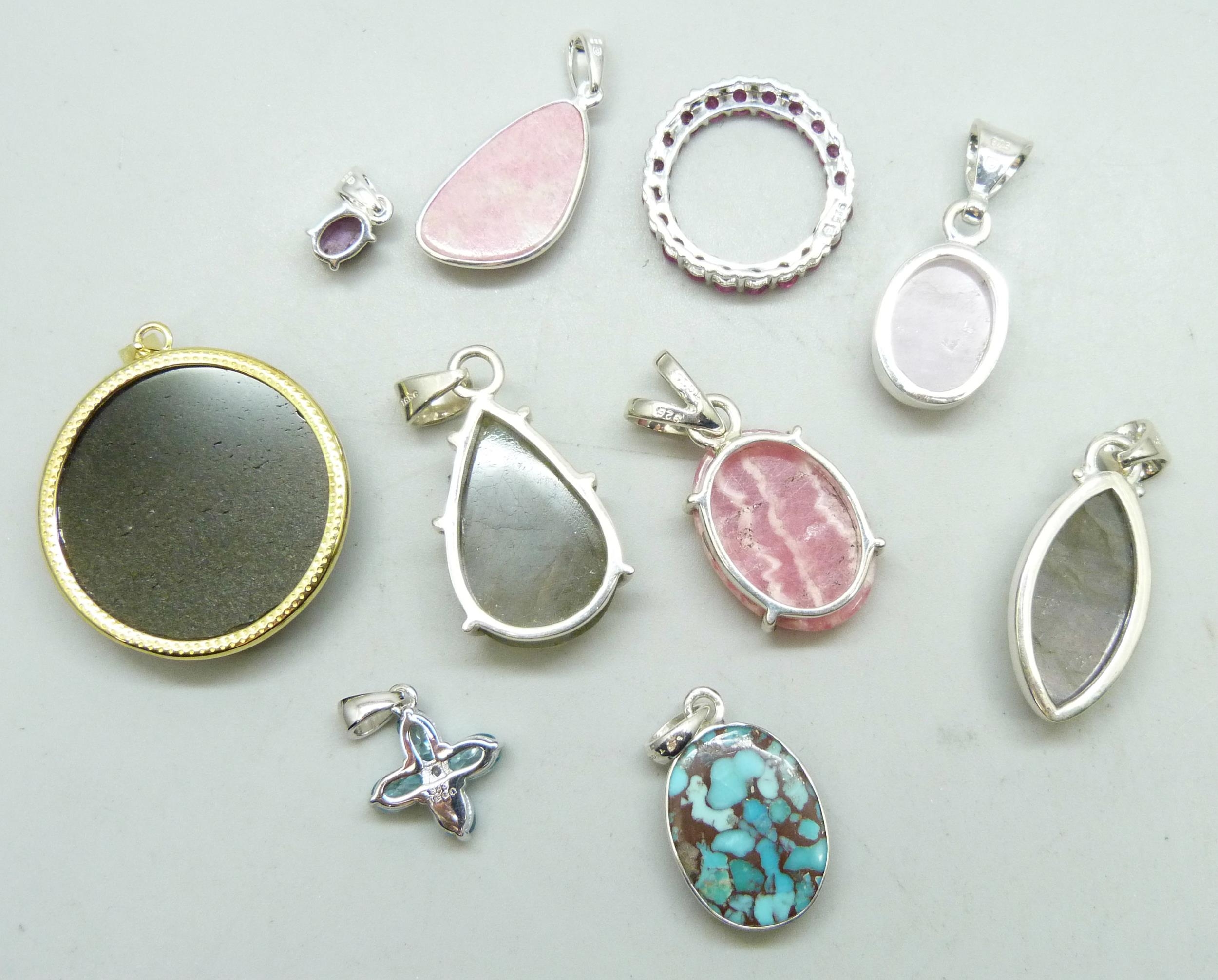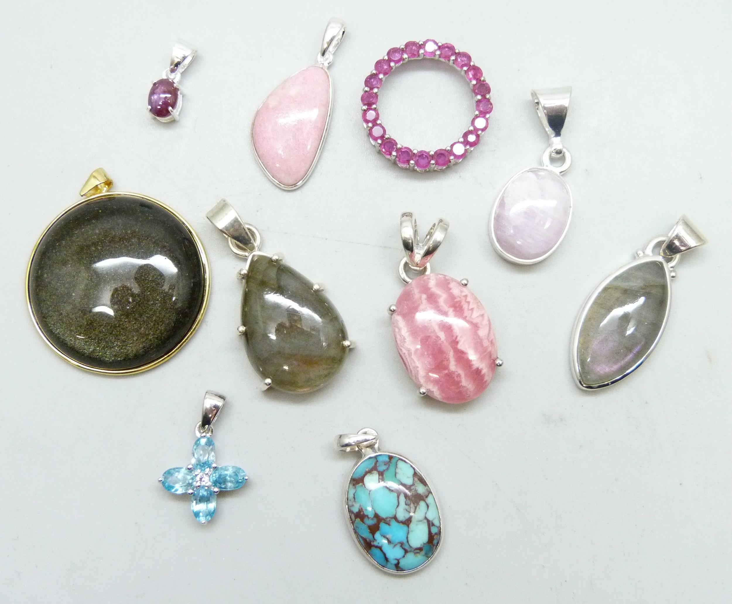 Ten sterling silver pendants set with blue zircon, labradonite, kunzite, turquoise, star ruby, ruby, thalite and moonlight obsidian