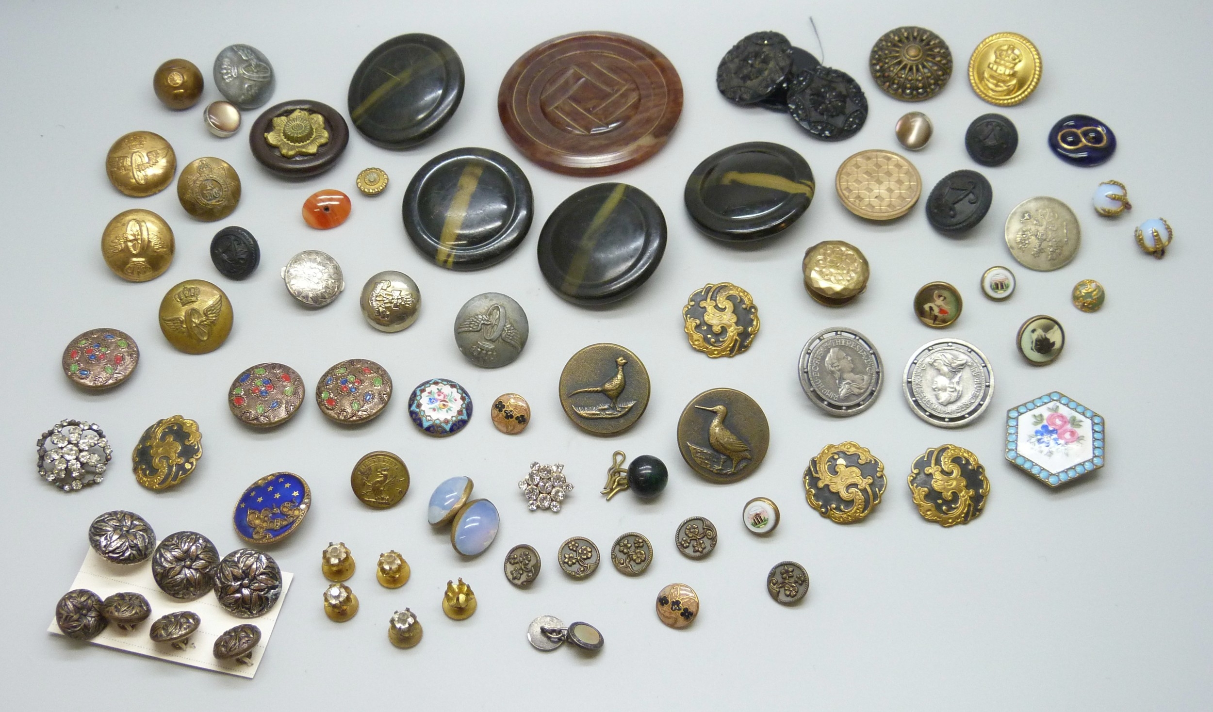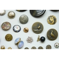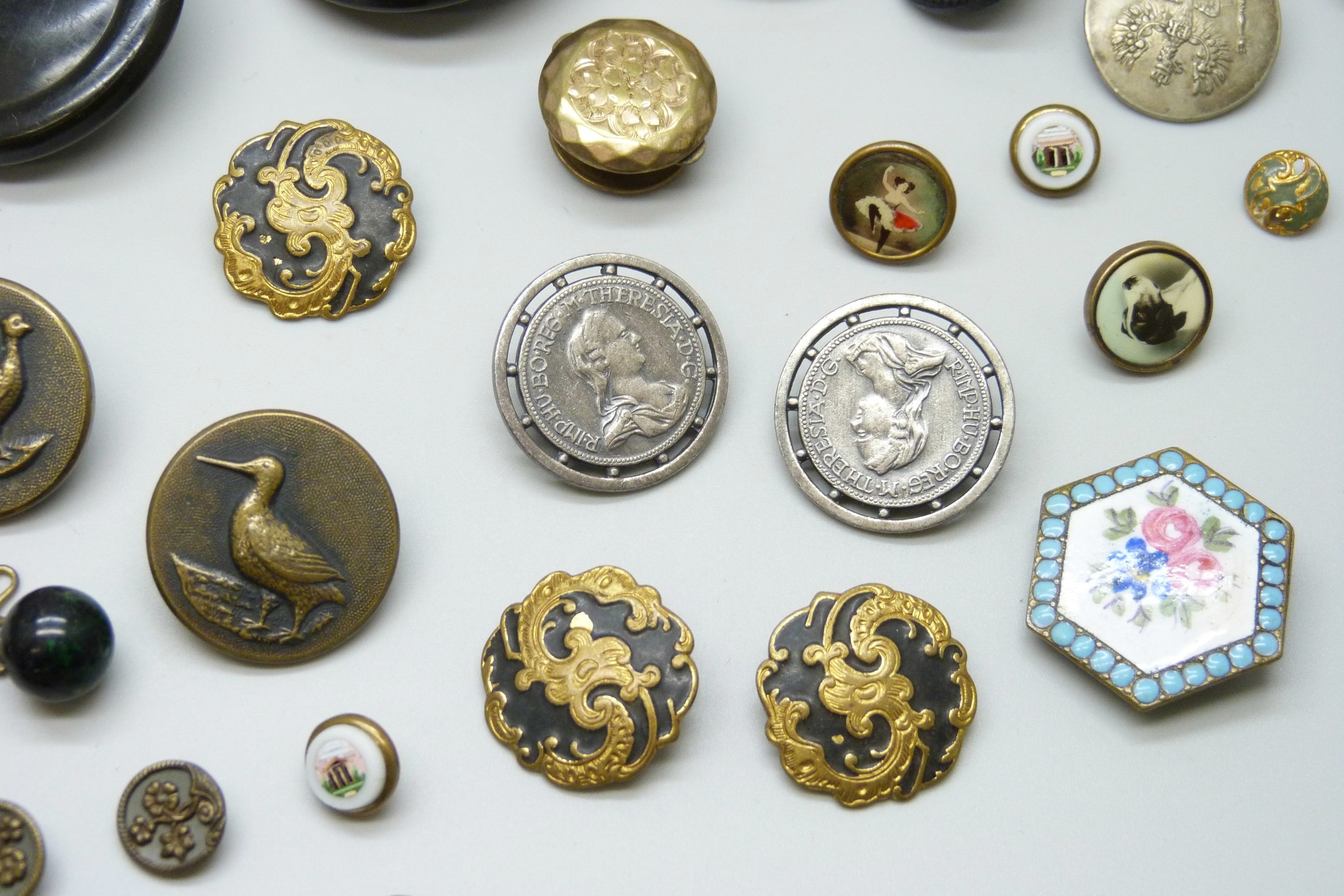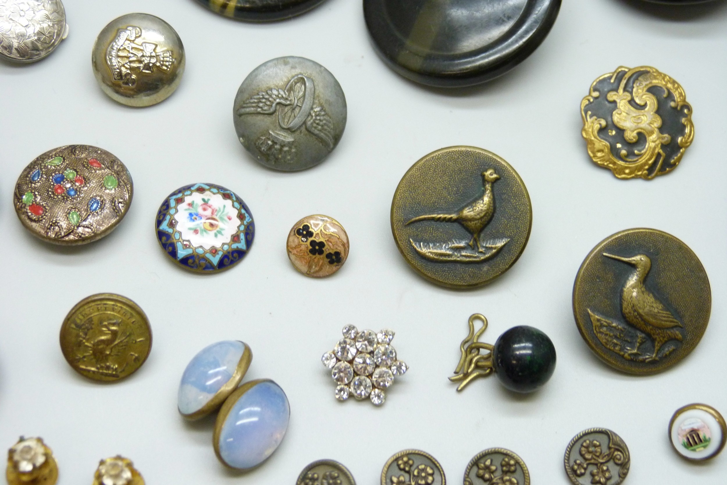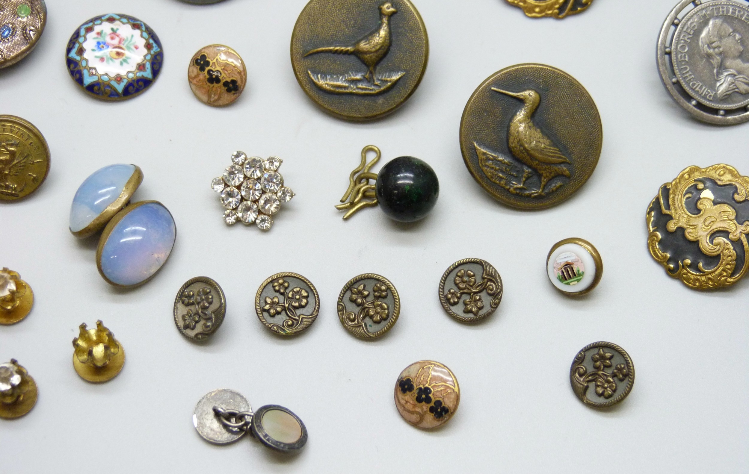 A collection of antique and later buttons, including G.T.F of Paris bird examples, micro-mosaic and enamel