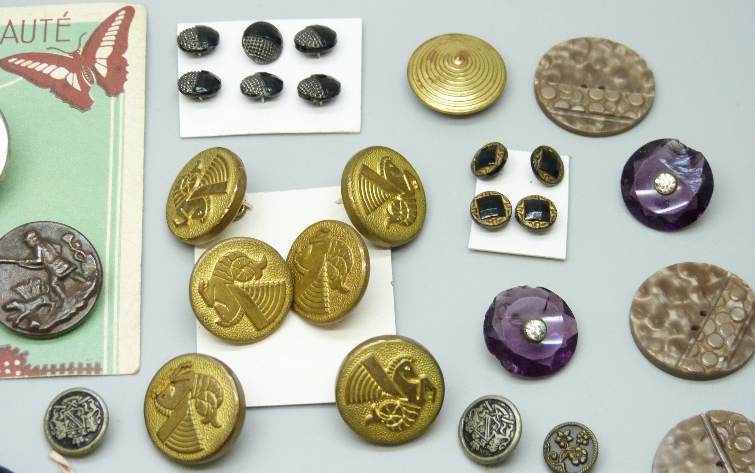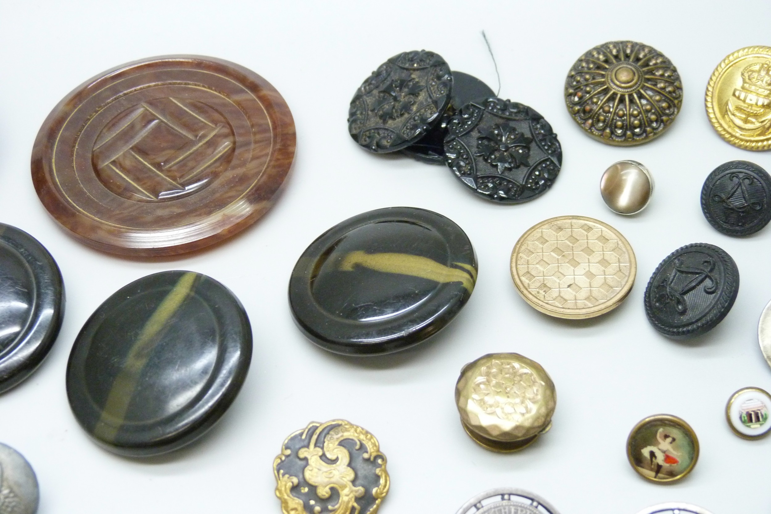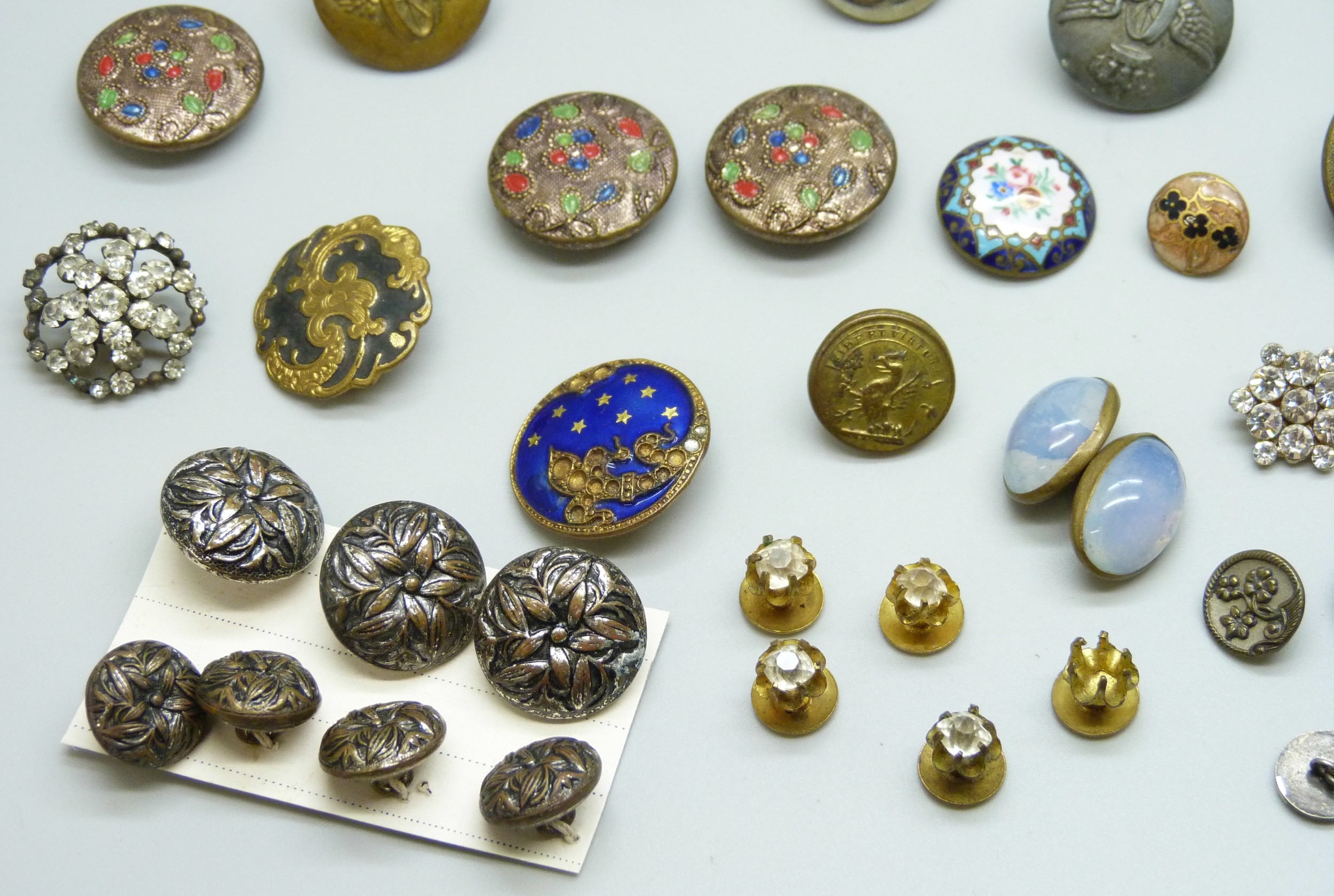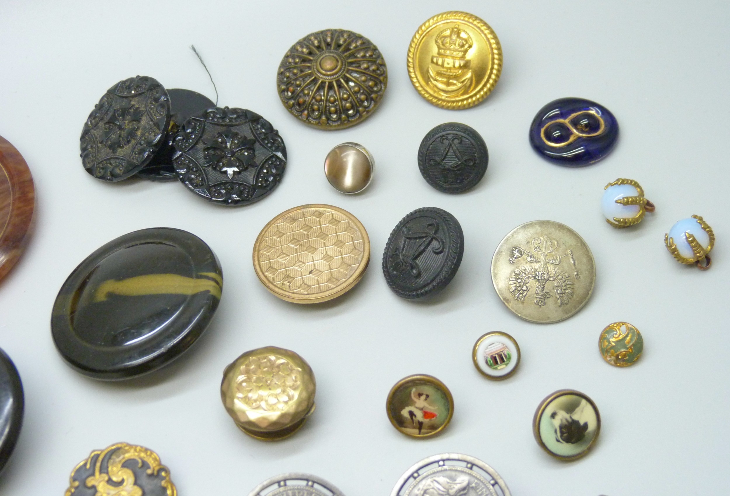 A collection of antique and later buttons, including G.T.F of Paris bird examples, micro-mosaic and enamel