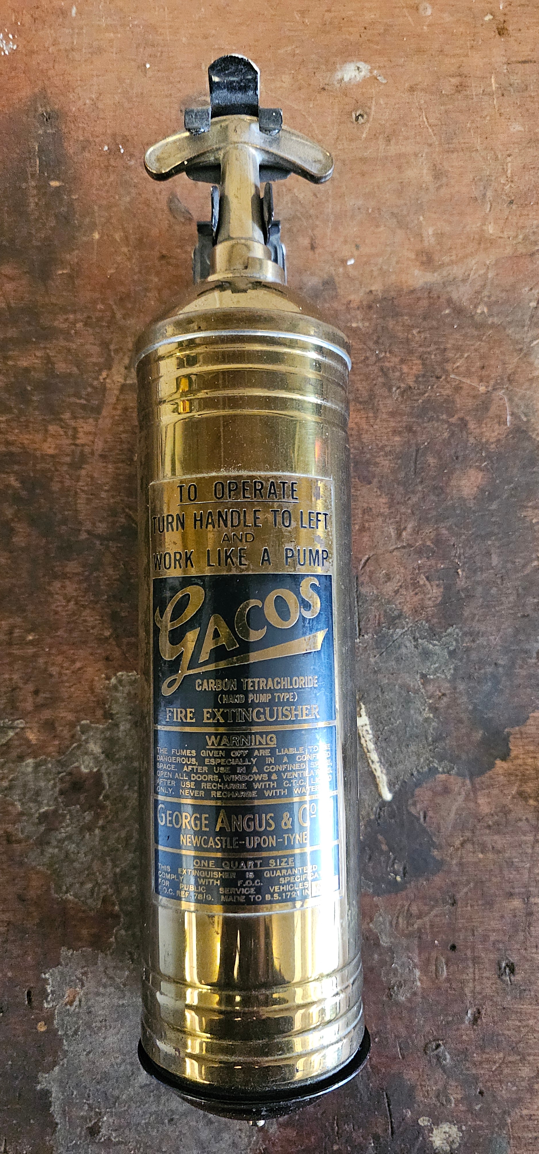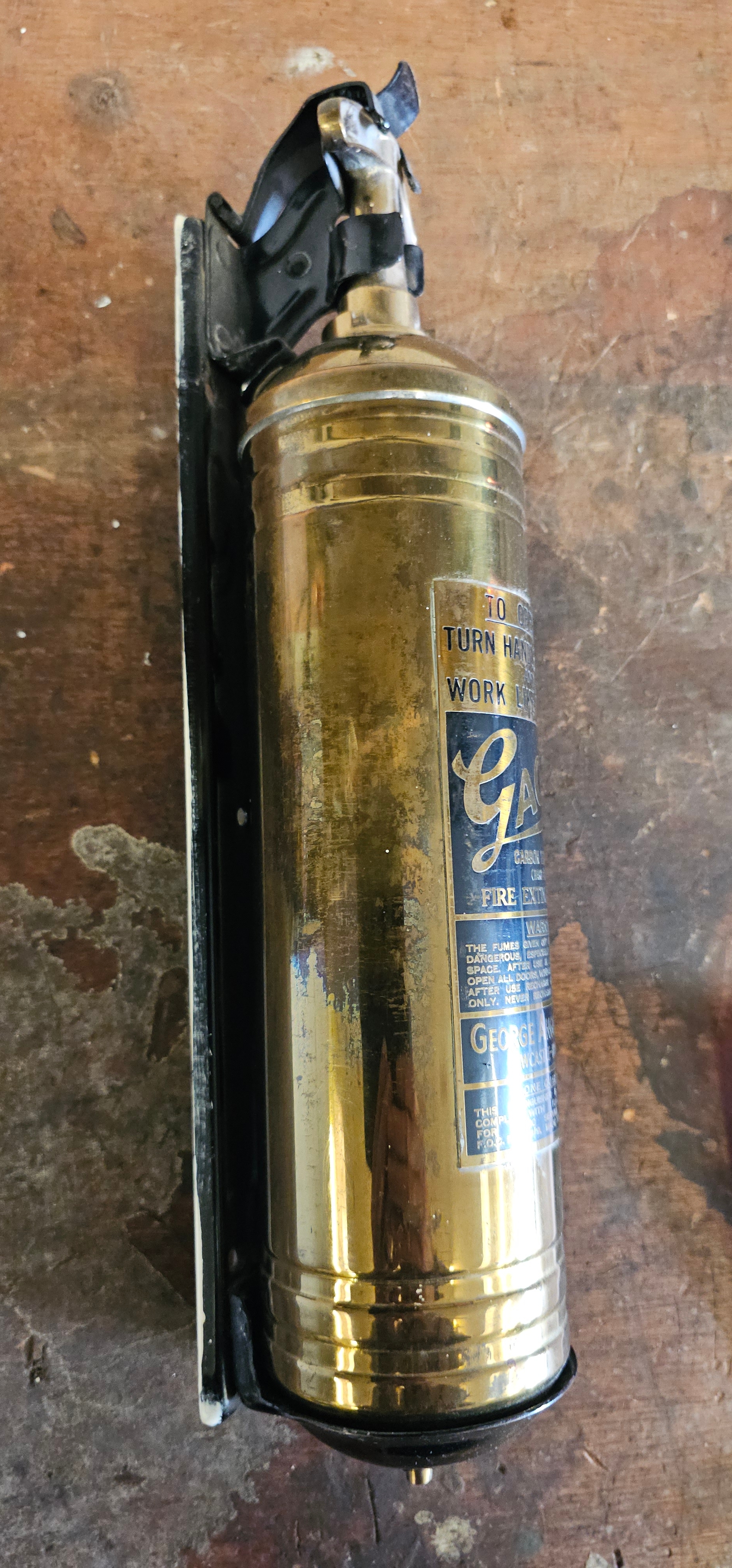 A vintage Gacus brass fire extinguisher, with bracket, in very good condition