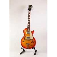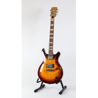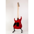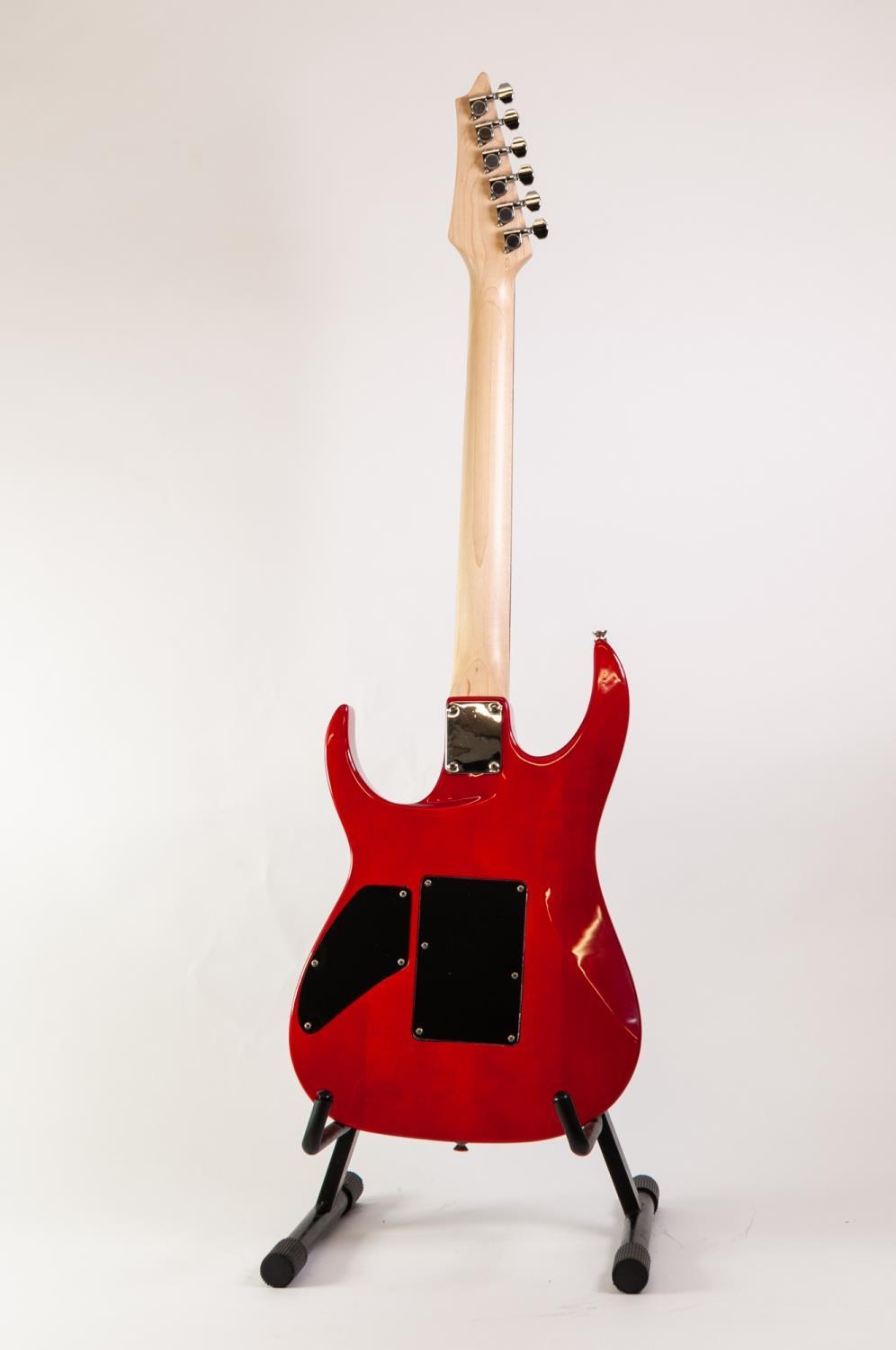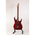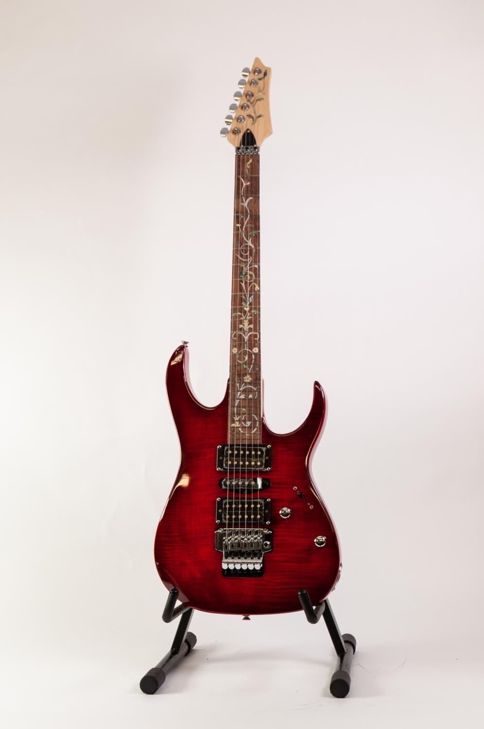 UNBRANDED SIX STRING ELECTRIC GUITAR, in red colourway, with nickel and black hardware, pick-up selector switch and two tone and volume control knobs, the fretboard and head inlaid in mother of pearl with scrolling foliage, in green plush lined faux brown leather hard case