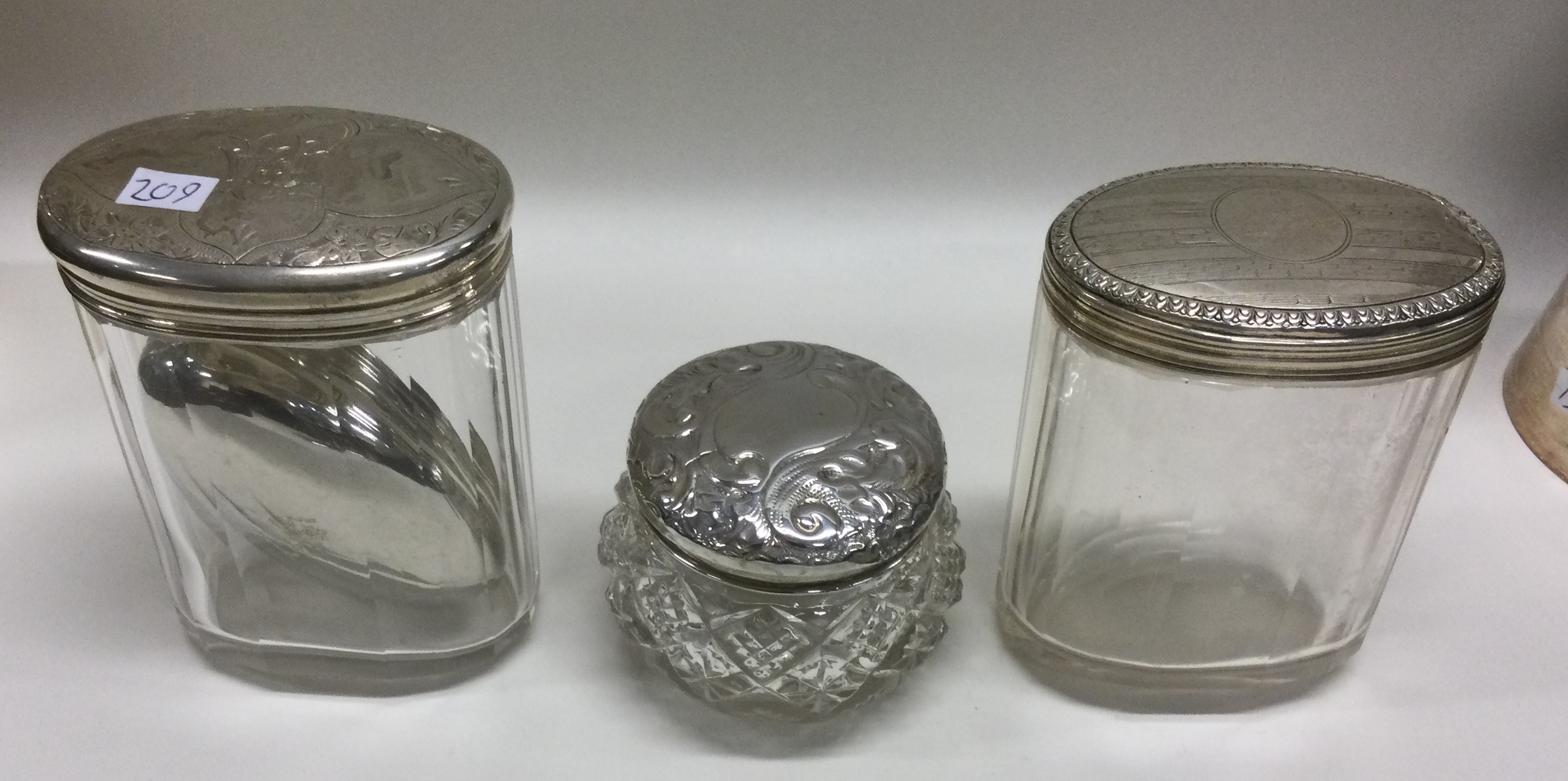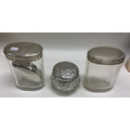 A group of silver mounted glass dressing table jars. Various dates and makers. Approx. 77 grams of weighable silver. Est. £30 - £50.