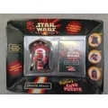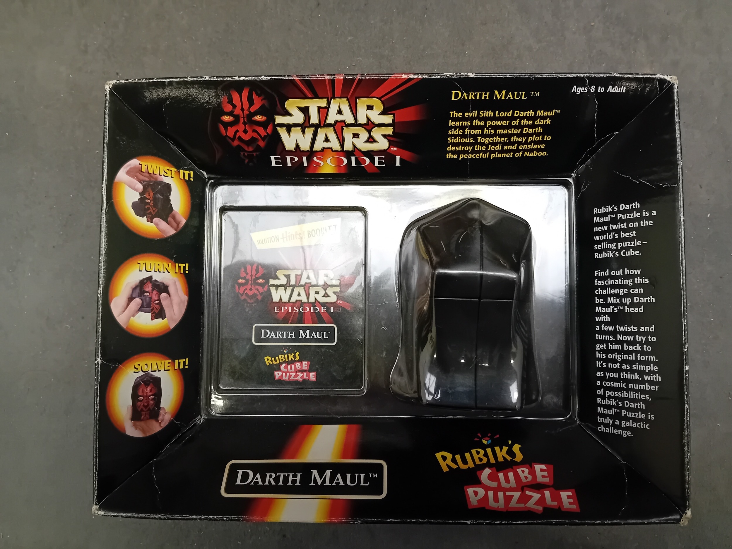 A Star Wars Episode I Darth Maul Rubik's Cube Puzzle, Special Character Edition, dating to 1999. The plastic puzzle, shaped like the character's head, is housed in its original cardboard box with a clear plastic blister window. The packaging features text including "STAR WARS EPISODE I, " "Darth Maulâ¢, " "Rubik's Cube Puzzle, " "A New Twist on the World's #1 Puzzle!", and mentions a "SOLUTION HINTS BOOKLET." The reverse of the box provides character background, puzzle instructions ("Twist it! Turn it! Solve it!"), and details about the challenge, along with "Ages 8 to Adult." The item appears new and undisturbed within its packaging.