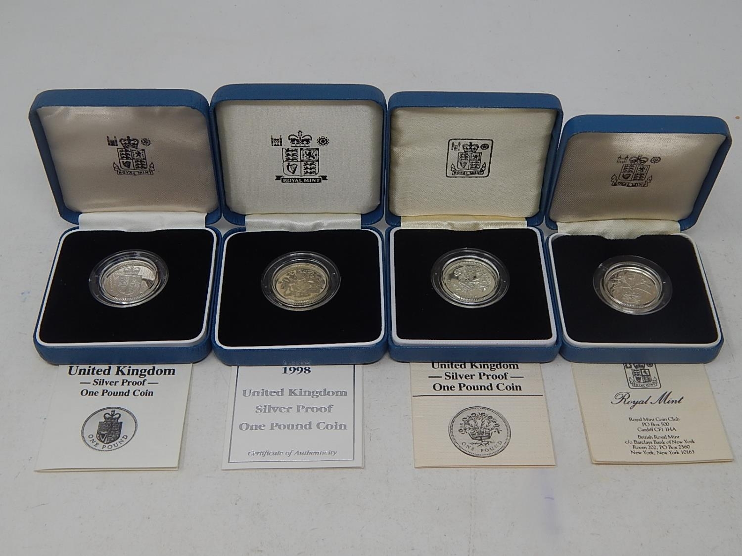 Silver Proof Pounds 1984, 1986, 1988, 1998 in Royal Mint cases of issue with COAs all about as struck