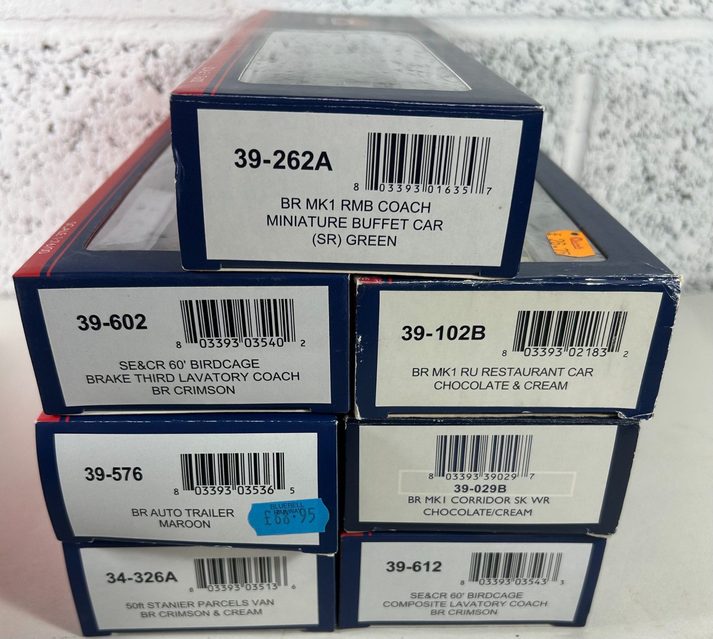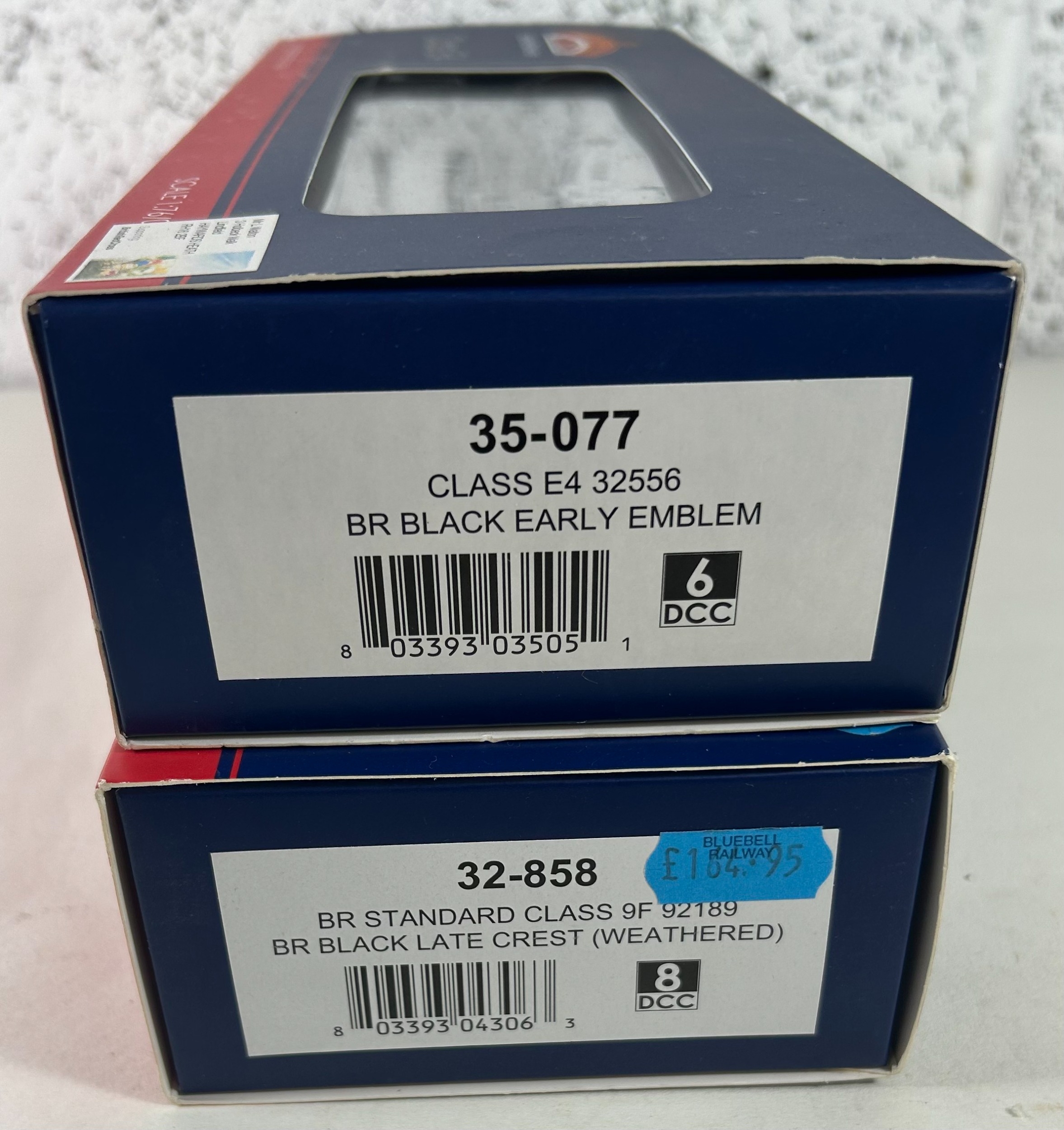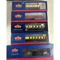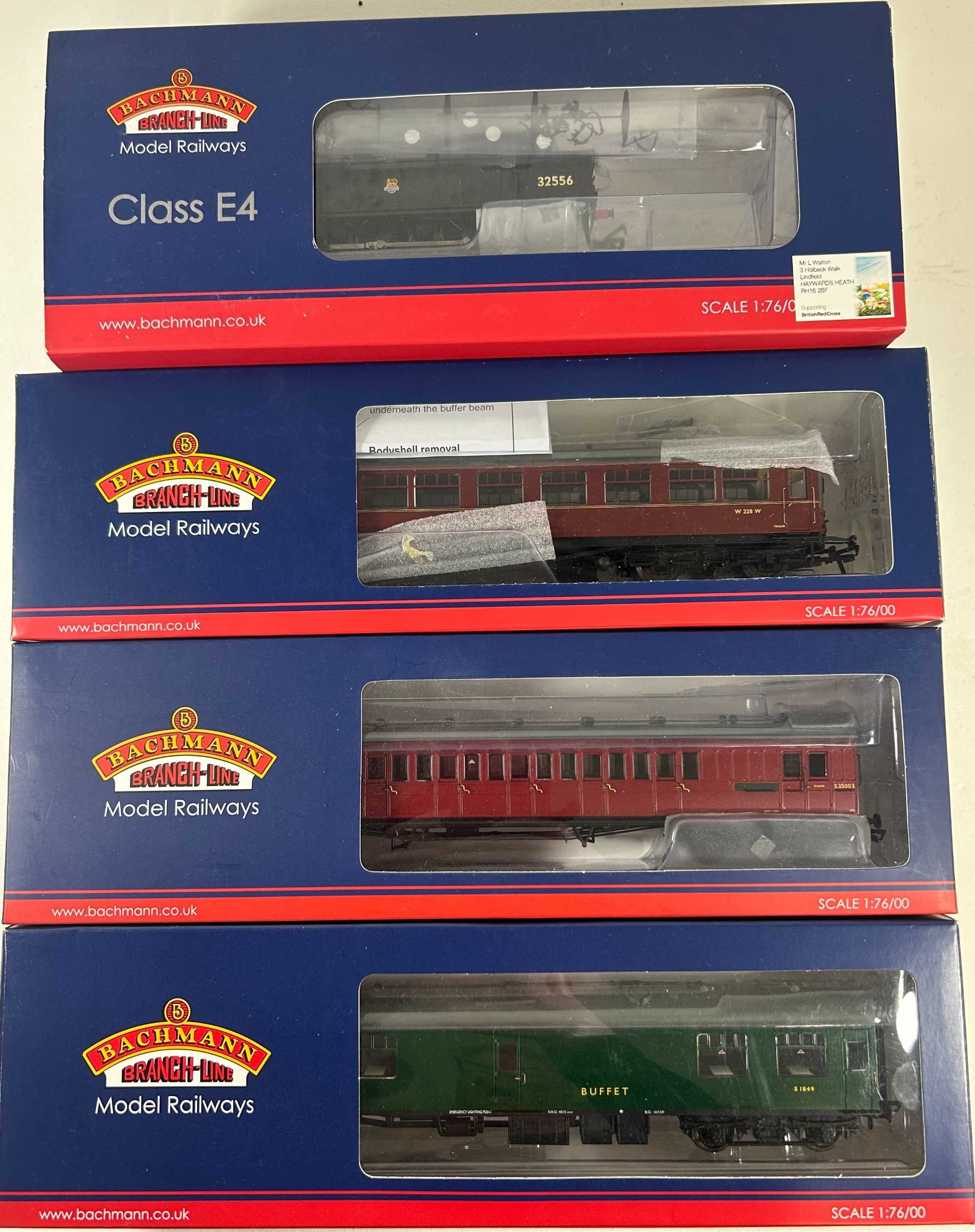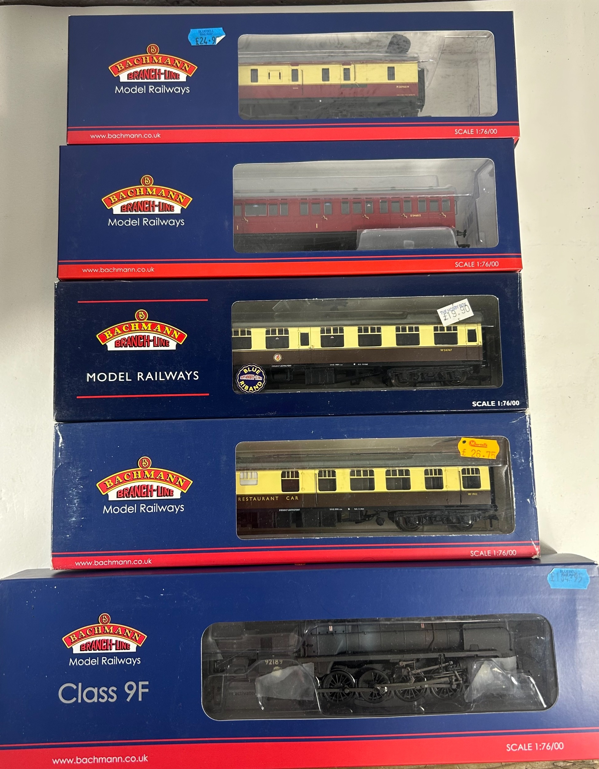 Bachmann Branch-Line OO Railway. 2x Steam Locomotives. A BR Standard Class 9F 2-10-0 Tender Locomotive 92189 (32-858). In BR black livery, with late crest, weathered. Plus a BR Ex LBSCR Class E4 0-6-2 Tank, 32556 (35-077) in BR black with early crest. Together with 7 passenger coaches - 2x BR Mk1 (WR) including a Restaurant Car. 2x SE & CR Bird Cage Lavatory Coaches, including a brake. A BR MK1 Miniature Buffet Car (SR). A 50Ft Stanier Parcels Van and a BR Auto Trailer. All boxed. Contents looks to be as new. (9).