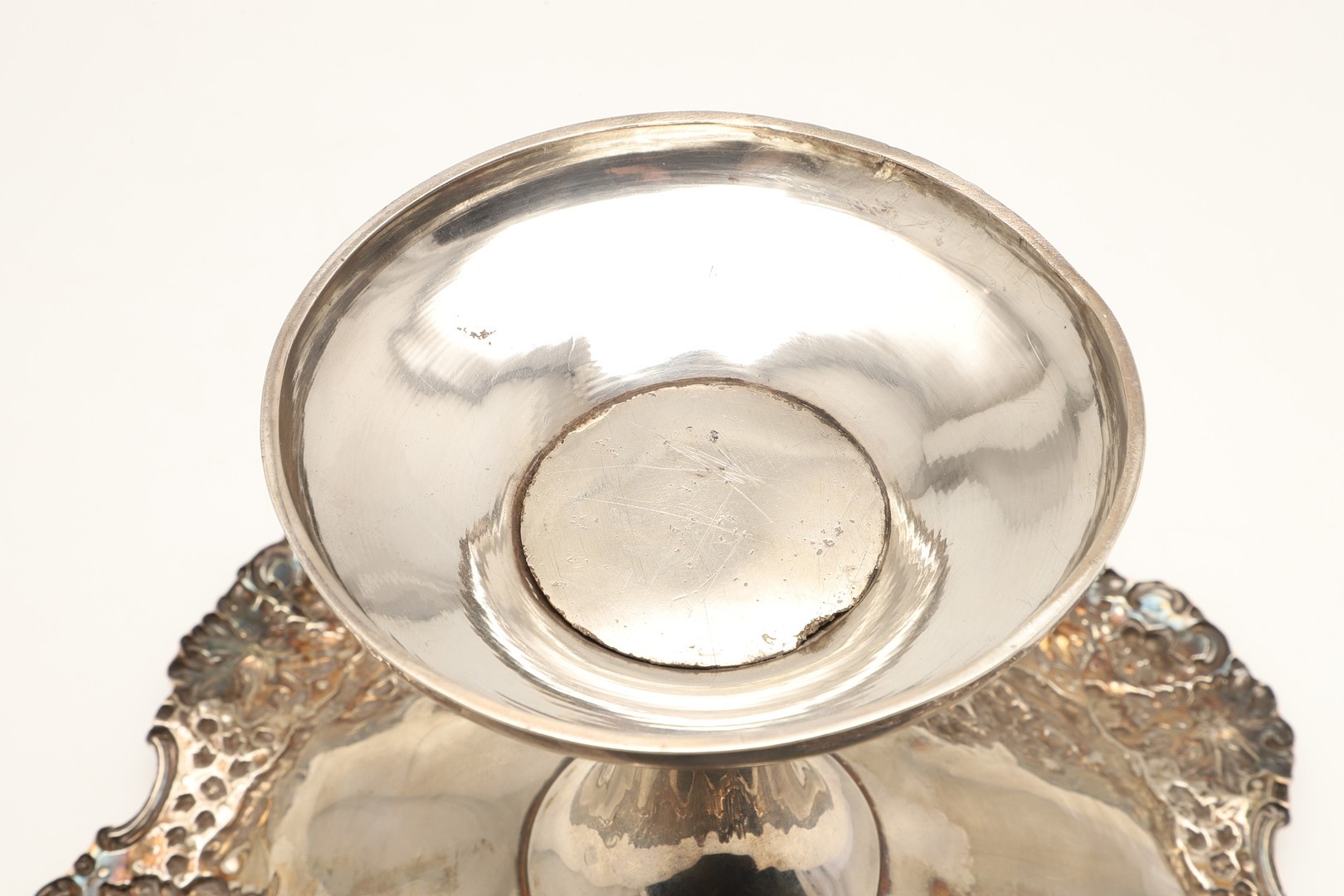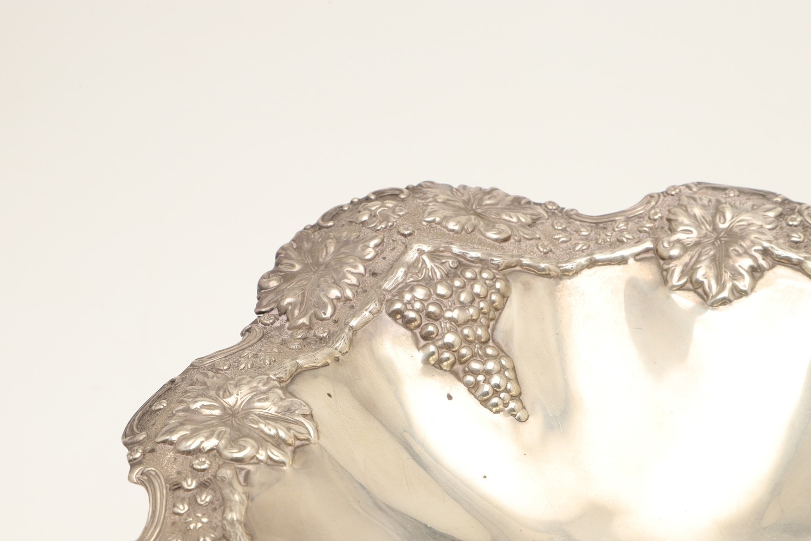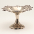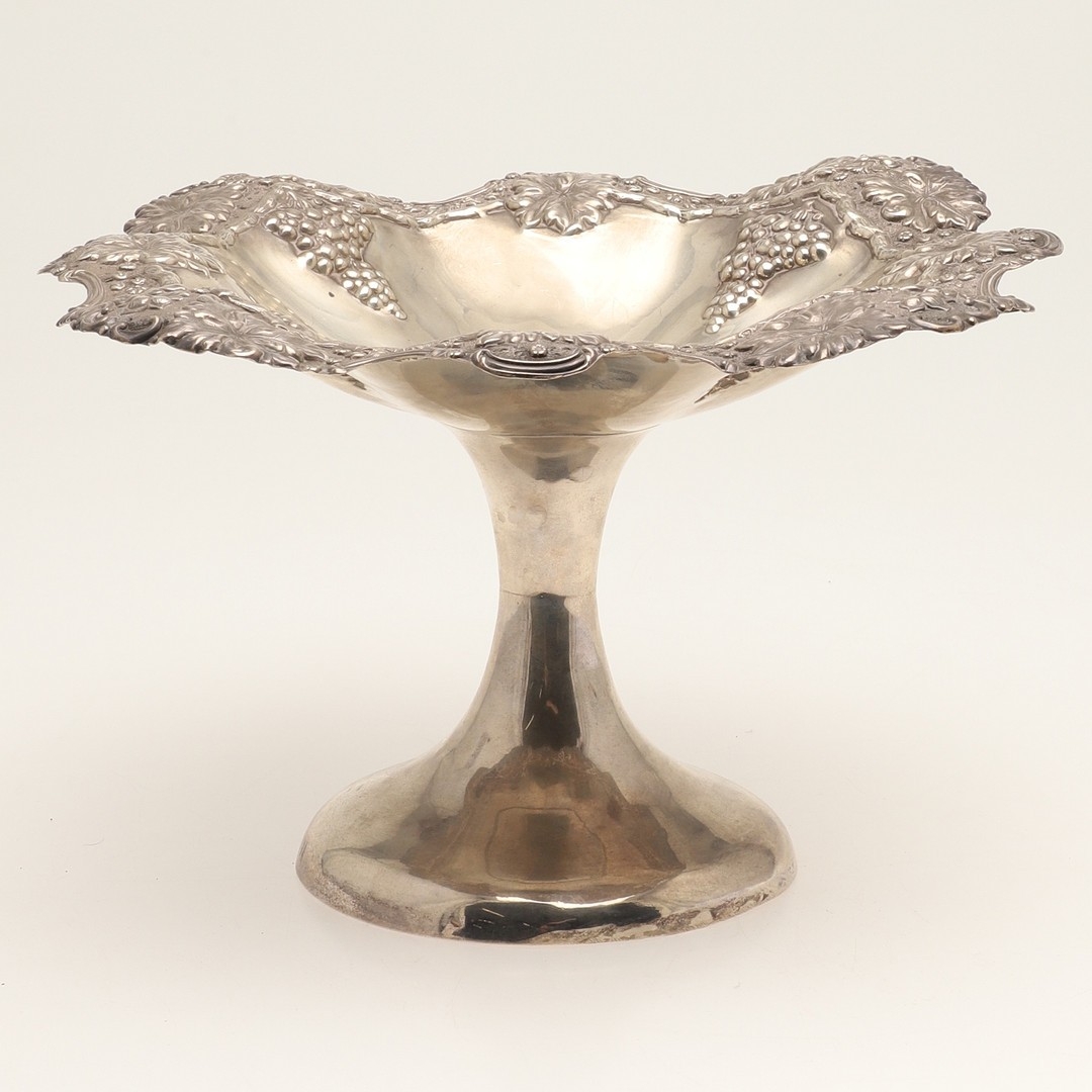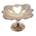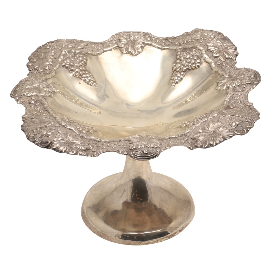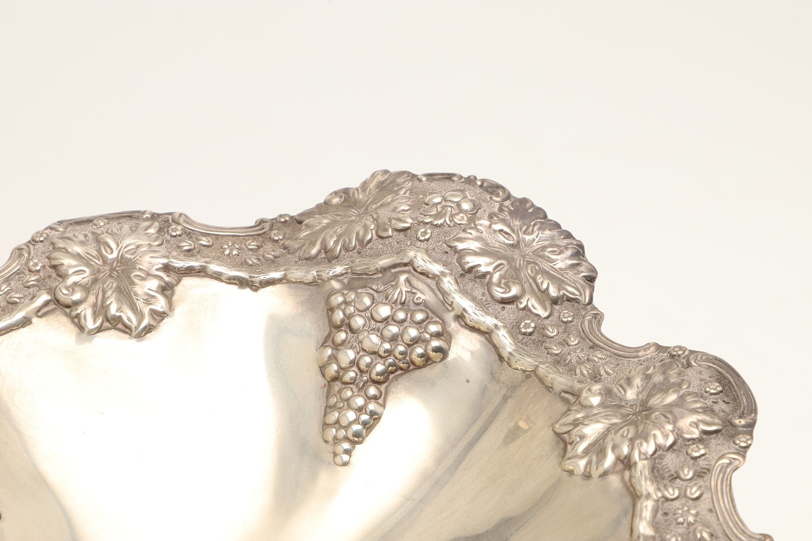 AN EARLY EDWARDIAN SILVER TAZZA. With heavily embossed grape vine decoration, on a rounded base. Height 17cm x Diameter 29cm. Hallmarked Jones & Crompton, Birmingham, 1902. Weight 21ozt.