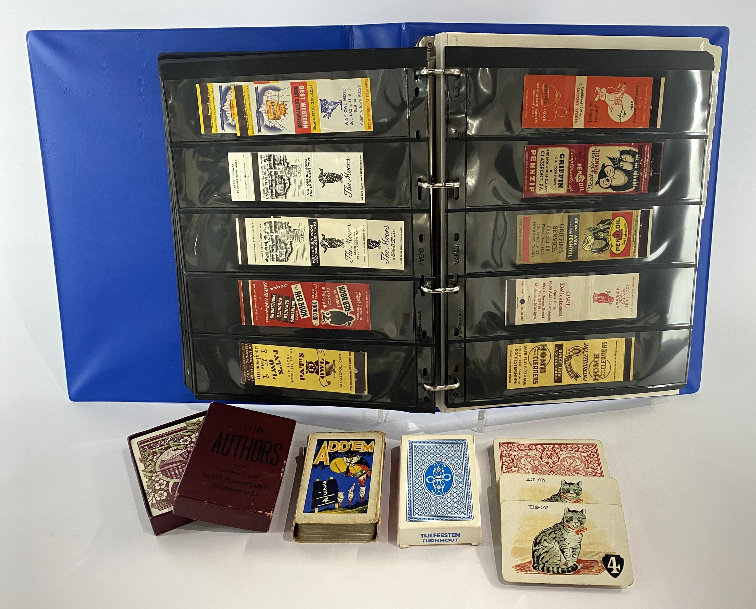 Ephemera and Cinderella Stamps: An interesting collection of owl and ornithological themed cinderella stamps, matchbook covers and promotional labels, late 19th to late 20th century, cinderella stamps including; 1913 Budapest Exhibition, West Jersey Trust Co., K. Dahl & Co Stockholm, J. Walter Thompson, Owl Cigars; matchbook covers including Zenith Radio, The Owl, Owl Cafe Laurel Mont., together with four packs of playing cards, The Game of Authors, Fours, Add'Em and Turnhout (one album and cards)