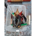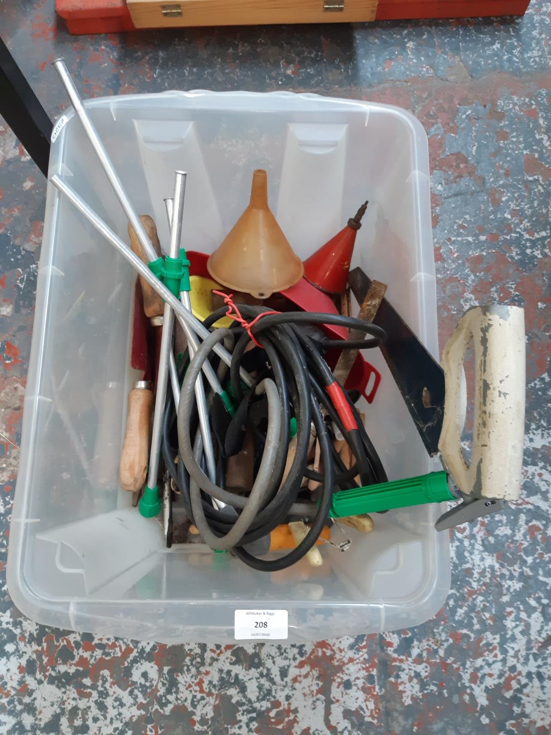 A BOX CONTAINING VARIOUS ITEMS TO INCLUDE ECLIPSE HANDSAW, WOODEN SHAFTED HAMMER, VINTAGE OIL CAN, SMALL GARDENING TOOLS ETC.